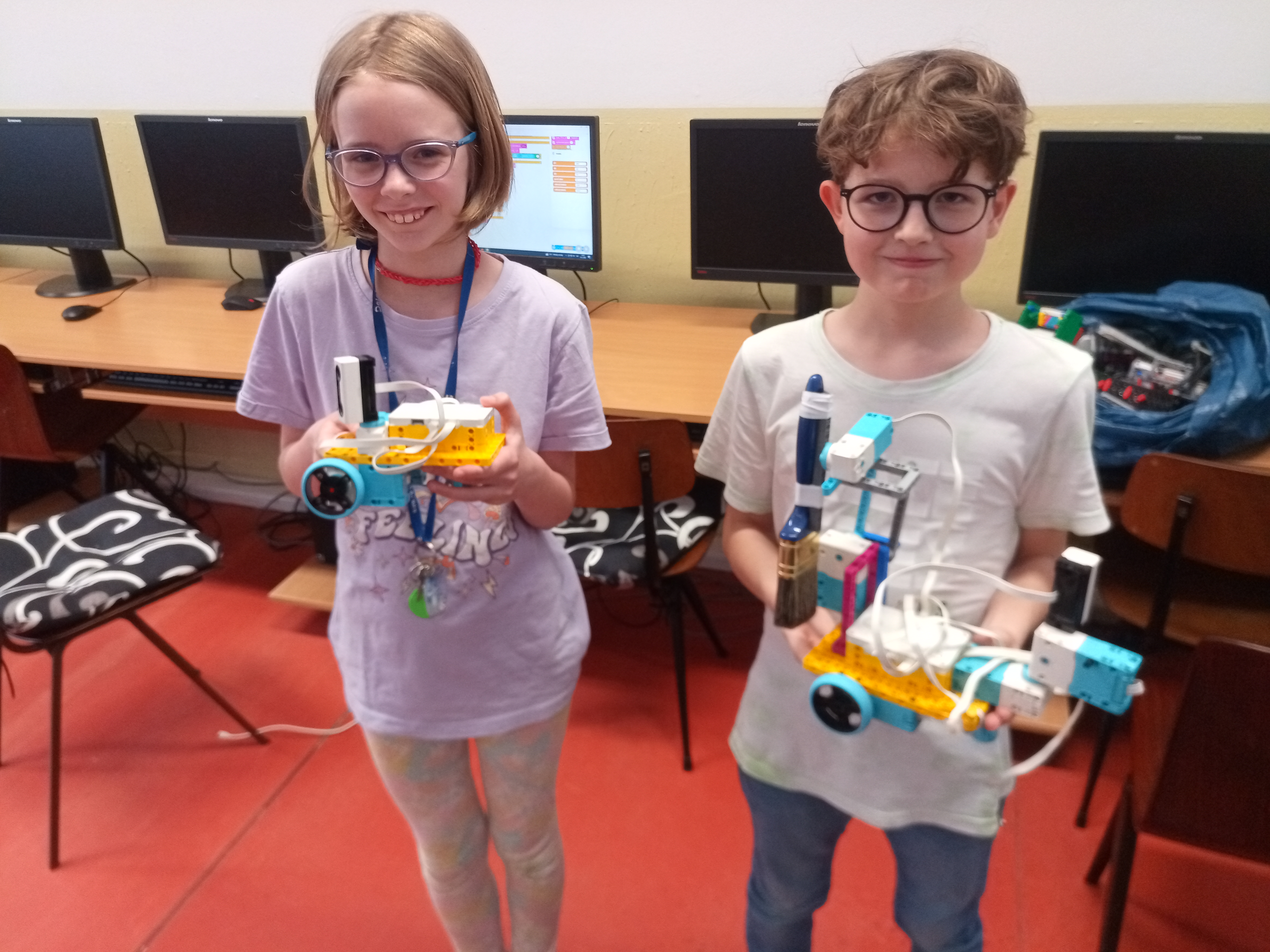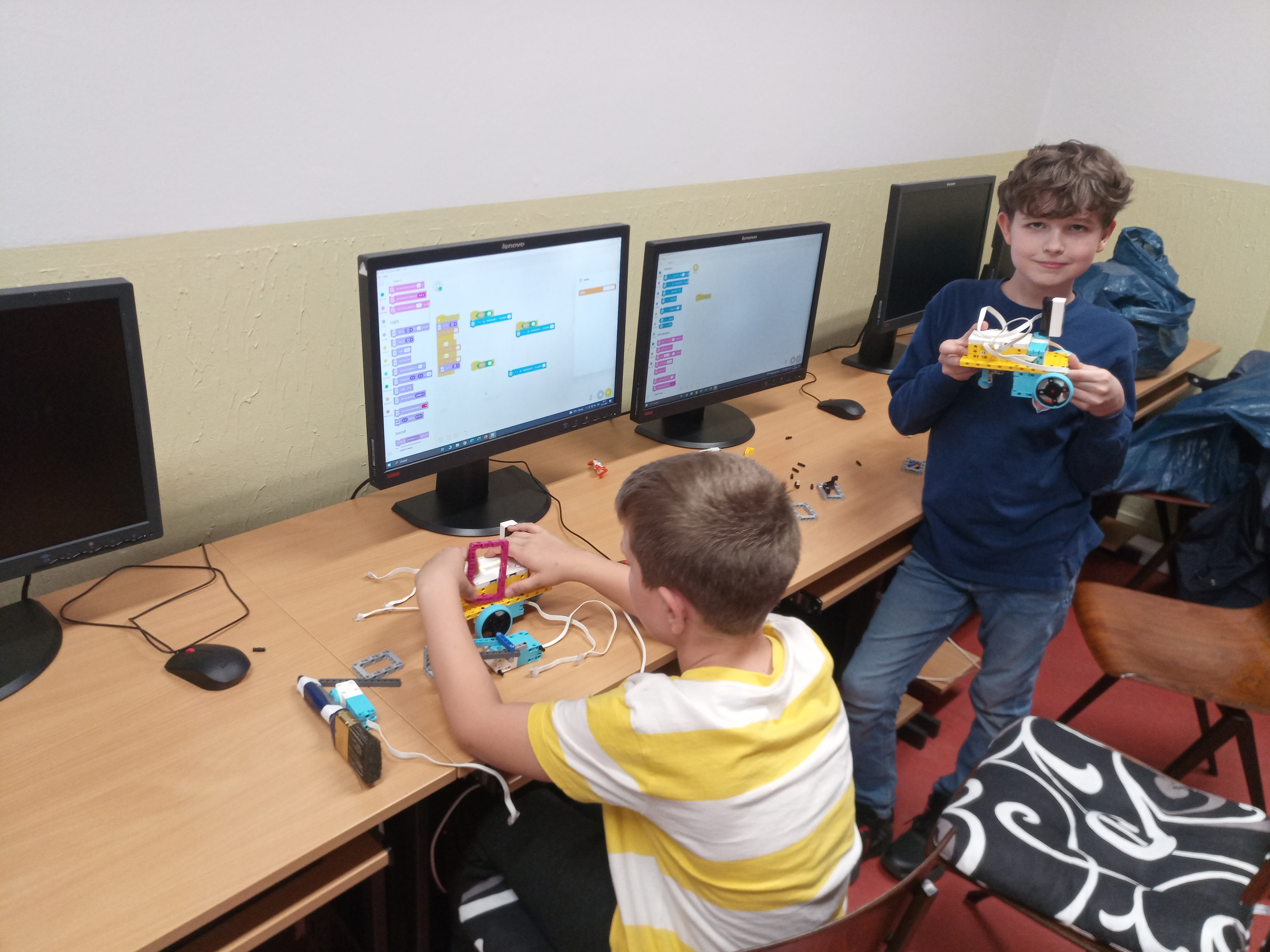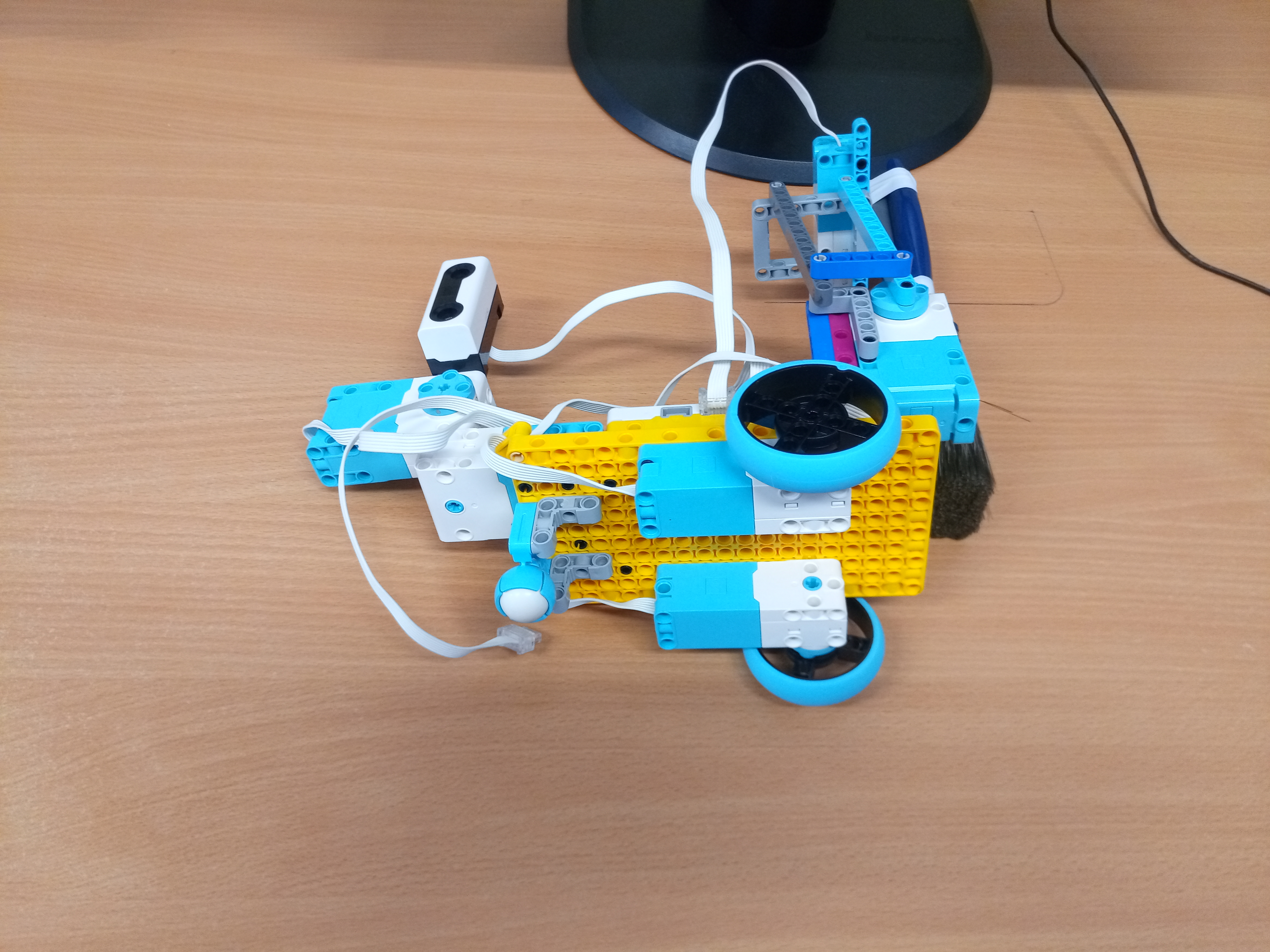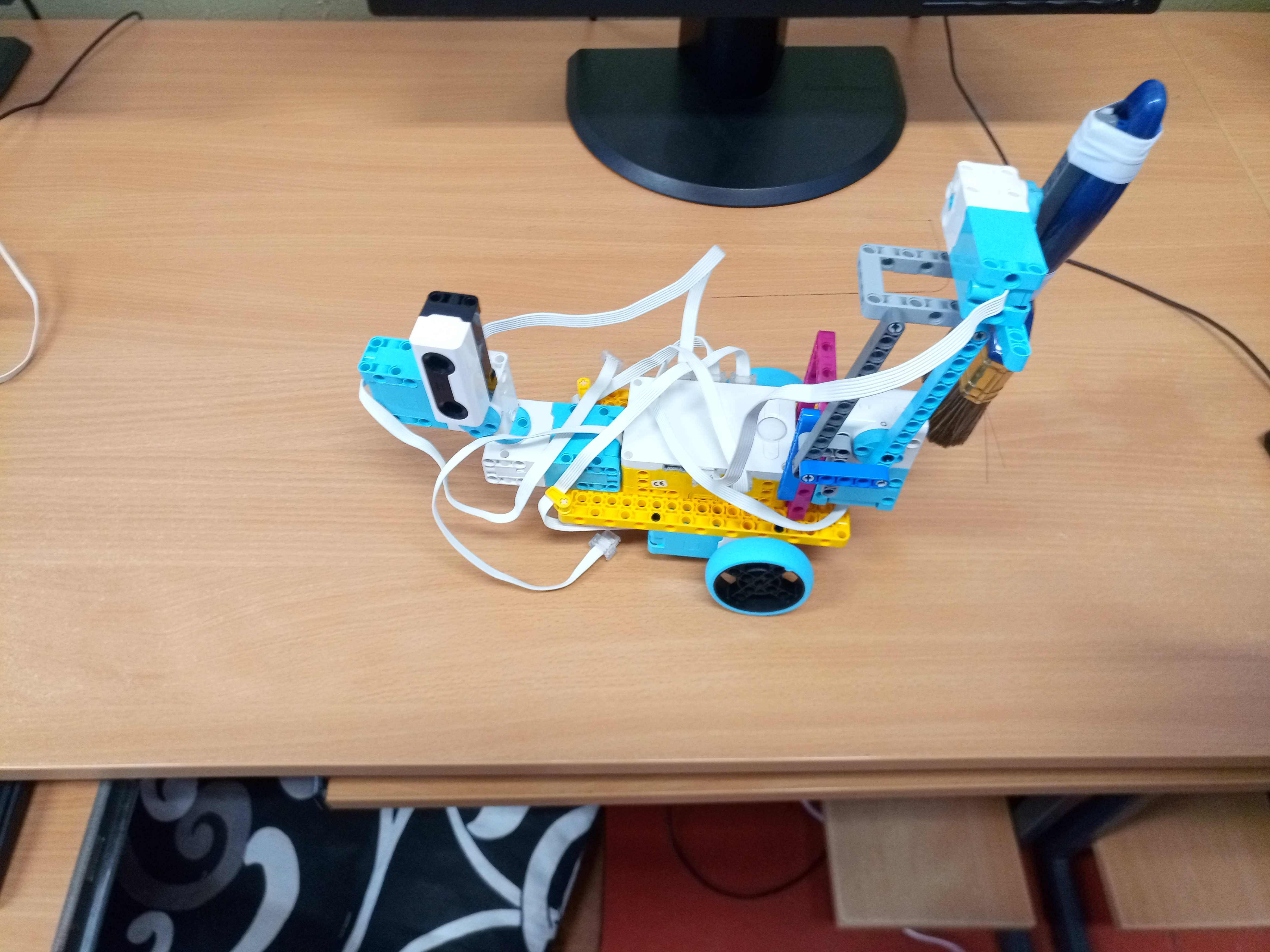 Náš robot sa skladá z kocky SPIKE a 5 motorov a ultrasenzora. Dva motory má na pohyb robota. Jeden má na pohyb senzora, aby vedel, kde je a ako ďaleko od steny. Ďaľšie dva motory sú na pohyb štetca. Jeden motor robil pohyb hore dolu a druhý otáčel smer štetca. tak sme vedeli štetec aj namáčať, aj posúvať po stene vo všelijajých výškach. Ale tie motory sú strašne slabé. Oni síce vpohode zdvihnú štetec, ale potom sa zrazu po cvíľočke vypnú, a on padne. A tak sme skúšali všeličo, ale motory sa nám furt vypínali. Možno, keby sme tú páku od motora vyvážili na druhu stranu závažím, tak by nám ten štetec nepadal. Tréner nám ešte poradil použiť šnek, ale to sme už nestihli.