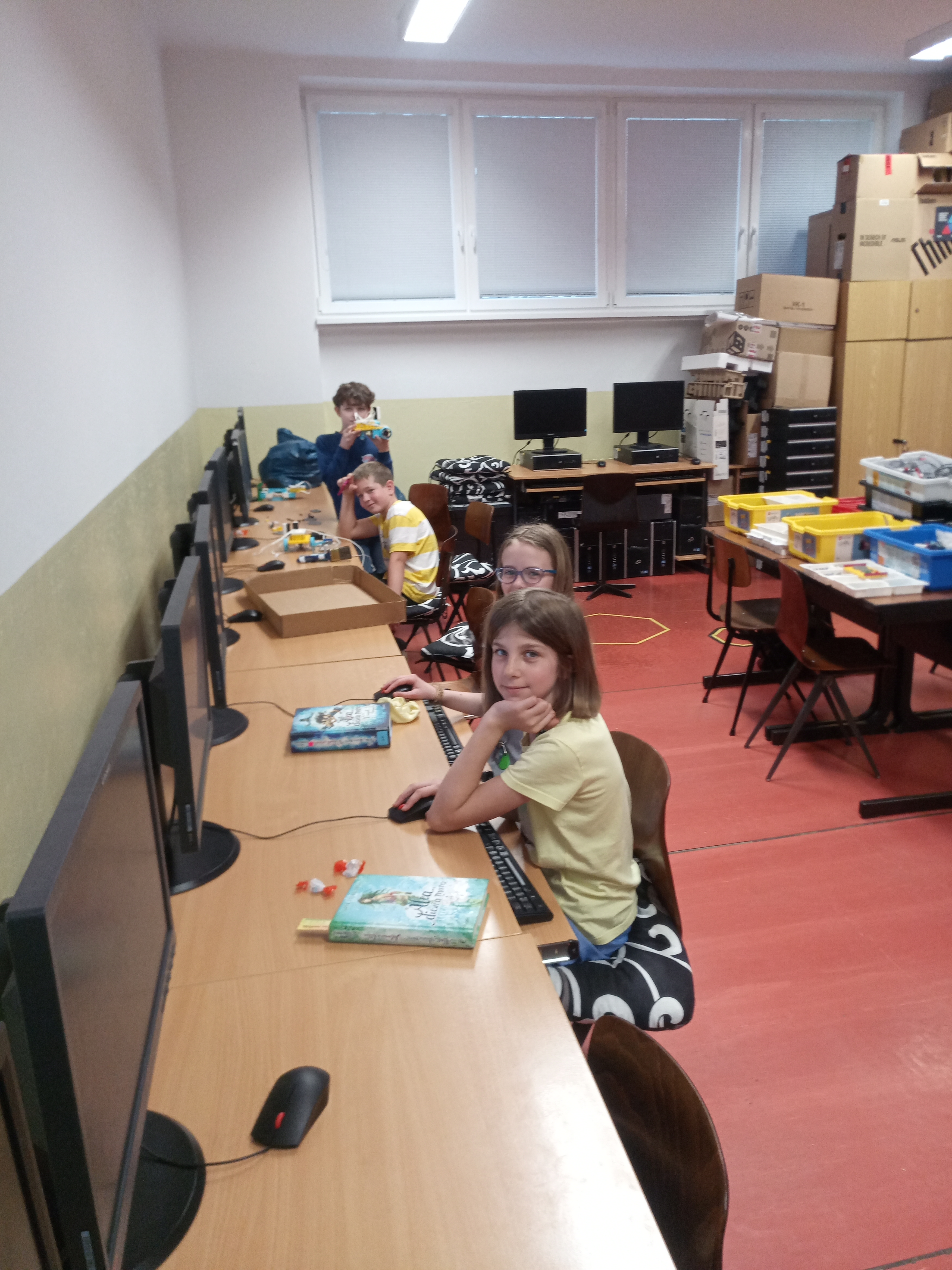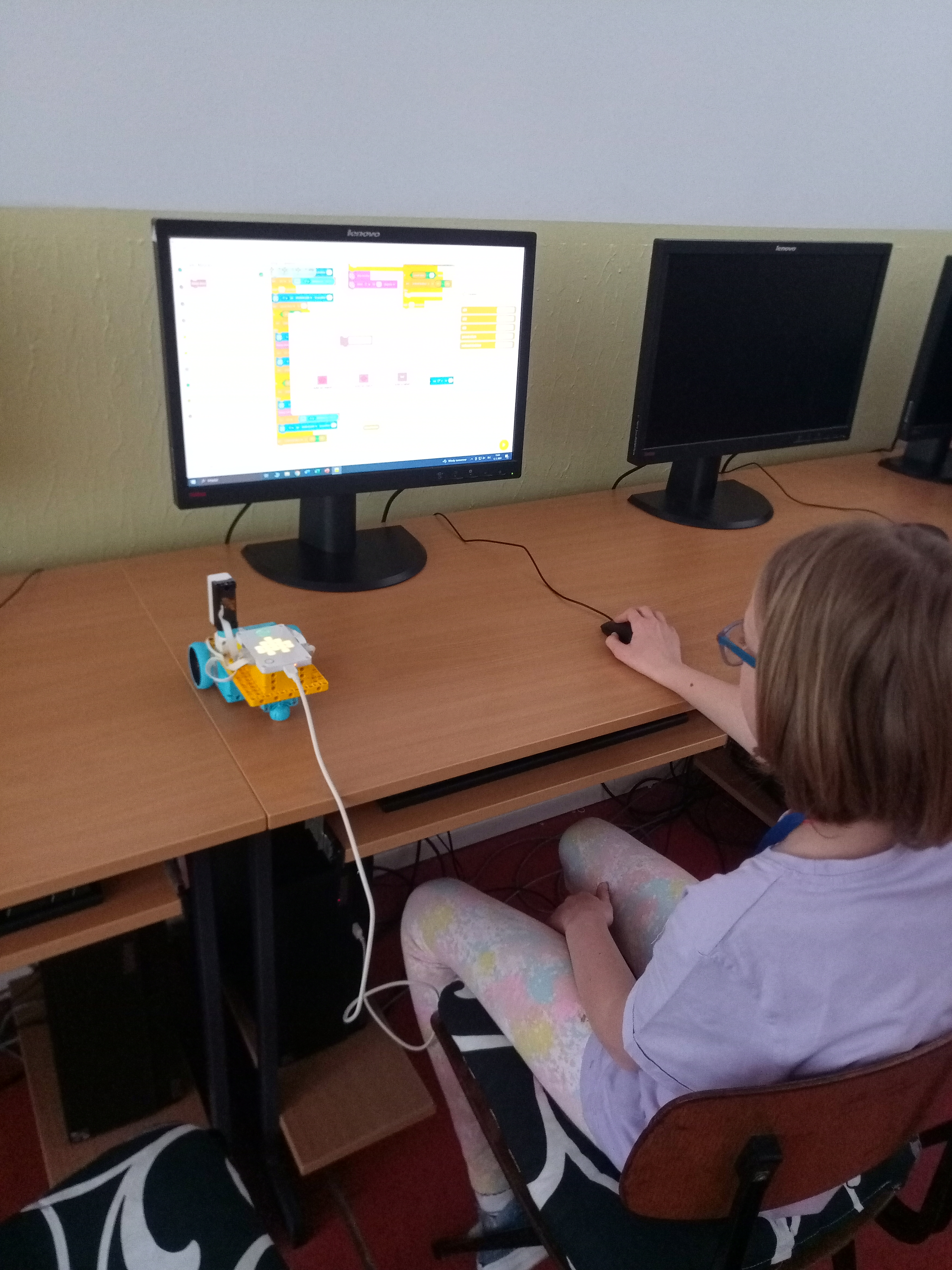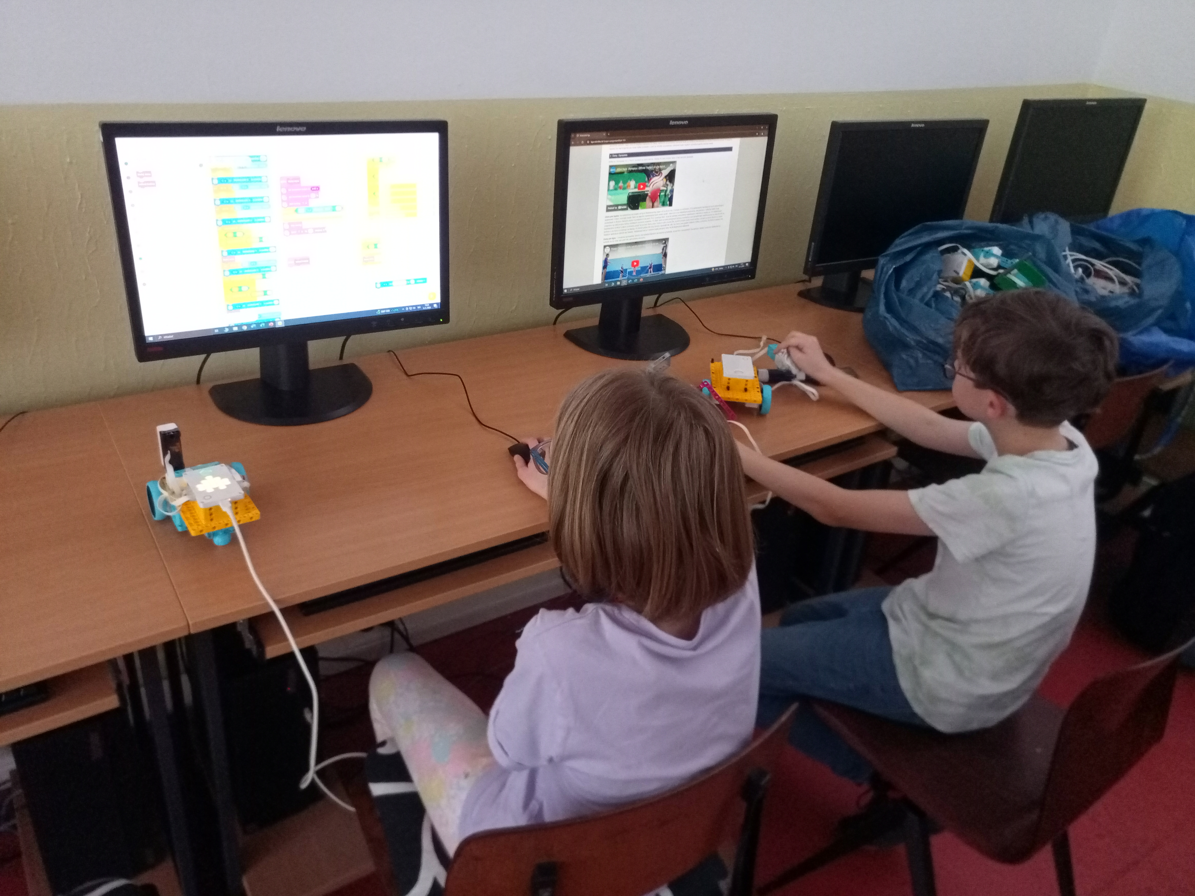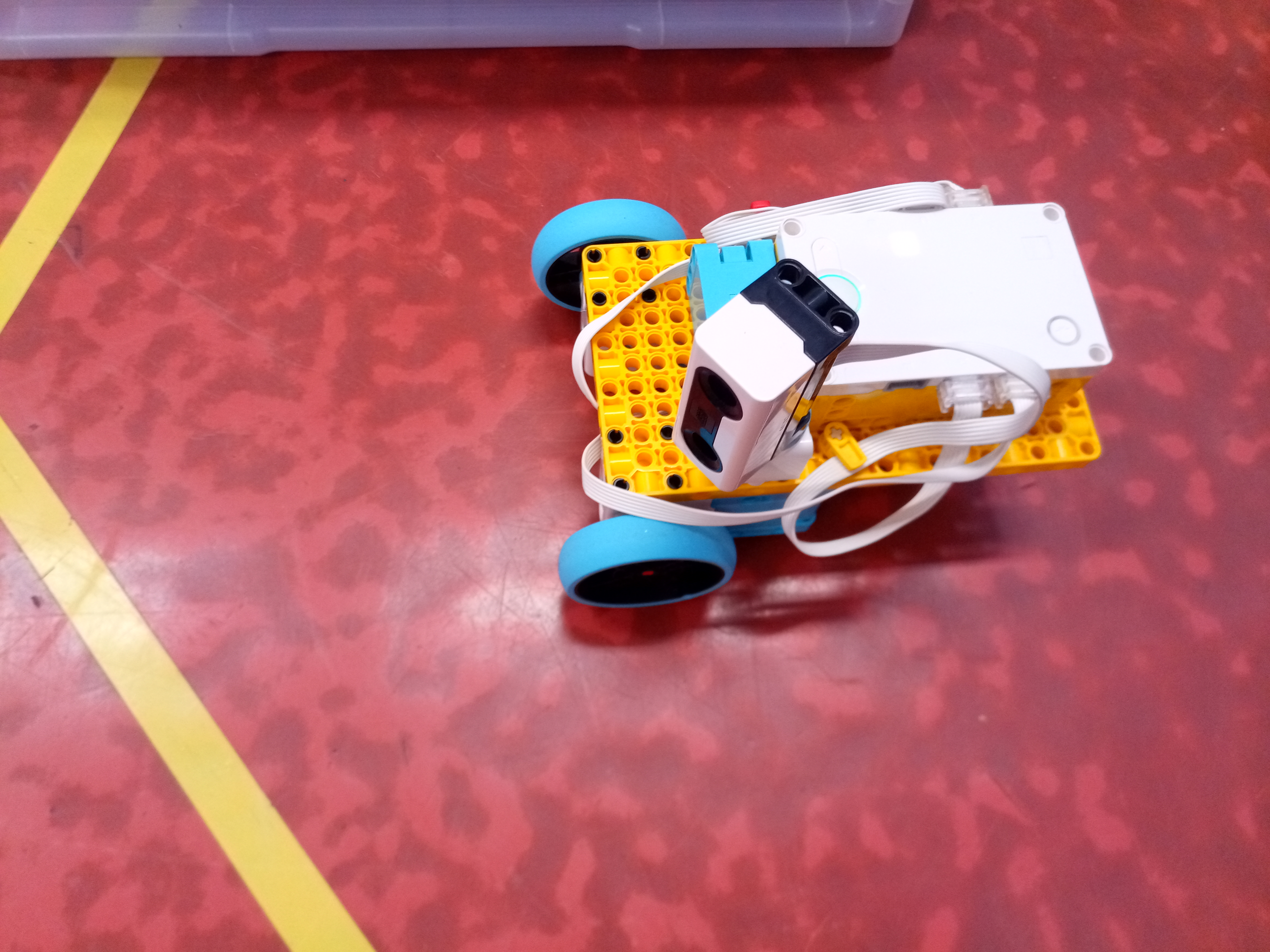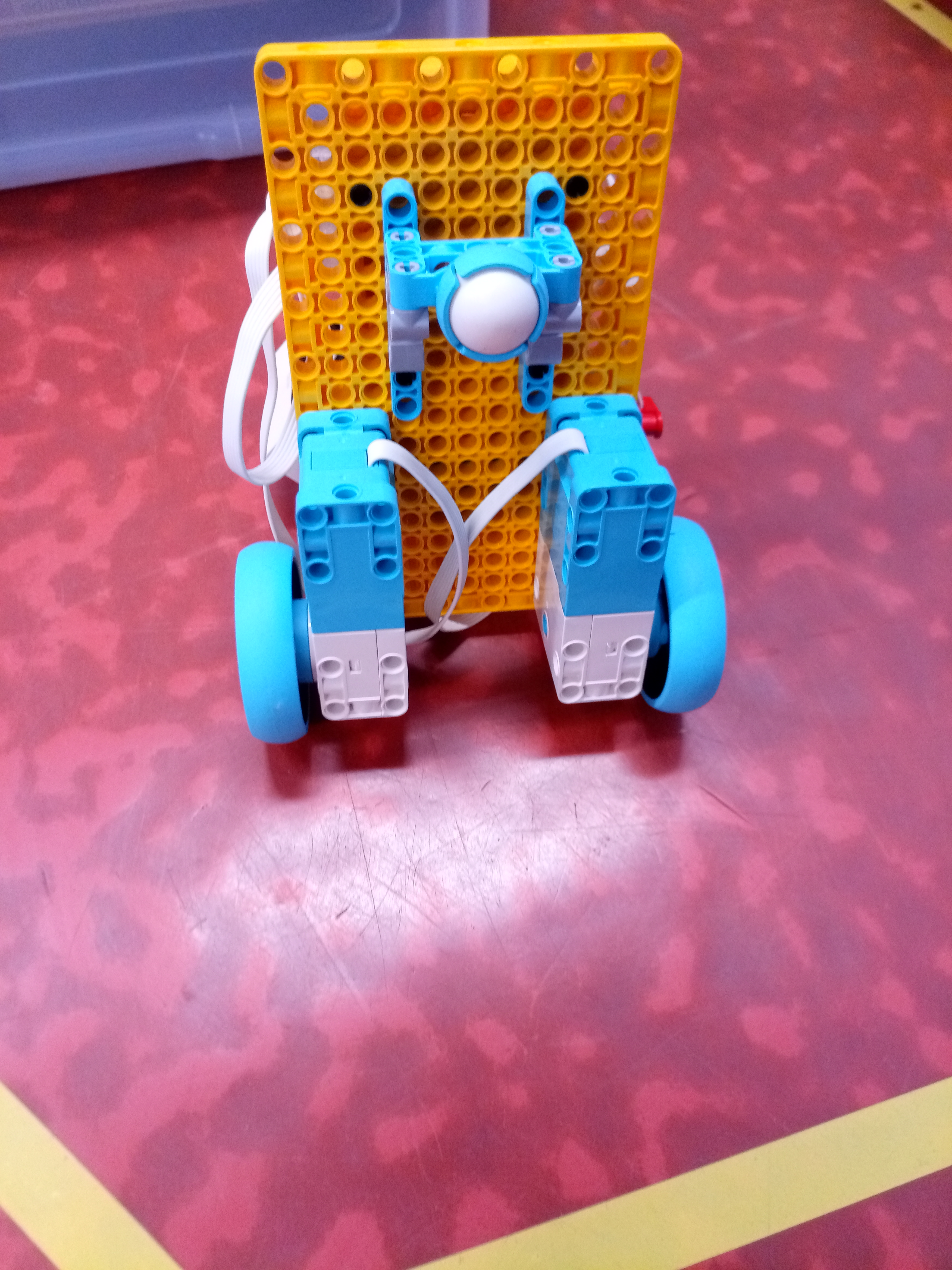 Náš robot sa skladá z kocky SPIKE a 5 motorov a ultrasenzora. Dva motory má na pohyb robota. Jeden má na pohyb senzora, aby vedel, kde je a ako ďaleko od steny. Ďaľšie dva motory sú na pohyb štetca. Jeden motor robil pohyb hore dolu a druhý otáčel smer štetca. tak sme vedeli štetec aj namáčať, aj posúvať po stene vo všelijajých výškach. Ale tie motory sú strašne slabé. Oni síce vpohode zdvihnú štetec, ale potom sa zrazu po cvíľočke vypnú, a on padne. A tak sme skúšali všeličo, ale motory sa nám furt vypínali. Možno, keby sme tú páku od motora vyvážili na druhu stranu závažím, tak by nám ten štetec nepadal. Tréner nám ešte poradil použiť šnek, ale to sme už nestihli.