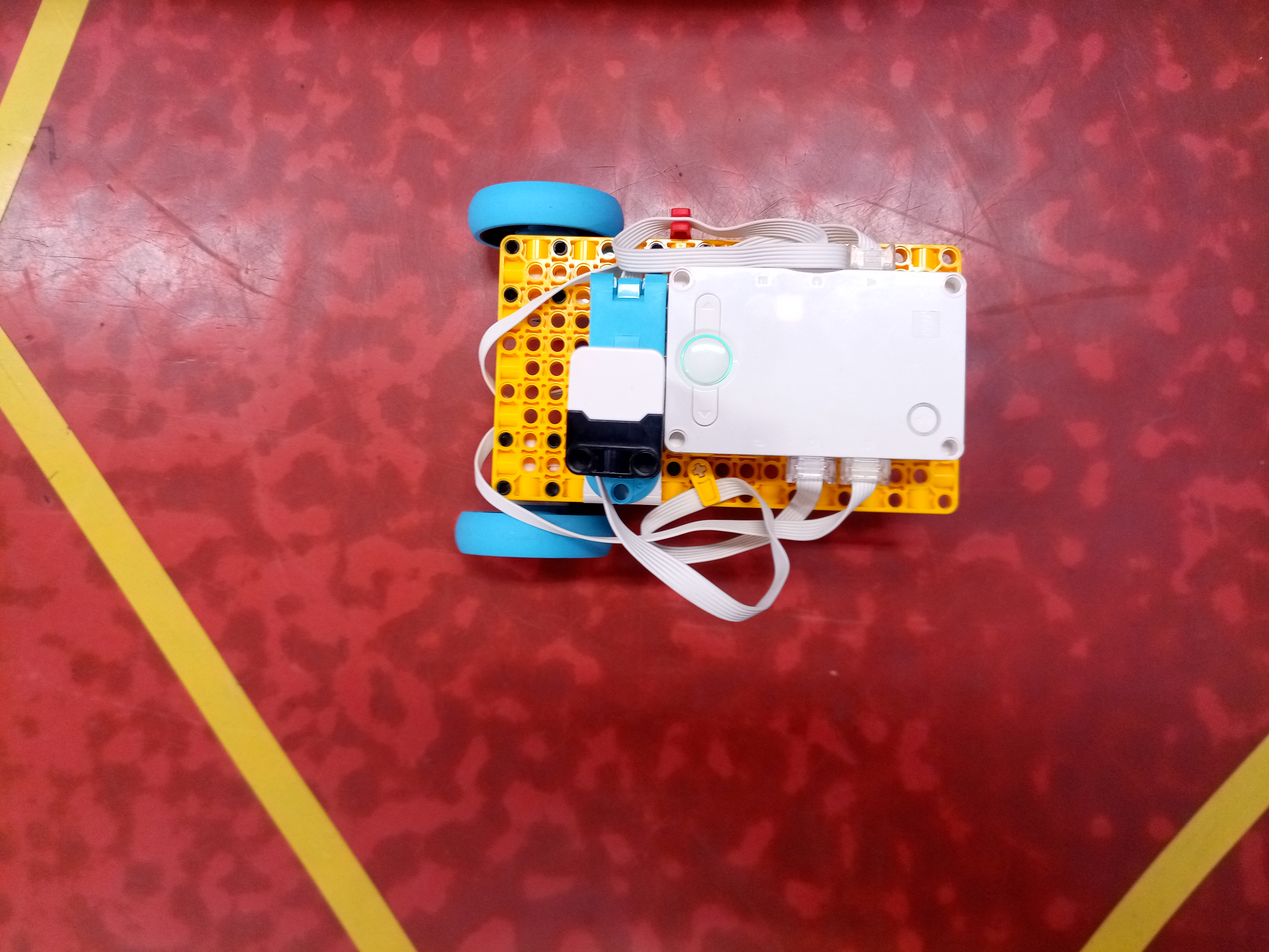 Náš robot sa skladá z dvoch veľkých motorov na pohyb, jedného stredného motora na nasmerovanie USG senzora a kocky SPIKE.