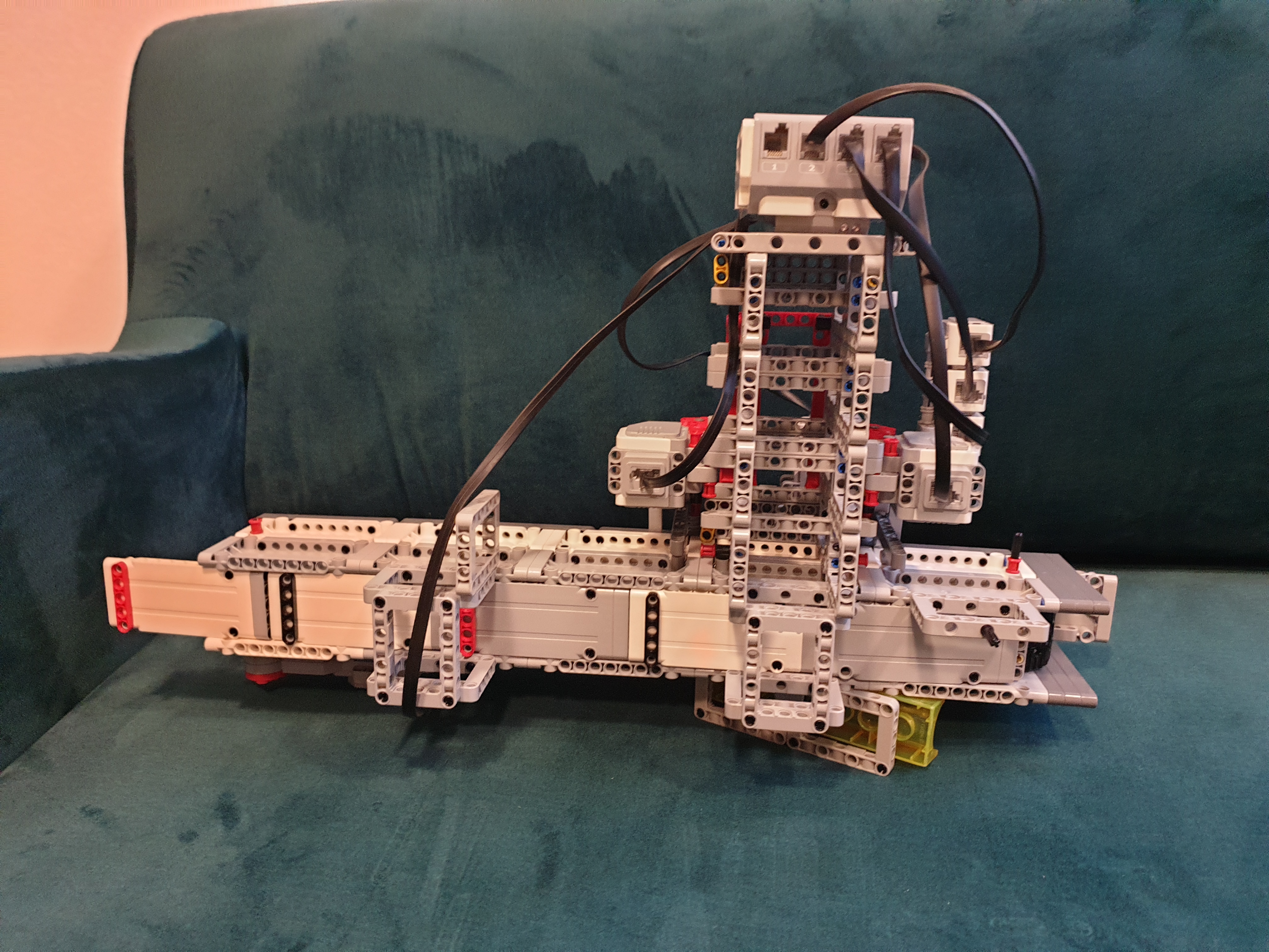 Náš MK3 triedič sa skladá z jednej EV3 kocky, troch veľkých motorov, jedného stredného motora, troch touch senzorov,a veľa ďaľších kociek. Po spustení programu sa spustí dopravníkový pás, ktorý prevezie odpad popod magnetickú triediacujednotku. Triediaca jednotka odchytí magnetické časti, dovezie ich nad žliabok, a následne stredným motorom zdvihnezabudovanú magnetickú časť, takže sa magnetický odpad nemá čoho držať a spadne do žliabku. Potom sa triediacajednotka vráti do pôvodnej polohy a celý cyklus sa začne donekonečna (respektíve kým sa neminie batéria) opakovať. Maťo+Kubi+EV3