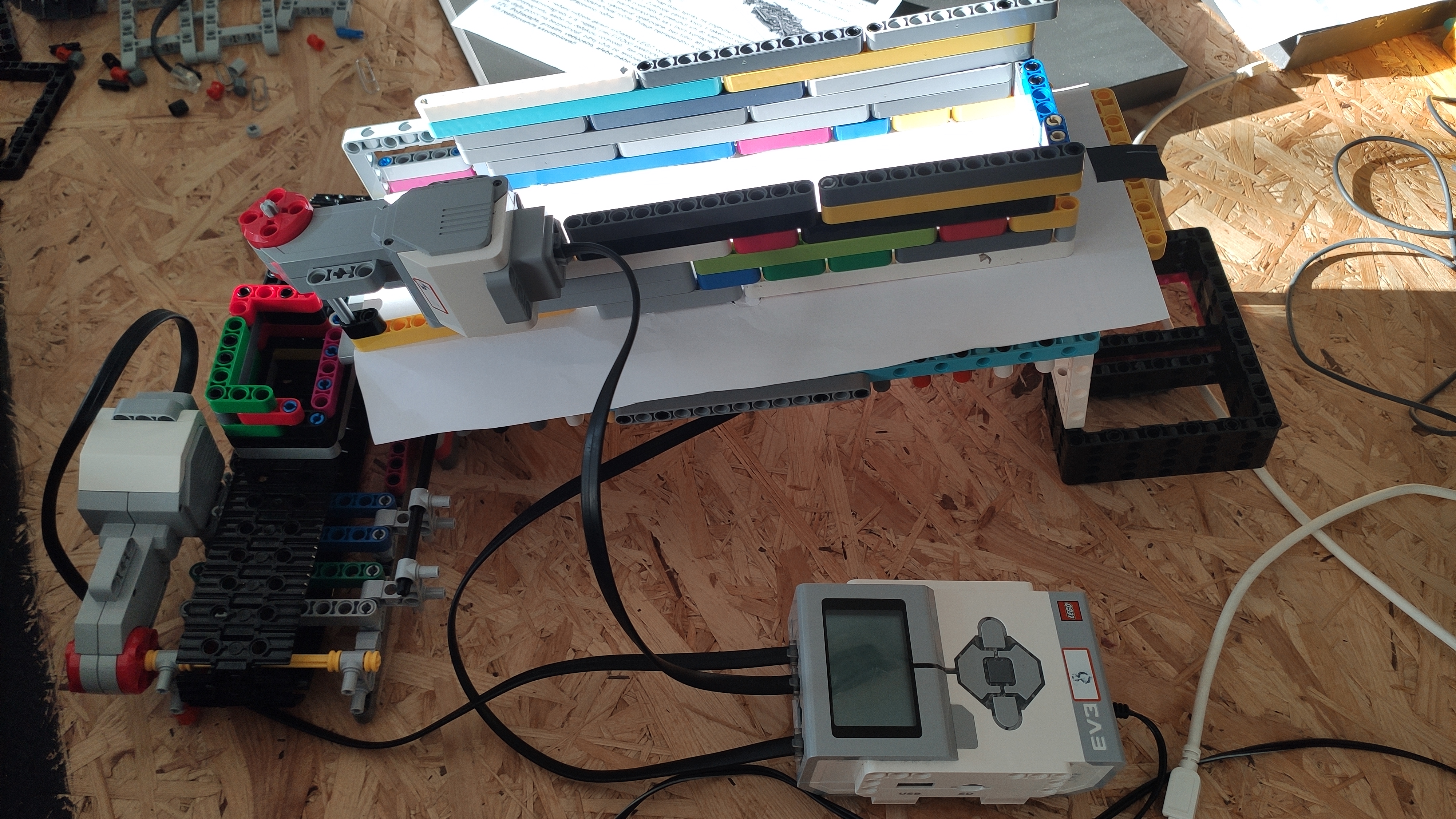 Do nakloneného dopravníka postaveného z Lega nasypeme smeti.
