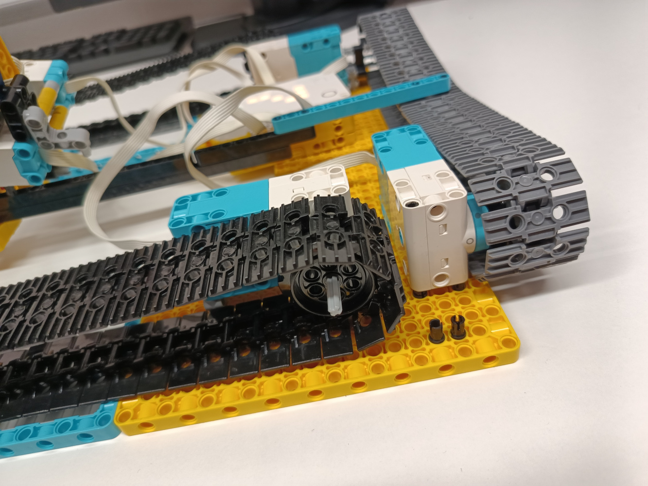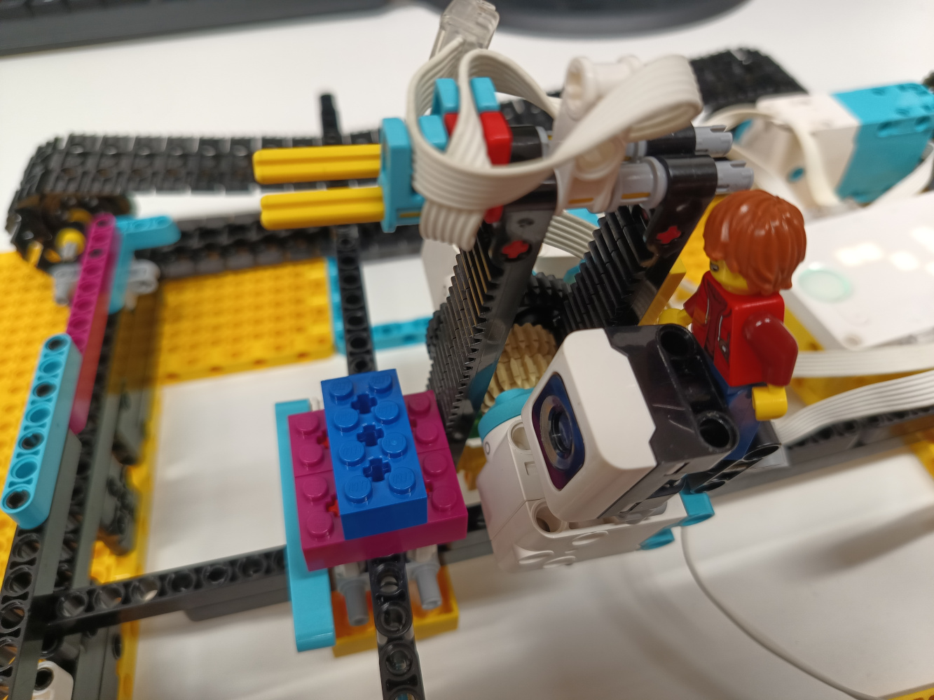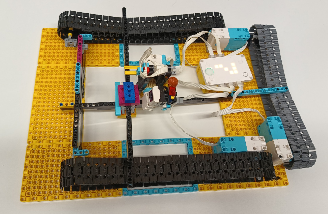 1. Jasné, že vám chýbal druhý motorček na tej opačnej strane, ale aj bez toho je to výborné riešenie. Myslím, že by ste hravo zvládli aj úlohu pre tigre, naozaj ste to dobre premysleli a pekne to celé funguje. 2. Zaujímavé riešenie, ktoré funguje. Nakláňanie riadiacej jednotky naozaj presúva kameru do ľubovoľného miesta vo vymedzenom 3D priestore. Zdá sa, že obmedzenie dĺžky kabeláže tejto riadiacej jednotky neumožnila pohon štvrtého pásu, takže v rámci možností ste urobili snáď aj maximum, ale ak uvažujeme nad reálnym využitím takejto konštrukcie, tak tá je už otázna - kamera by sa potrebovala priblížiť k scéne, zatiaľ čo táto kamera je uzavretá medzi štyrmi rampami a priestor pre natáčanú scénu tu nie je. 3. Za úlohu Kameraman získavate 3b. Páči sa mi vaše unikátne riešenie úlohy :) 4. Máte rovnakú fotku ako šachisti simulanti. Ste teda ti istí členovia, ktorí riešili dve úlohy? Ako pozerám, aj vám by sa hodili dlhšie káble. Troška náročné bolo asi nakláňanie kocky. Pohyb bol podľa zadania, aj keď trochu trhaný. A pohyb smerom hore a dole, bol taký nie dokonale úplný. Chcelo by to túto časť trochu doladiť. Aj tak ale dobrá práca. 5. Zaujímavé riešenie, ale to natáčanie do boku zadným pásom je trochu komplikované a málo spoľahlivé.