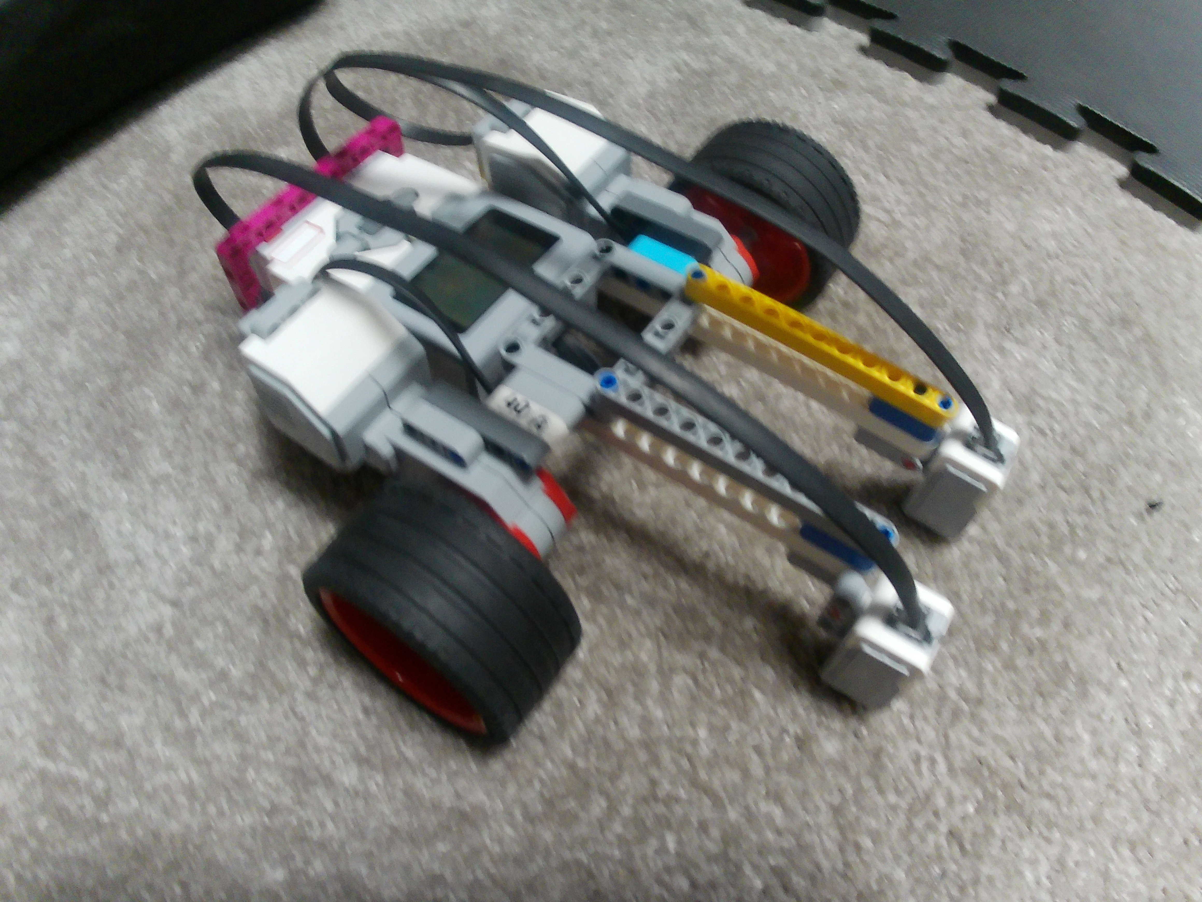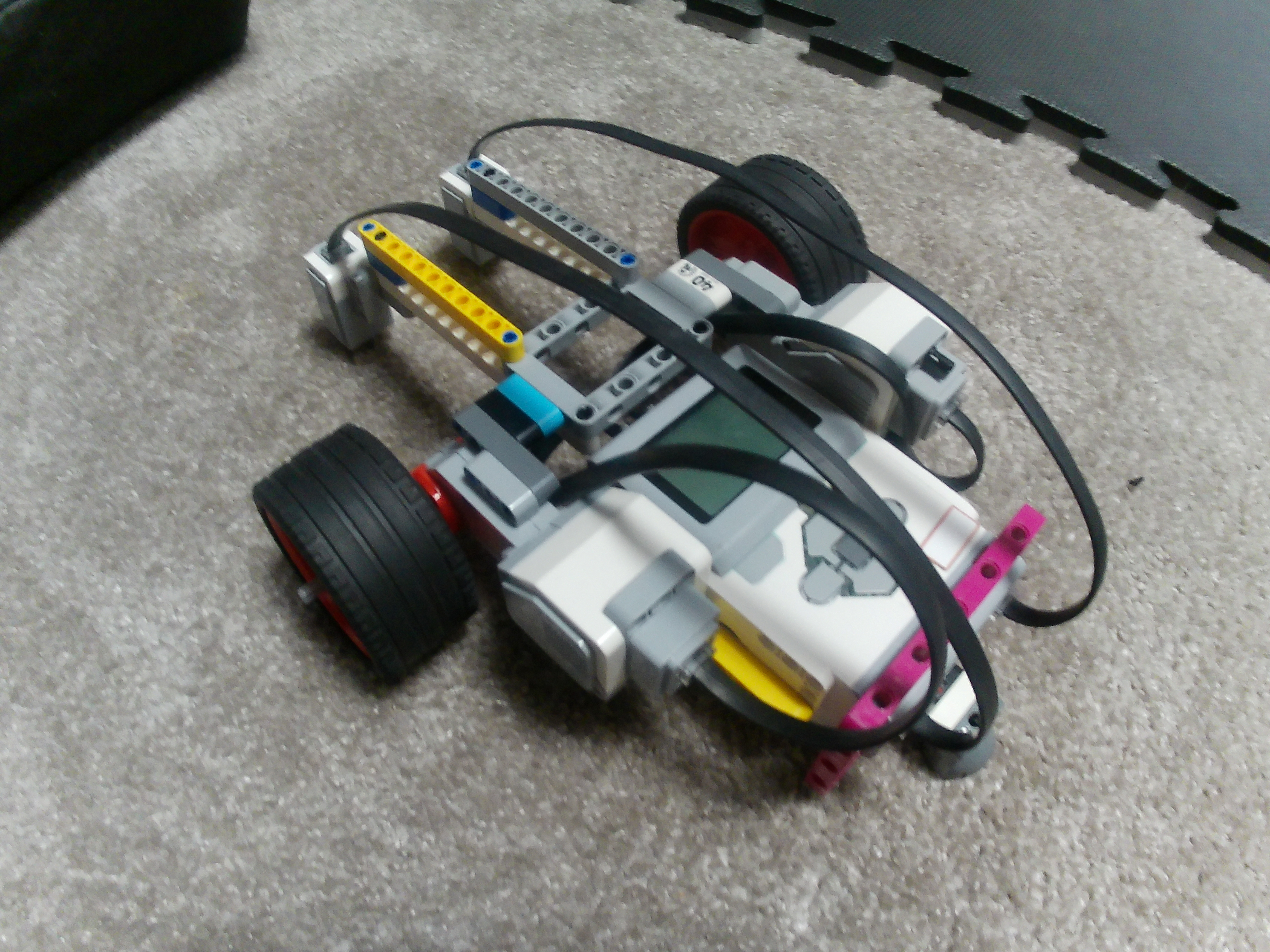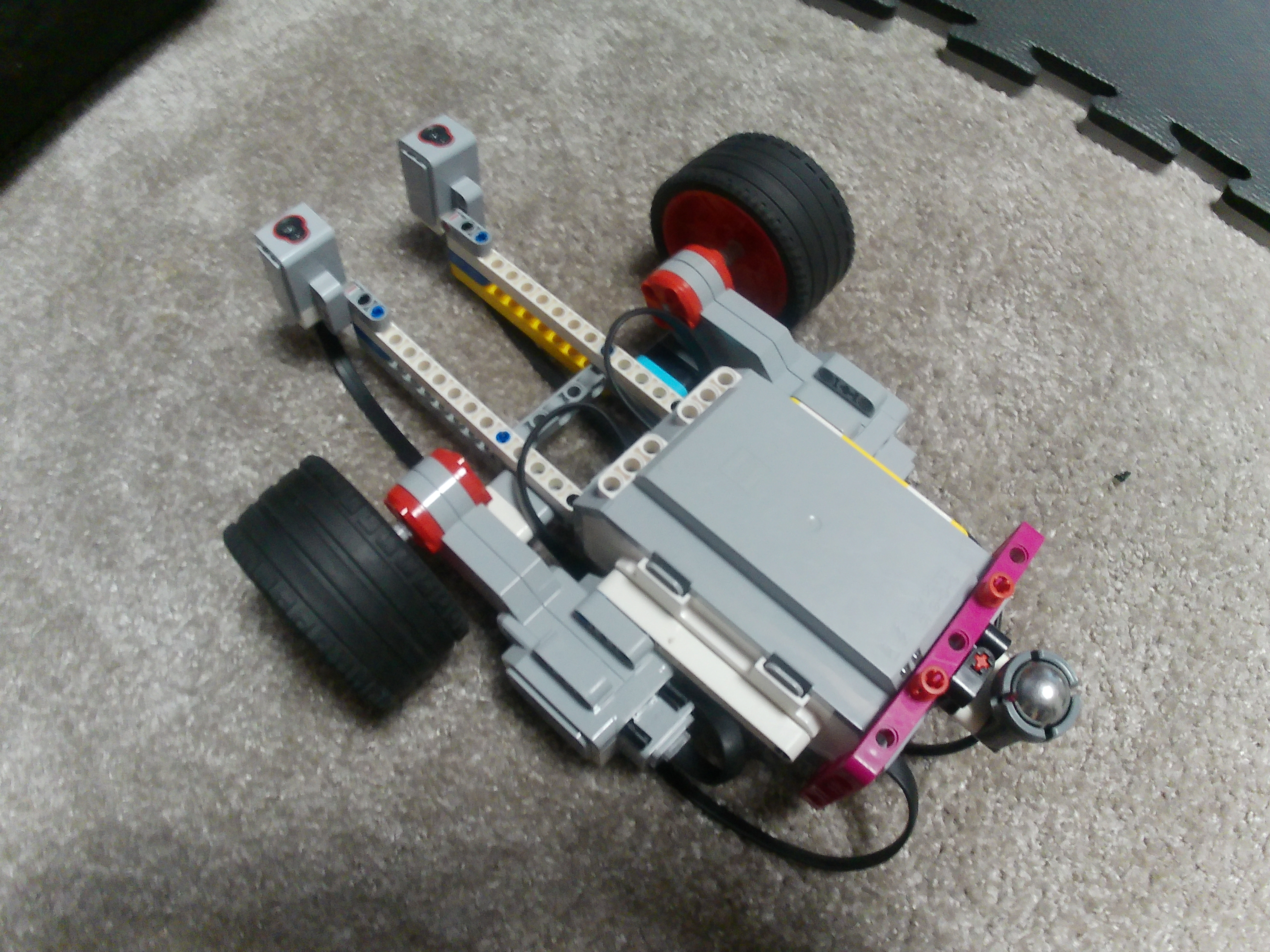 1. Vidno, že ste nestíhali, pretože by bolo dobre ukázať funkciu aj na nejakom inom útvare, ale inak sa mi páči aj konštrukcia aj celková myšlienka. Takže len pol bodíka za slabšiu dokumentáciu na viacerých útvaroch. 2. Ďakujeme aj za takéto riešenie. Myšlienka je správna, aj keď jej realizácia by sa dala trochu zlepšiť. Na videoukážke vidno, že jedna skrýša je tá, ktorú pravý senzor našiel, ale druhá v pravom hornom rohu útvaru - tiež možná skrýša - nebola týmto senzorom odhalená. Bola by bývala odhalená, keby ten senzor bol viac vpredu. Senzory by sa dali dať aj bližšie k sebe, ak by pohyb nebol taký rozkývaný vpravo-vľavo. Pomocou jedného senzora sa dá krásne sledovať čiara aj tak, že robot ide priamo rovno - dokonca na to stačí jediný blok v cykle, ktorý urobí rozdiel medzi hodnotou senzora (odrazené svetlo v percentách) a nejakou hodnotou, ktorú senzor dáva v strede čiary a tento rozdiel pošle s rôznymi znamienkami na oba motory - len k tomu treba pridať napr. o 30 viac na obe kolieska, inak by iba stál na mieste a držal sa čiary. Vo videopopise mi trochu chýbalo vysvetlenie, prečo takýto algoritmus naozaj skrýše objavuje. Ja to síce viem, ale rád by som videl, že to vieš pekne vysvetliť. Dúfam, že nabudúce sa to podarí aj s vysvetlením! 3. Za úlohu Schovávačka získavate 2,5b. Oceňujem video, v ktorom vysvetlujete riešenie úlohy. Chýba fotka tímu a v rámci videa nie je vidieť, aké hodnoty sa zobrazujú na riadiacej jednotke. 4. Pekný opis funkčného programu aj modelu. To oceňujem. Chýba tam jasnejšie znázornenie, či preukázanie, či ide o dobrý útvar. Ako to mali v úlohe zajace. Aj keď sa to z takto zobrazeného výsledku dá odvodiť. Taktiež by bolo dobré, preukázať, že tento program funguje naozaj na viacerých pokusoch. Napríklad prelepiť dve čiary a vytvoriť inú miestnosť. Prípadne nevhodnú miestnosť a či to robot rozozná. 5. Zaujímavé efektívne riešenie, ďakujeme!