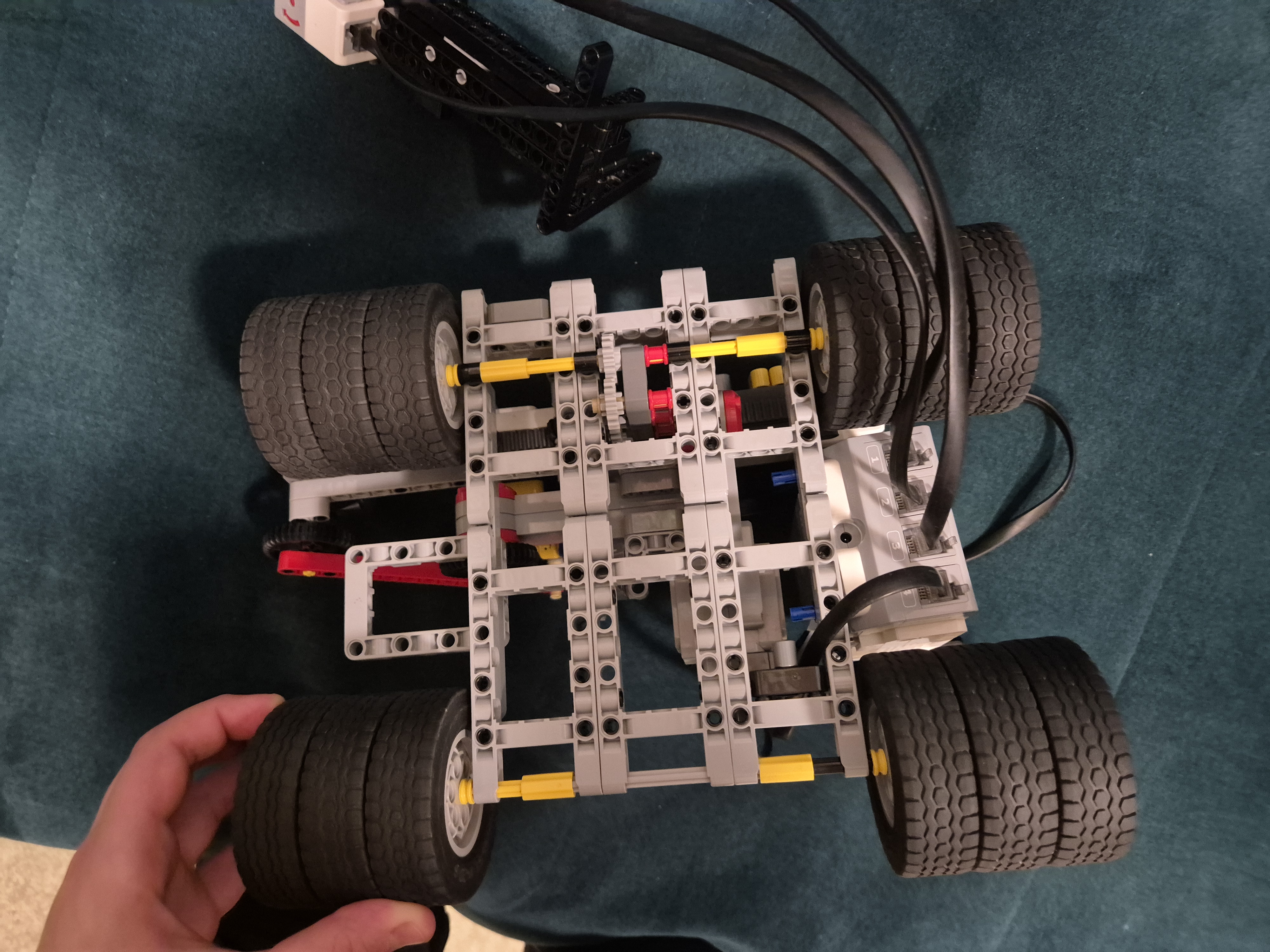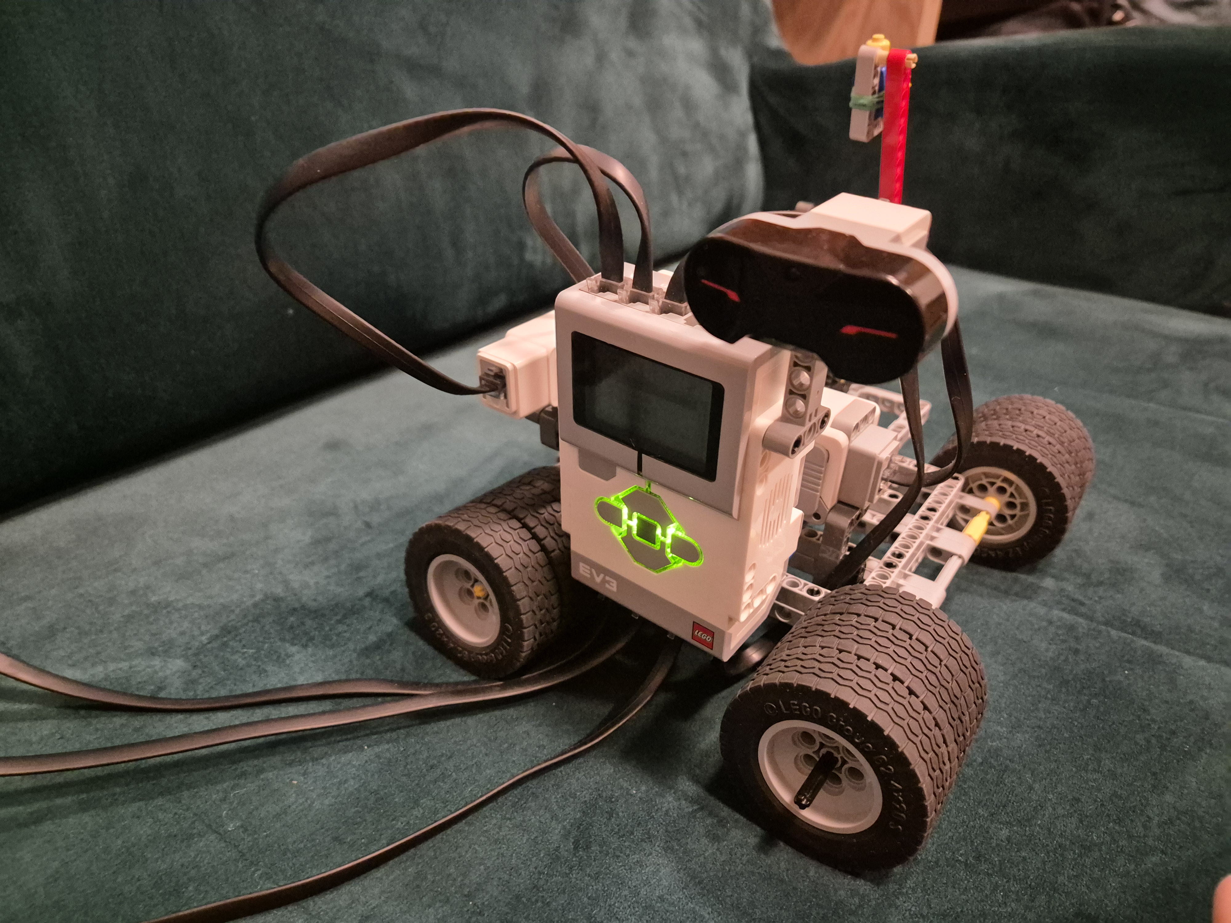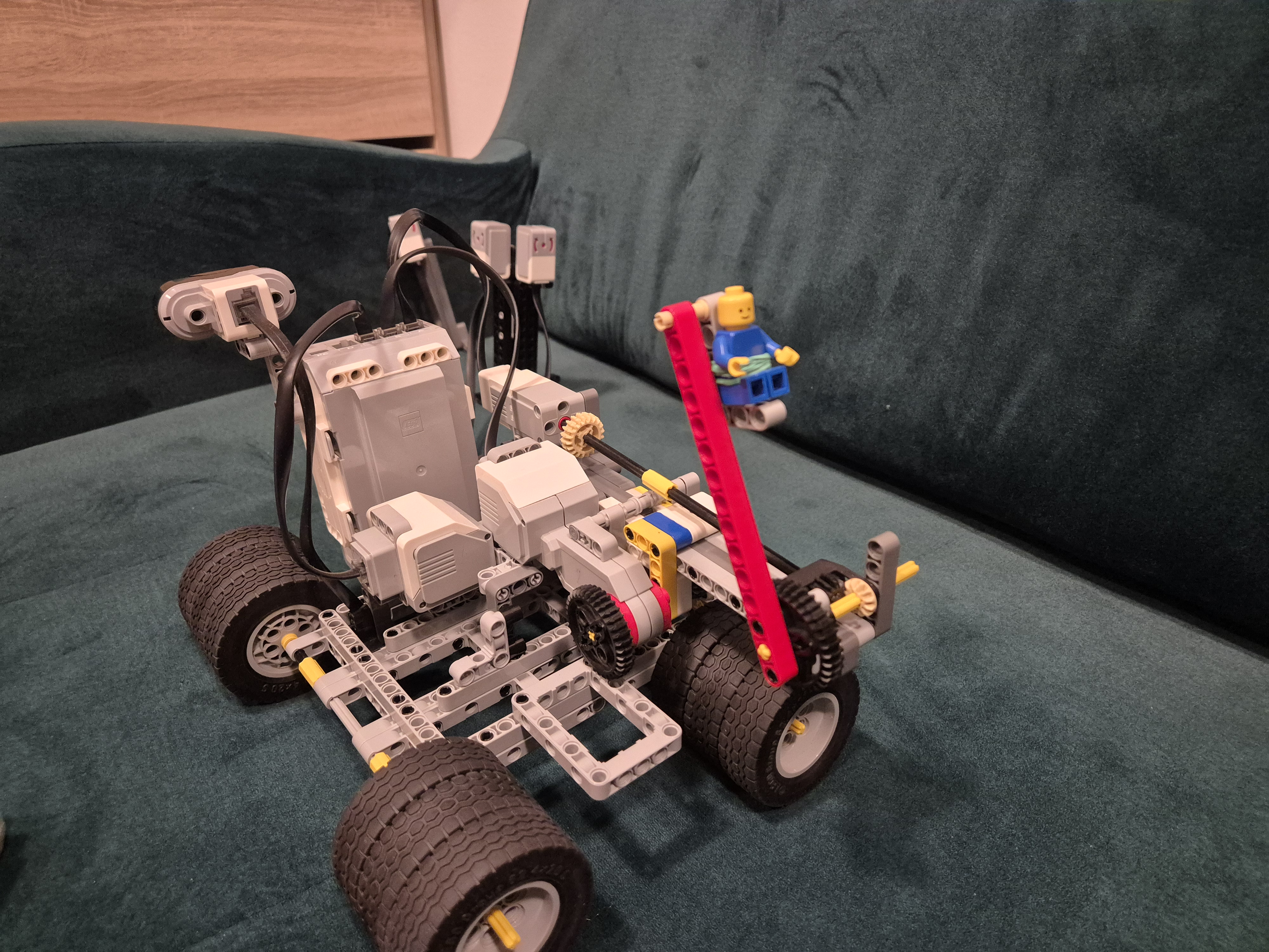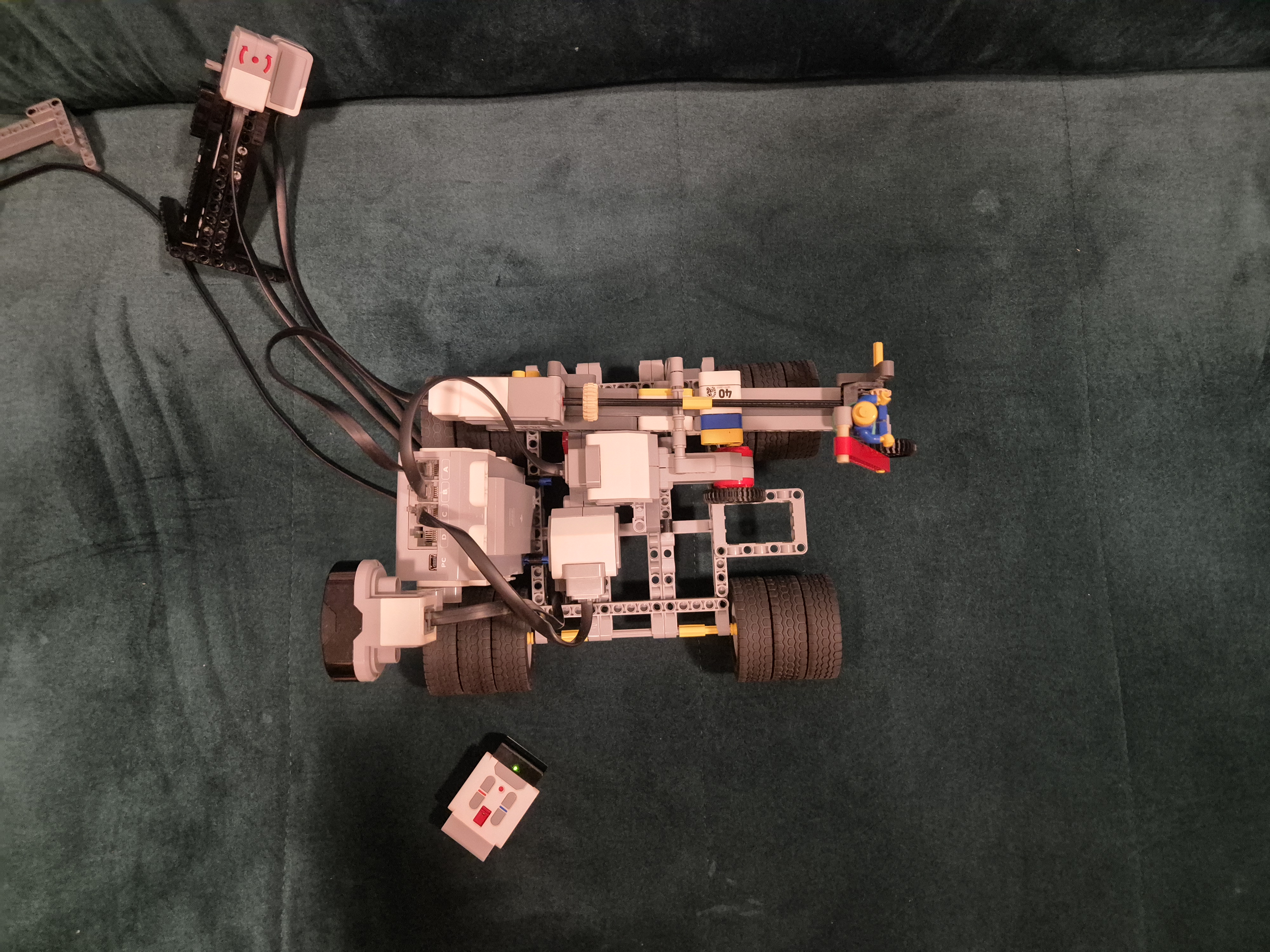 Náš MK3 triedič sa skladá z jednej EV3 kocky, dvoch veľkých motorov, jedného stredného motora, jedného infračerveného senzora a veľa ďalších kociek. Po spustení programu sa spustí ovládanie. Pomocou ovládačky donavigujeme robota na nejakú pozíciu, kde vynulujeme motory. Toto miesto označíme za štartovaciu pozíciu. Potom znovu navigujeme robota niekde do priestoru, kde znovu stlačíme tlačidlo, aby sme určili cieľovú pozíciu. Tam si robot zapamätá hodnoty motorov, a podľa nich sa vráti na štartovaciu pozíciu. Tam čaká na stlačenie tlačidla Klapka!. Keď ho stlačíme, robot sa podľa zapamätaných hodnôt presunie na cieľovú pozíciu, kde zahrá fanfára. V zadaní bolo povedané že máme použiť gyro senzor. Náš prvý prototyp robota ho obsahoval rovno trikrát a fungoval dokonale. Potom ale senzory postupne začali blbnúť a nedalo sa s nimi urobiť nič. Ich hodnoty vždy začali bleskurýchle stúpať, a keďže v programe senzory mali odoslať signál motoru pri nameranej hodnote 30/-30, po pár sekundách sa motory zapli a išli až dovtedy, kým sme program nezastavili. Skúšali sme veľa možností kalibrácie, niekedy to fungovalo, väčšinou však nie. Uvedomujeme si tento nedostatok, ale čo s tým narobíme. Dúfame, že aspoň nejaké bodíky dostaneme:)Maťo+Kubi+EV3