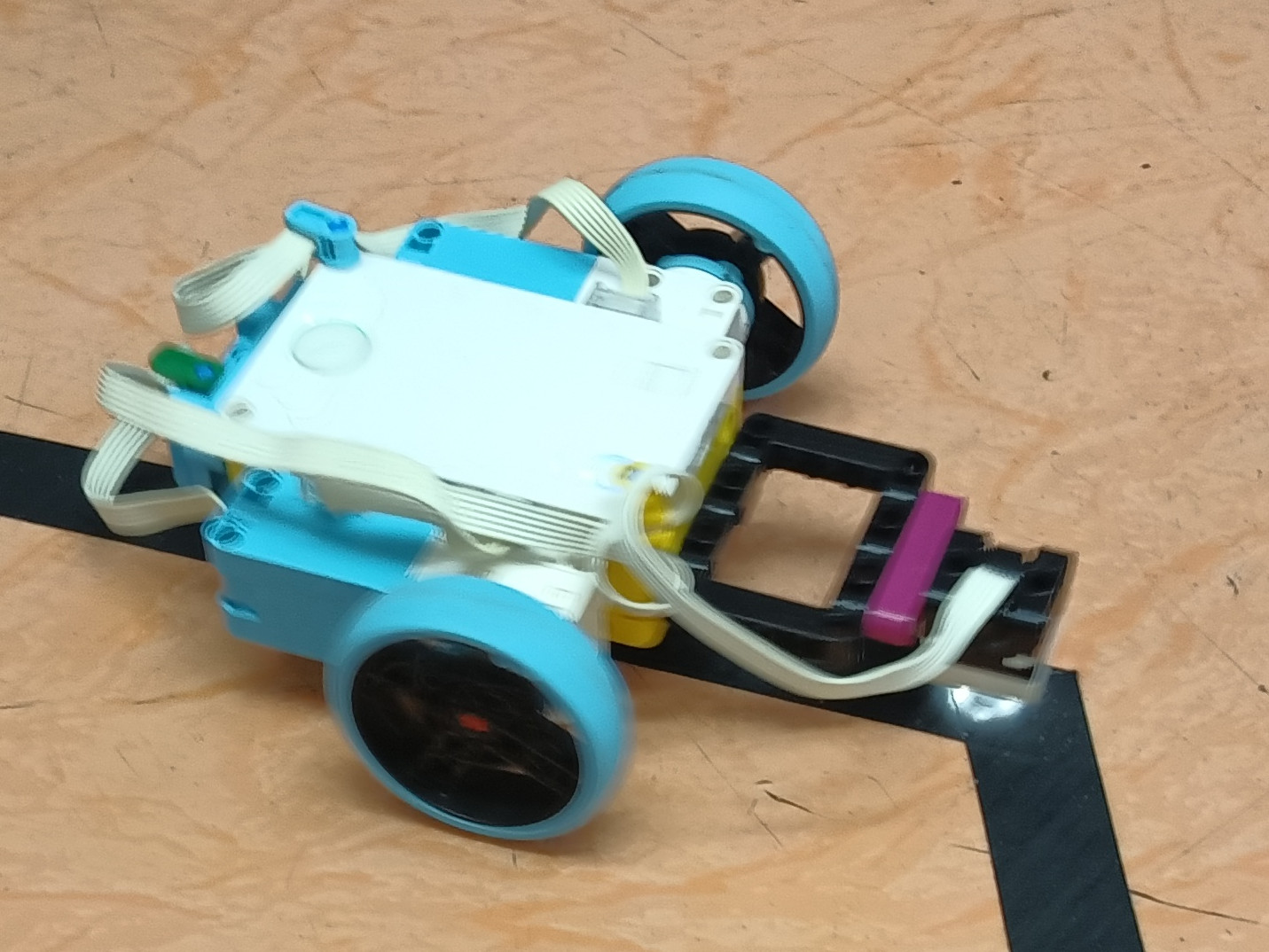 Robot ide pomaly po čiare, pamätá si smer cesty, kde začal. Keď zatočí aspoň o 10 stupňov, zapíše si dlžku rovnej cesty, počká 4 sekundy, aby dozatáčal a zapíše si nový uhol. Keď uvidí žltú, počká na štart a ide naspäť podľa zapísaných dĺžok a uhlov.