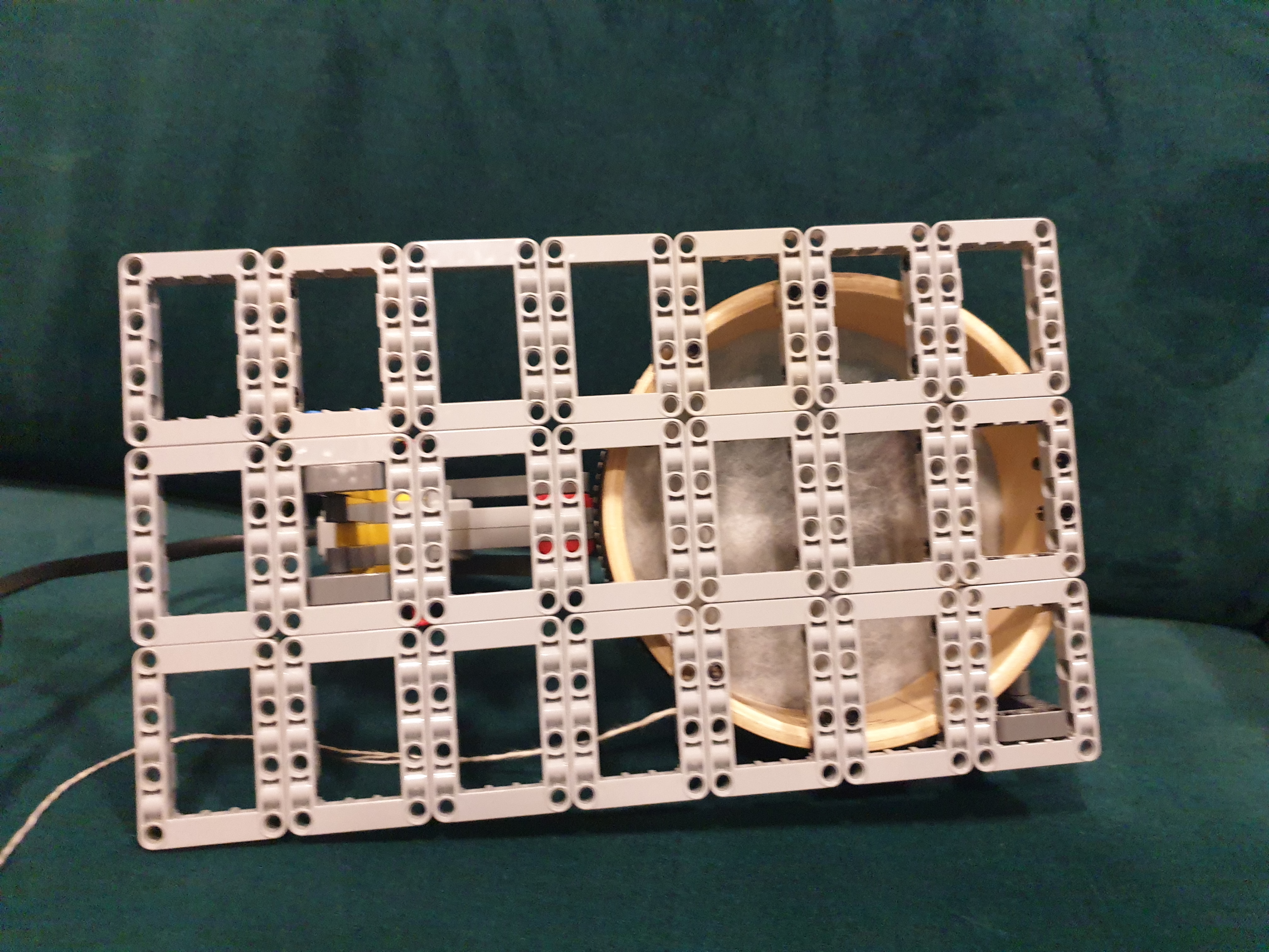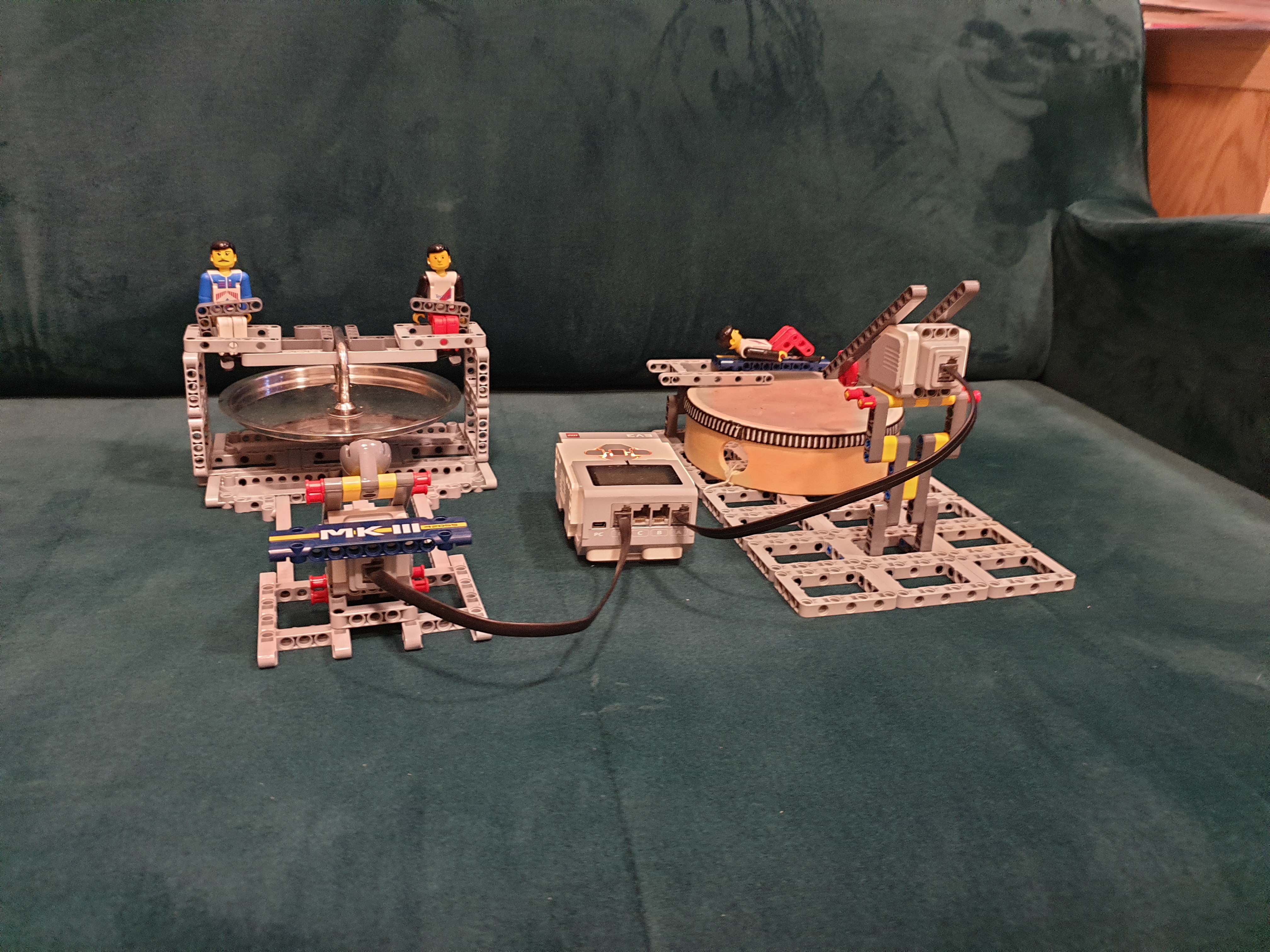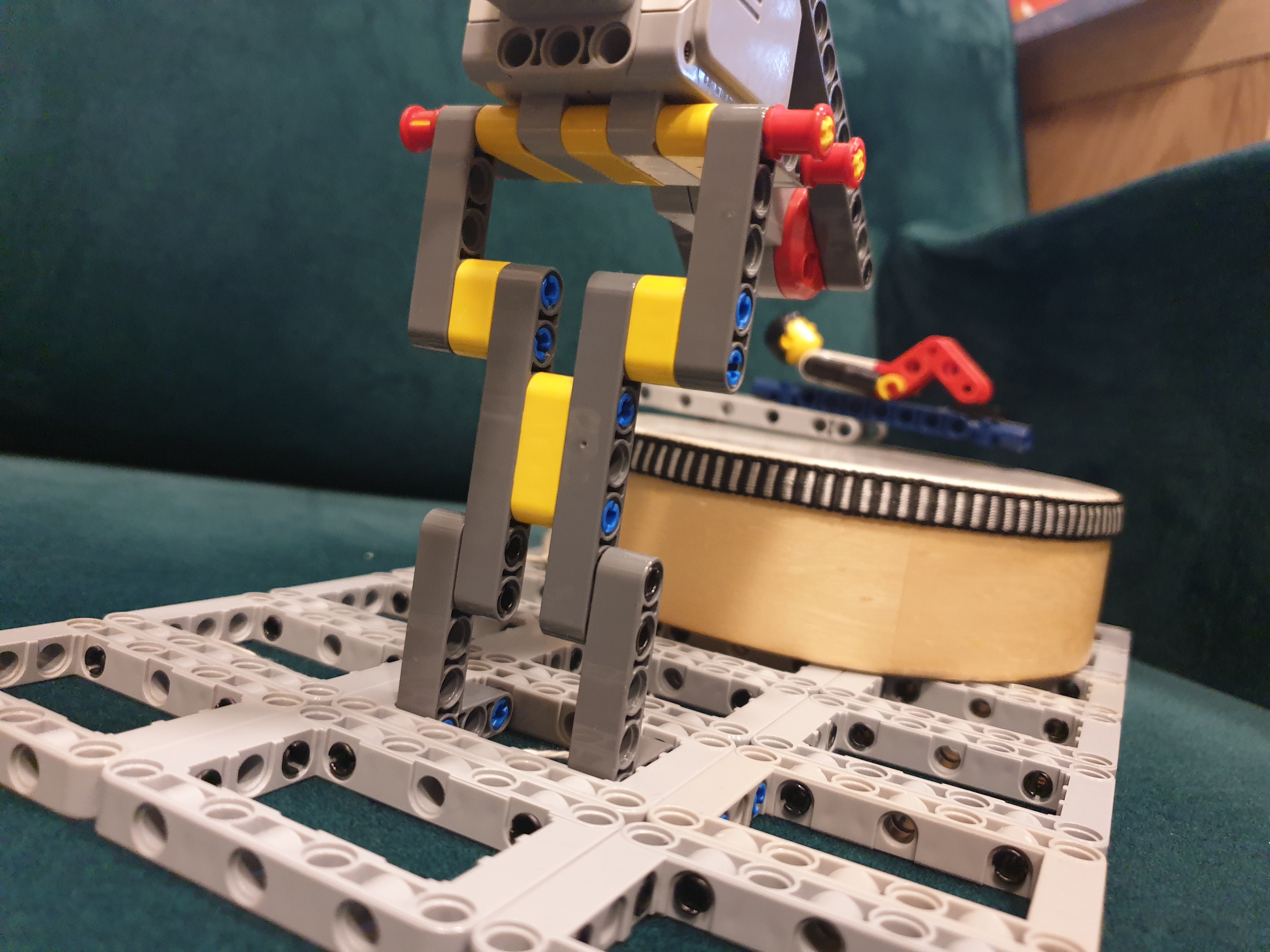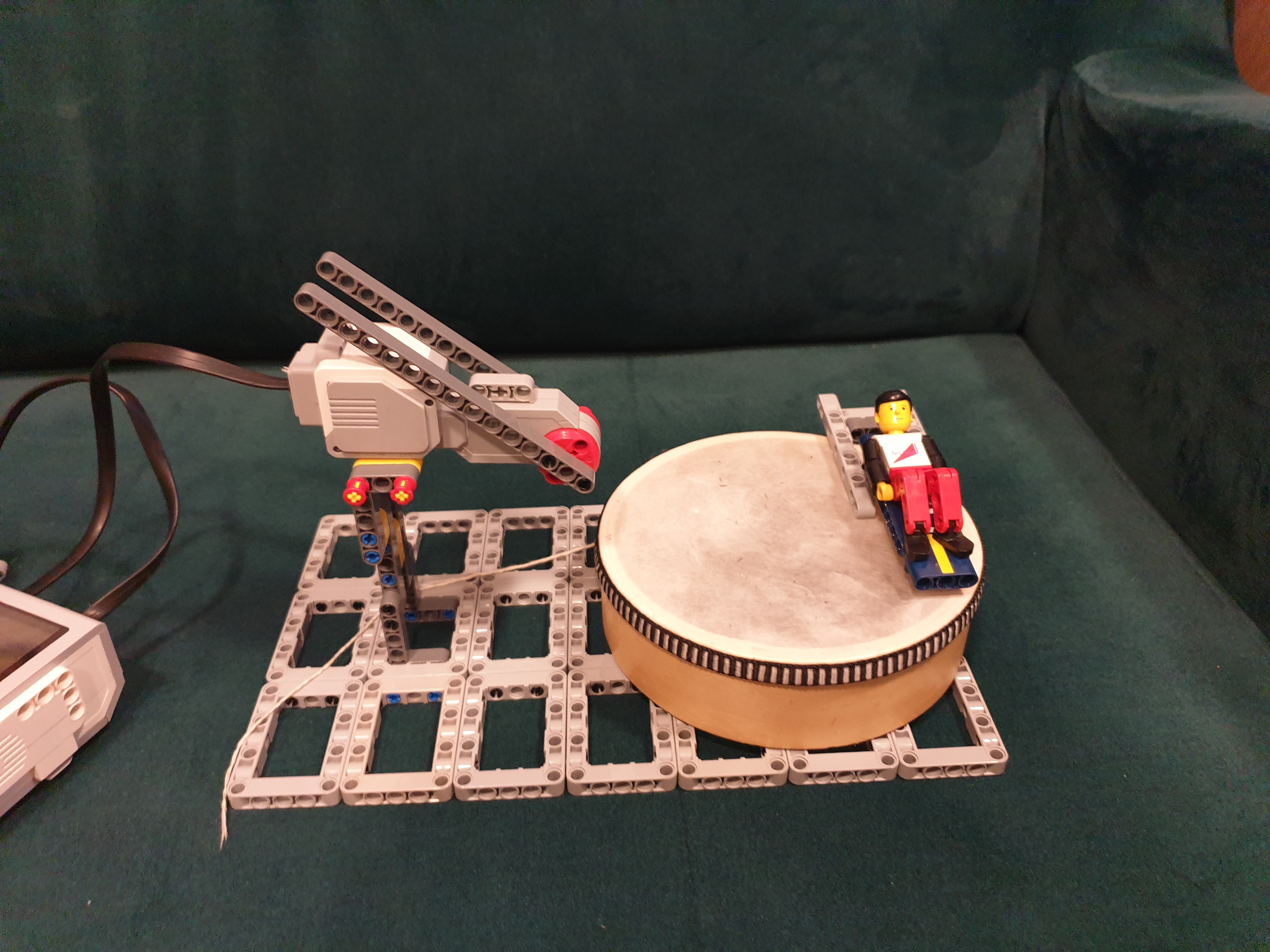 Náš MK3 bubeník sa skladá z jednej EV3 kocky, dvoch veľkých motorov a veľa ďaľších kociek. Po spustení programu č.1 motor č.1 dva krát buchne na bubon, a potom motor č.2 jeden krát buchne na pokrievku. Tento cyklus môžeme opakovať koľko krát chceme, a tiež ho môžeme spomaliť, resp. zrýchliť. Po spustení programu č.2 sa spustí sled náhodne vybraných vlastných blokov, ktorý sme nazvali TUC TUC. Žiaľ, k TUC TUC sme (zatiaľ:-) nevymysleli žiadnu hudbu, ale keď/ak ju vymyslíme dáme vám vedieť. Tím MK3