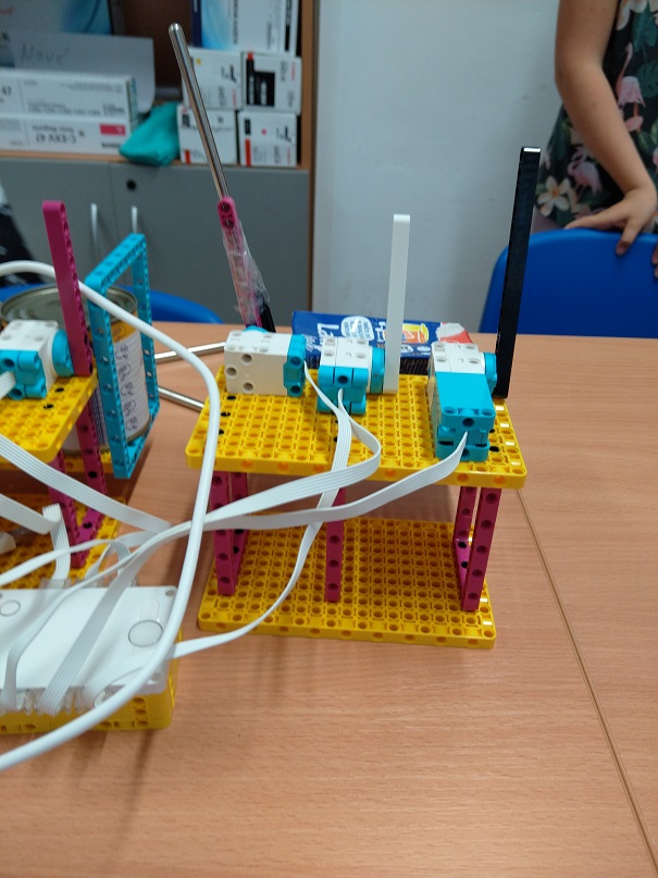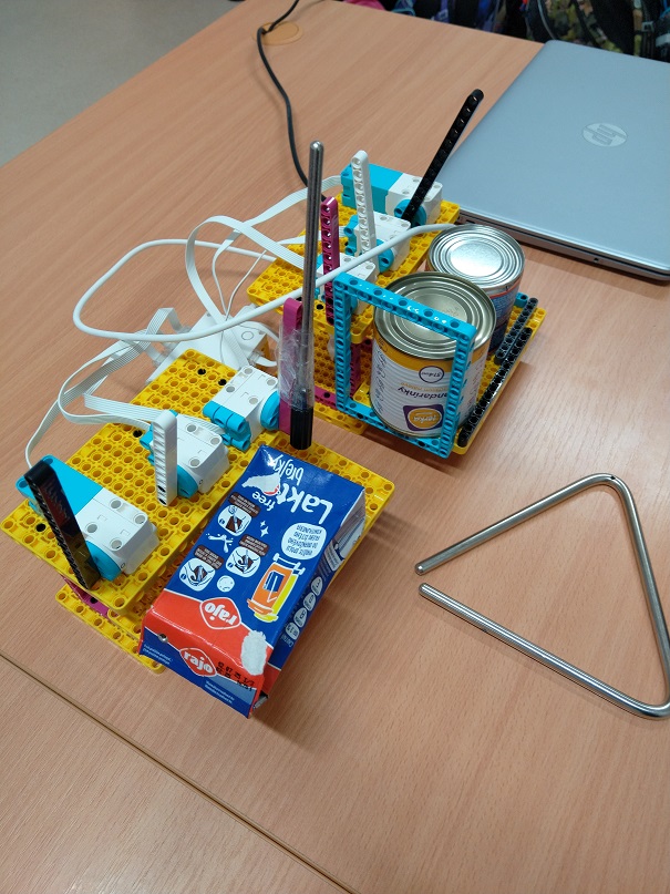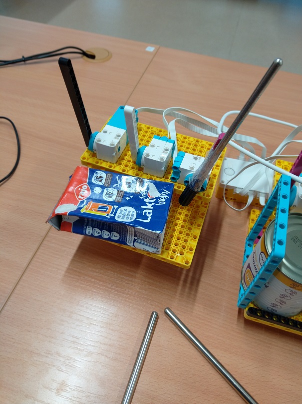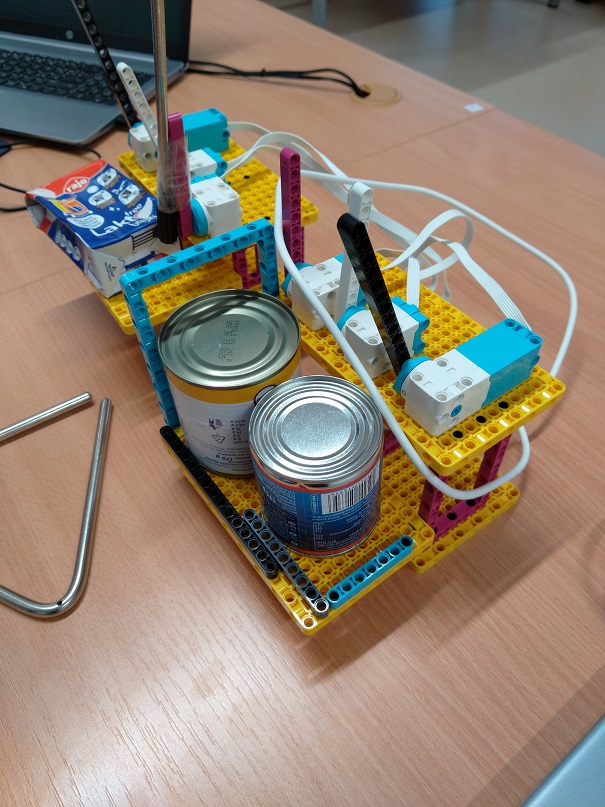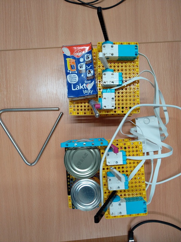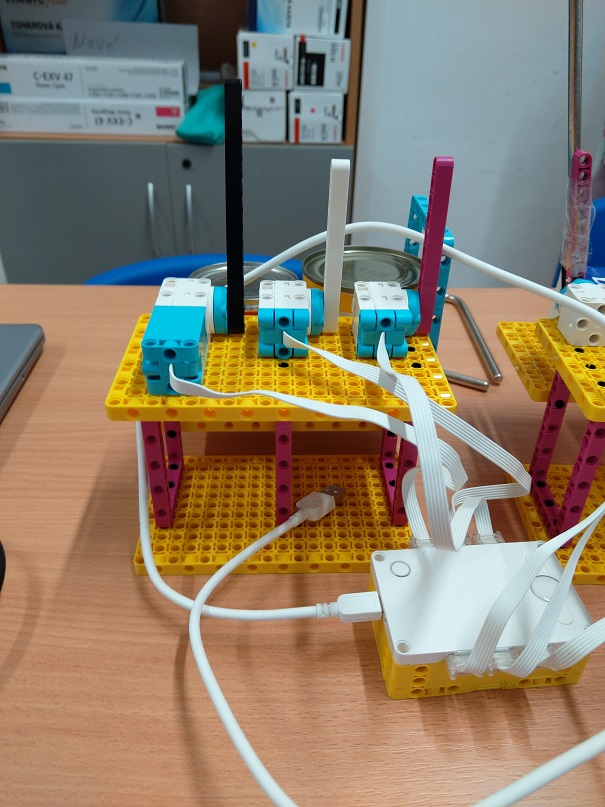 2 stredné motory lego spike prime a 4 motory lego spike essential a 1 programovacia kocka lego spike prime, 5 paličiek a 1 palička na ktorej je pripevnená palička od triangla, 2 plechovky, 1 krabička od mlieka, 1 kovový triangel a 6 plôšok na ktorých sú motory.