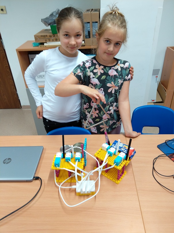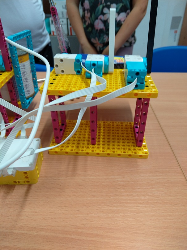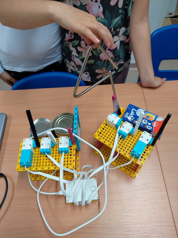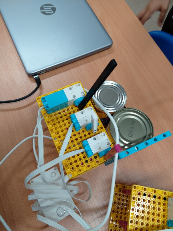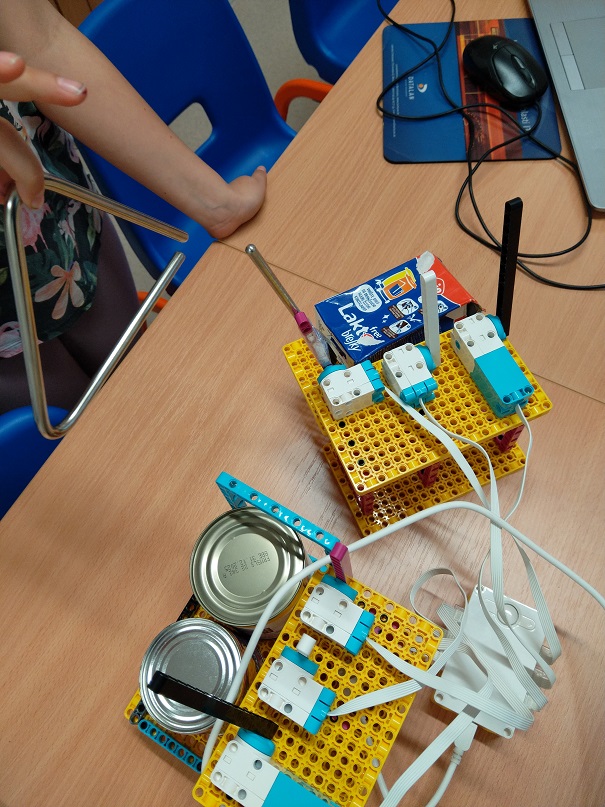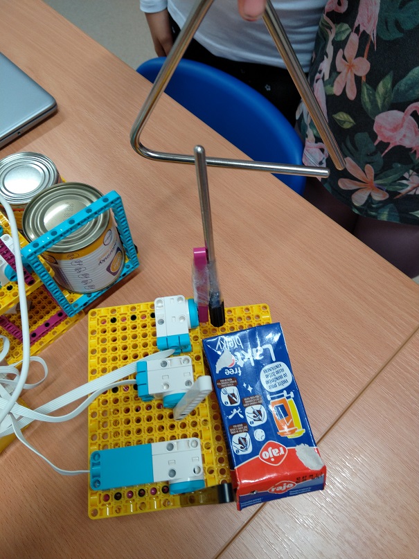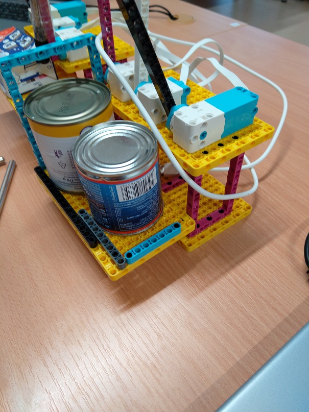 2 stredné motory lego spike prime a 4 motory lego spike essential a 1 programovacia kocka lego spike prime, 5 paličiek a 1 palička na ktorej je pripevnená palička od triangla, 2 plechovky, 1 krabička od mlieka, 1 kovový triangel a 6 plôšok na ktorých sú motory.