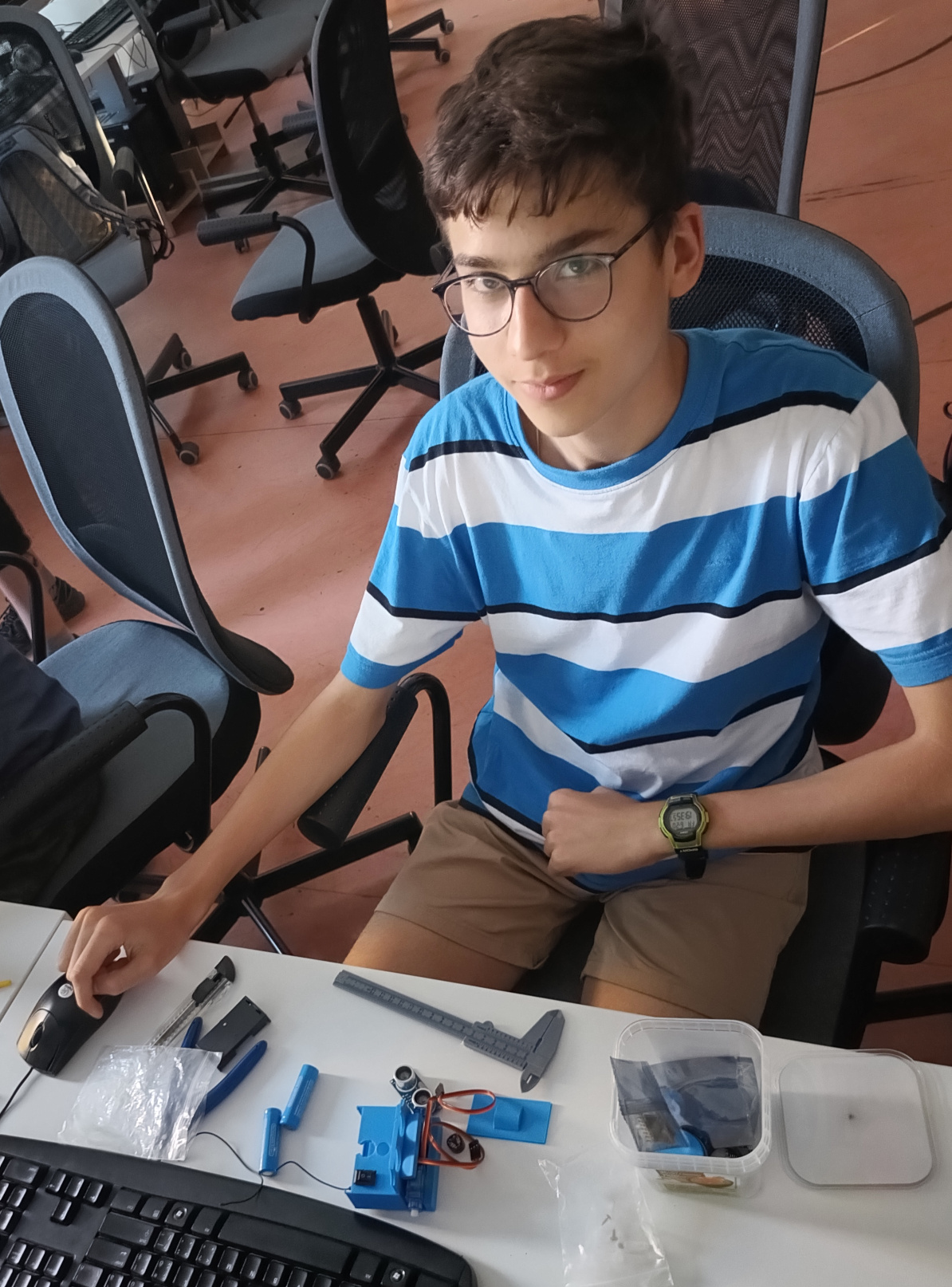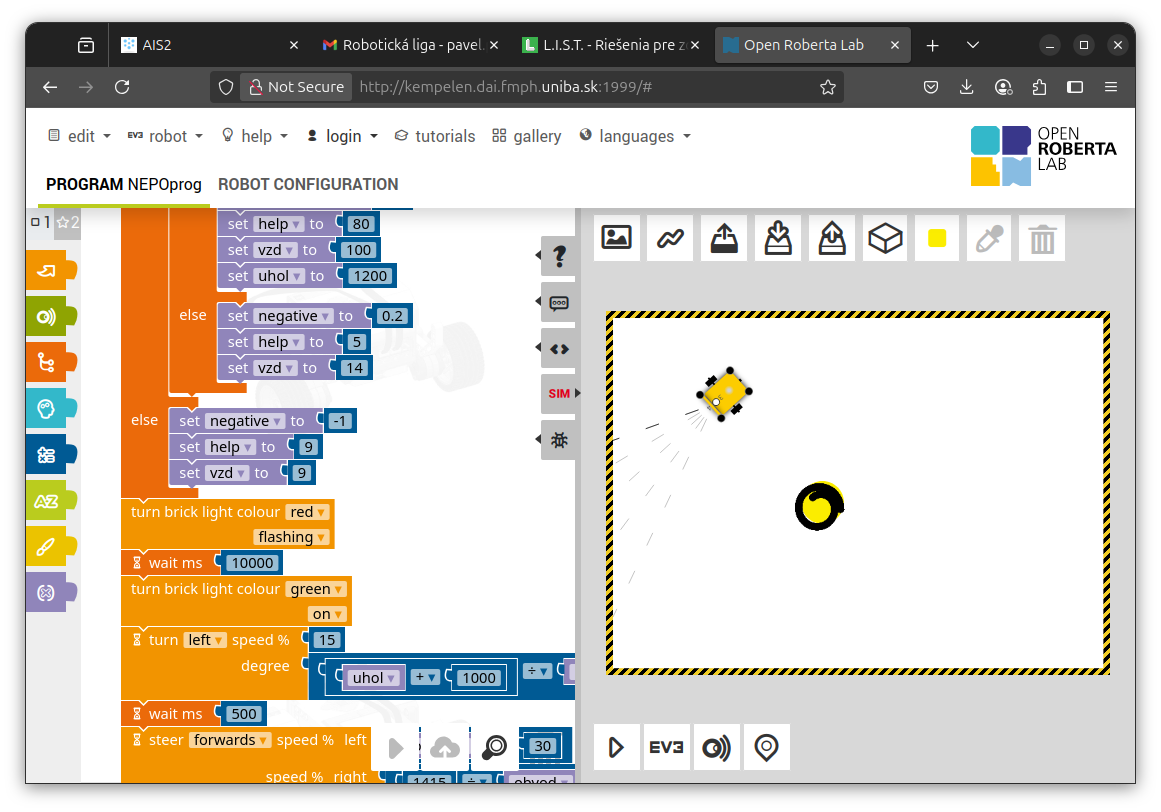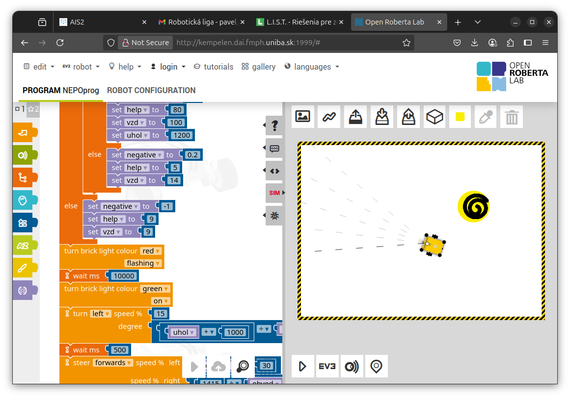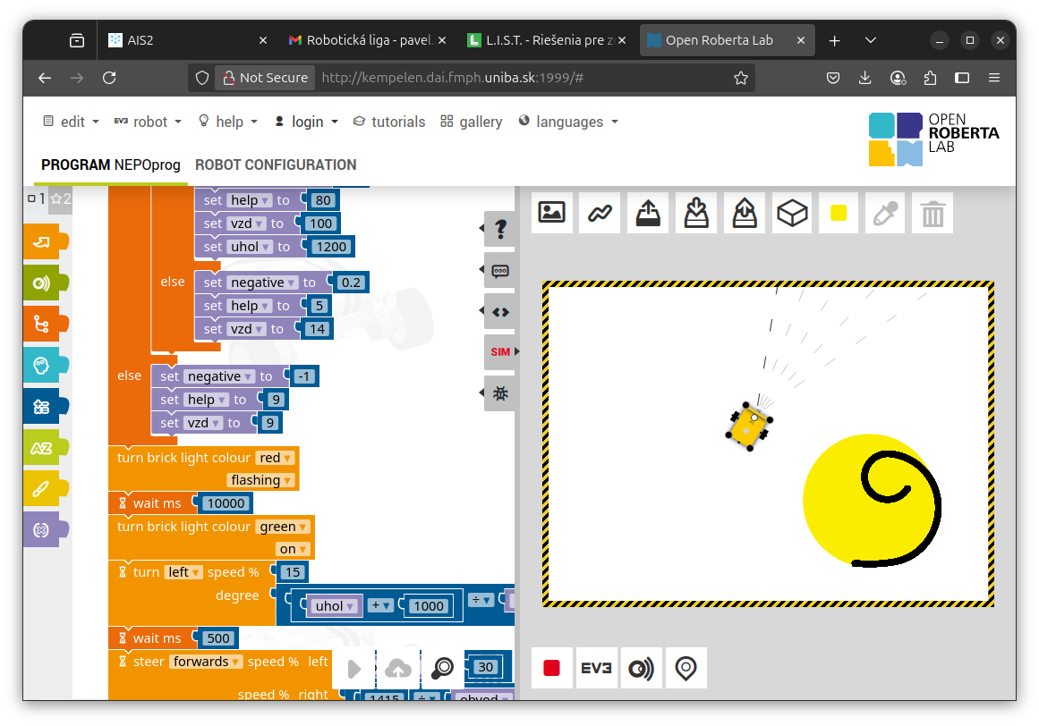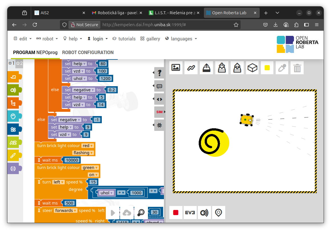 1. Zaujímavé riešenie! Vidím rôzne veľkosti špirál automaticky zistené podľa obvodu, výborne! Program využíva premenné, podmienky, cykly, výborne! Rezervy vidím v ešte lepšej štruktúre programu - namiesto zdĺhavej postupnosti príkazov by sa mal pohyb nejak vypočítavať. Nameraný obvod by bolo dobré použiť nejak vo vzorci, nielen v podmienke. Špirálky by potom mohli byť trochu pravidelnejšie, menej skosené a viac vycentrované na stred kruhu, v ktorom sú. Skúšal som to aj pre priveľmi veľký kruh, ktorý sa ale stále vošiel do plochy simulátora - tam už výpočet nevyšiel cekom - najskôr robot začal kresliť a otáčať sa opačným smerom, až neskôr sa zasa zatočil proti smeru hodinových ručičiek. Nevadí, aj takto je to pekný výsledok! 2. Za úlohu Robot opravár získavate 3b. Veľmi pekné riešenie. :) 3. Síce som si myslel, že tá špirála skončí v strede, ale nie je to podmienka, takže vaše riešenie spĺňa všetko, čo treba. 4. Veľmi pekné riešenie. :-) 5. Mám pocit, že špirály sa postupne zlepšovali. Program však fungoval super. Bol použitý senzor na vyhľadanie, bol prejdený obvod aj nakreslená špirála. Boli tri rôzne situácie. Nemám čo vytknúť. Skvelé.