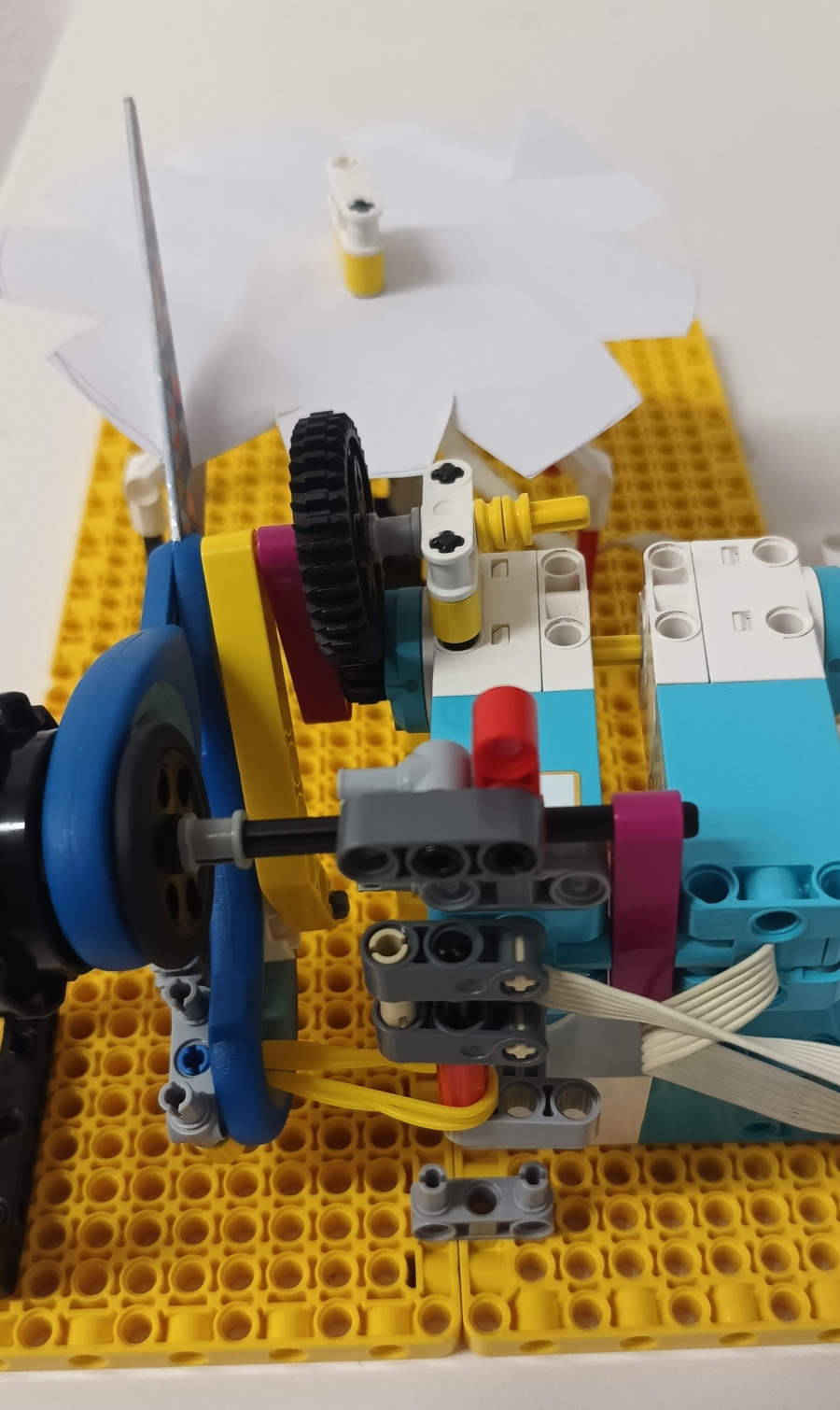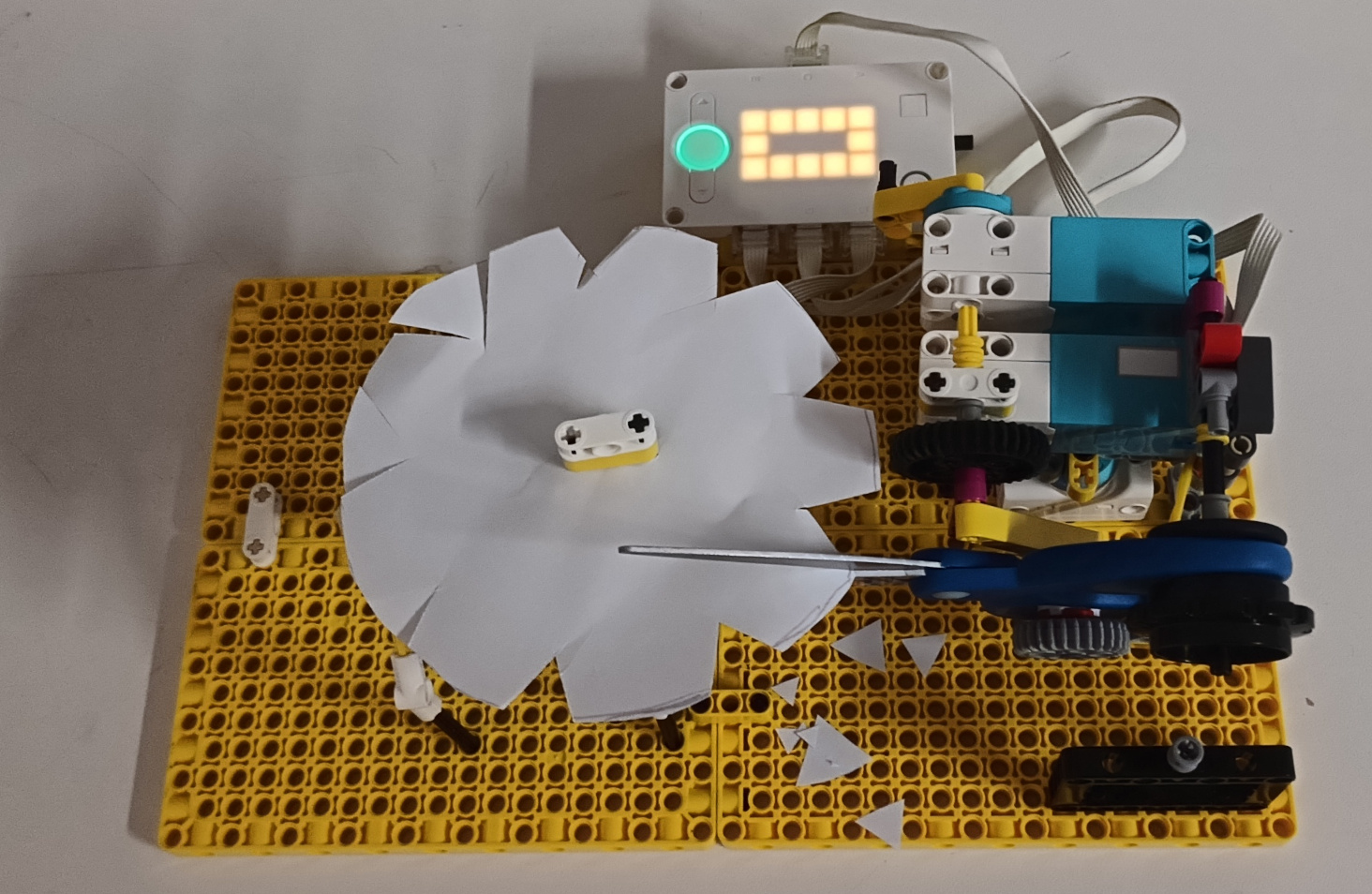 Robot slúži na vystrihovanie rôznych vzorov na papier. Má 4 motory, jeden slúži na otáčanie papiera, druhý na otváranie a zatváranie nožníc, tretí ako podpora pri zatváraní nožníc, a štvrtý na otáčanie nožníc do strán. Štvrtý motor ostal však nepoužitý, z dôvodu, že nožnice boli až príliš dlhé a pri otáčaní by zavadzali. Pôvodne ale mal slúžiť na vystrihovanie, rôznych šírok a strán, ale nahradili sme ho jednoduchým stopnutím a ručným prevrátením papiera. Gumičky sú na nožniciach, aby tlačili nože nožníc o seba a tým lepšie strihali. Po spustení programu sa vyberá smer stlačením tlačidiel doprava/doľava, takisto sa používajú po tom čo sa papier ručne prevráti. Ak by sa náhodou pri strihaní papier zasekol, robot sa dá zastaviť podržaním tlačidla smeru ktorým bol spustený, a papier sa potom dá napraviť. Potom sa program jednoducho spustí daľším stlačením tlačidla. Video je 3x zrýchlené.