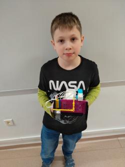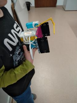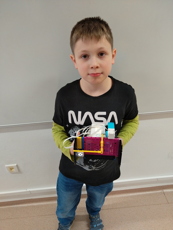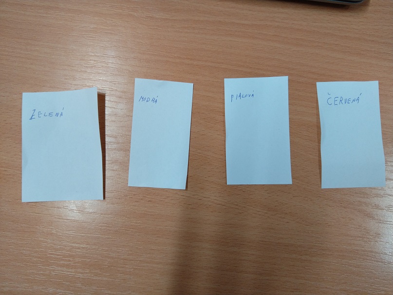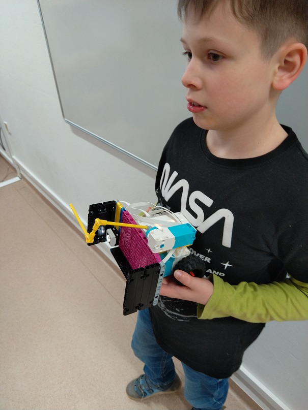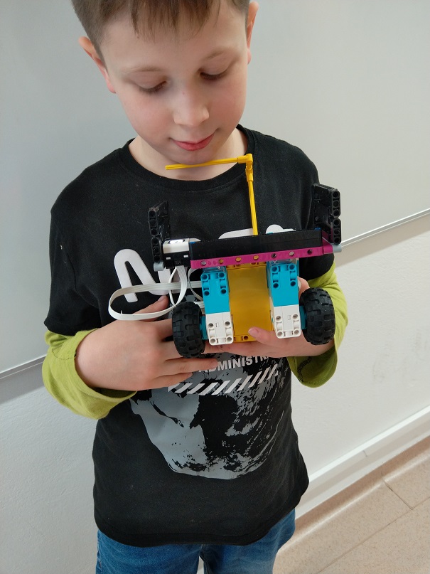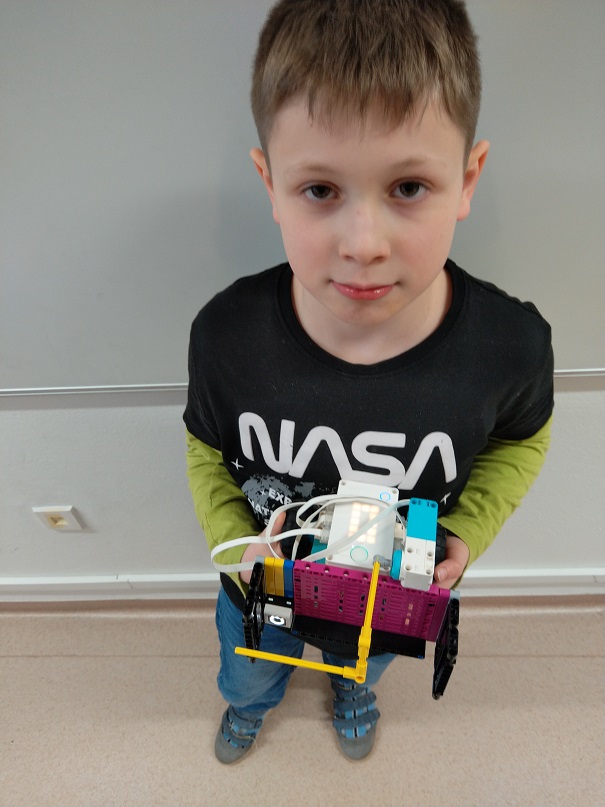 Robot ide najprv dopredu 20 cm potom sa otočí aby dostal farebnú kocku na svetelný senzor. Robot zistil farbu a išiel dopredu, cúval, alebo sa len otočil na mieste podľa toho o akú farbu išlo. Potom išiel rovno ku papieriku. Rukou sme ho premiestnili na ďalšiu jazdu/štart a stlačili ľavé alebo pravé tlačidlo. Kvôli krivej podlahe sme ho museli občas rukou dotočiť.