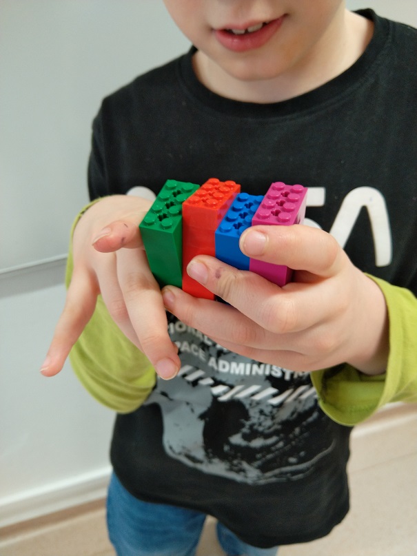 Robot mal usporiadať kocky v poradí zelená, modrá, fialová, červená.