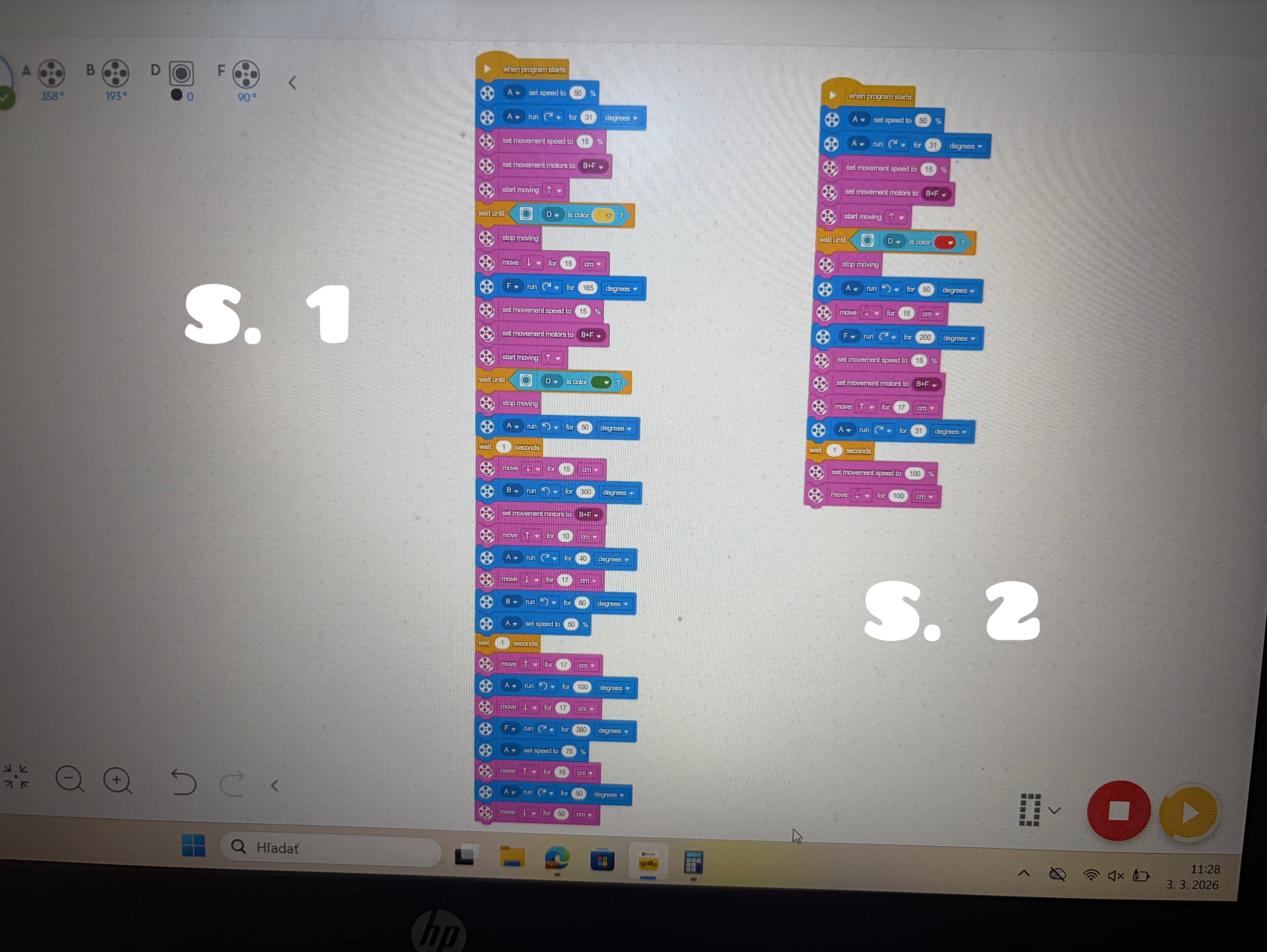 1. Hm, opis funkcie teda nebol veľmi podrobný a aj program by sme uvítali na správnom mieste a nie ako fotku. Spôsob 2 sa vám myslím veľmi nevydaril, spôsob 1 je celkom dobrý, ale potrebovali by sme vidieť aspoň jeden ďalší pokus. Takto je to len také polovičné riešenie. 2. Nápad zaujímavý, ale nedotiahnutý. 3. Bolo by skvelé, keby sa vám nabudúce podarilo aj do popisu dať kúsok textu, aby sme vedeli prečítať a lepšie rozumieť vašim myšlienkam a ideám za celou úlohou. Lebo očividne neboli kocky presunuté na miesta kam mali a veľmi by som privítala, keby ste nám vo videu ozrejmili, ako hodnotíte tento váš výsledok. Taktiež neviem, ako majú byť kocky usporiadané správne. Lebo pri týchto farbách to nie je úplne zrejmé. Apsoň pre mňa nie. 4. Nebuďte skúpi na popis a pridajte zopár viet, patrí to k dobrému bontónu. :-) Chválim, že ste ukázali dva pokusy, avšak obidva sú natvrdo nadrôtované. Program by mal sám zistiť v akom poradí sú kocky na stole usporiadané a podľa toho vykonať také akcie, aby ich usporiadal. Beriem to ako dobrý začiatok - vymysleli ste konštrukciu a ako sa kocky dajú mechanicky usporiadať - výborne! a už potrebujeme iba pridať logiku celého programu. Dúfam, že sa nabudúce pokúsite o niečo všeobecnejšie riešenie!