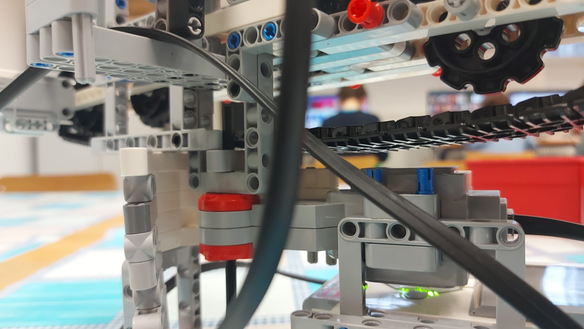 Stojan obsahuje náš EV3 Hub, veľký motor a dve „nožičky“. Konštrukcia spája všetky súčiastky stojanu a vďaka tomu je robot pevnejší a stabilnejší. Veľký motor je vmontovaný do konštrukcie tak, aby zabezpečoval vodorovnú rotáciu dopravníkového pásu, podobne ako železničná točňa zabezpečuje rotáciu koľajníc.