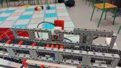 Druhou časťou je už spomínaný dopravníkový pás. Ku veľkému motoru z časti stojan je primontovaný drobný rámik a na ňom je vytvorená vodorovná konštrukcia z podlhovastých súčiastok Zboku tejto konštrukcie je upevnený senzor a do nej sú vsadené ozubené kolesá, na ktorých je napnutý už samotný pás. Jedno z týchto kolies je poháňané malým motorom a tým aj celý pás. Na páse sú vyhradené červenými gumovými zarážkami tri samostatné úseky, ktoré sme nazývali priehradkami. V nich sa na začiatku každého usporadovania nachádzajú triedené kocky. Následne je ďalšími tromi gumovými zarážkami vyznačený úsek, na ktorom pri začiatku triedenia sníma senzor. Popri páse sme vytvorili zo zvyšných rámikov bariéru, alebo ak chcete, môžem to pomenovať aj mantinel