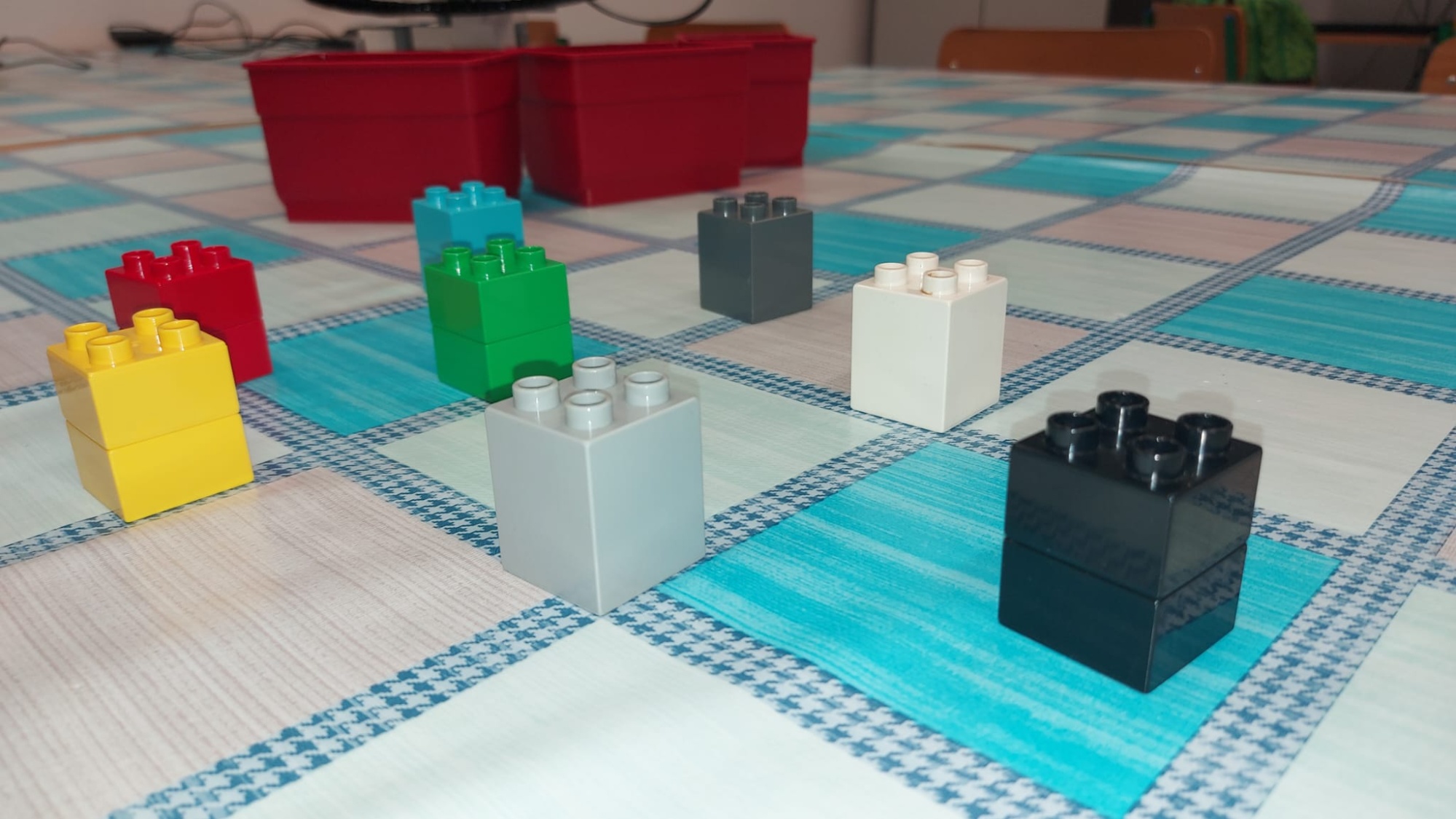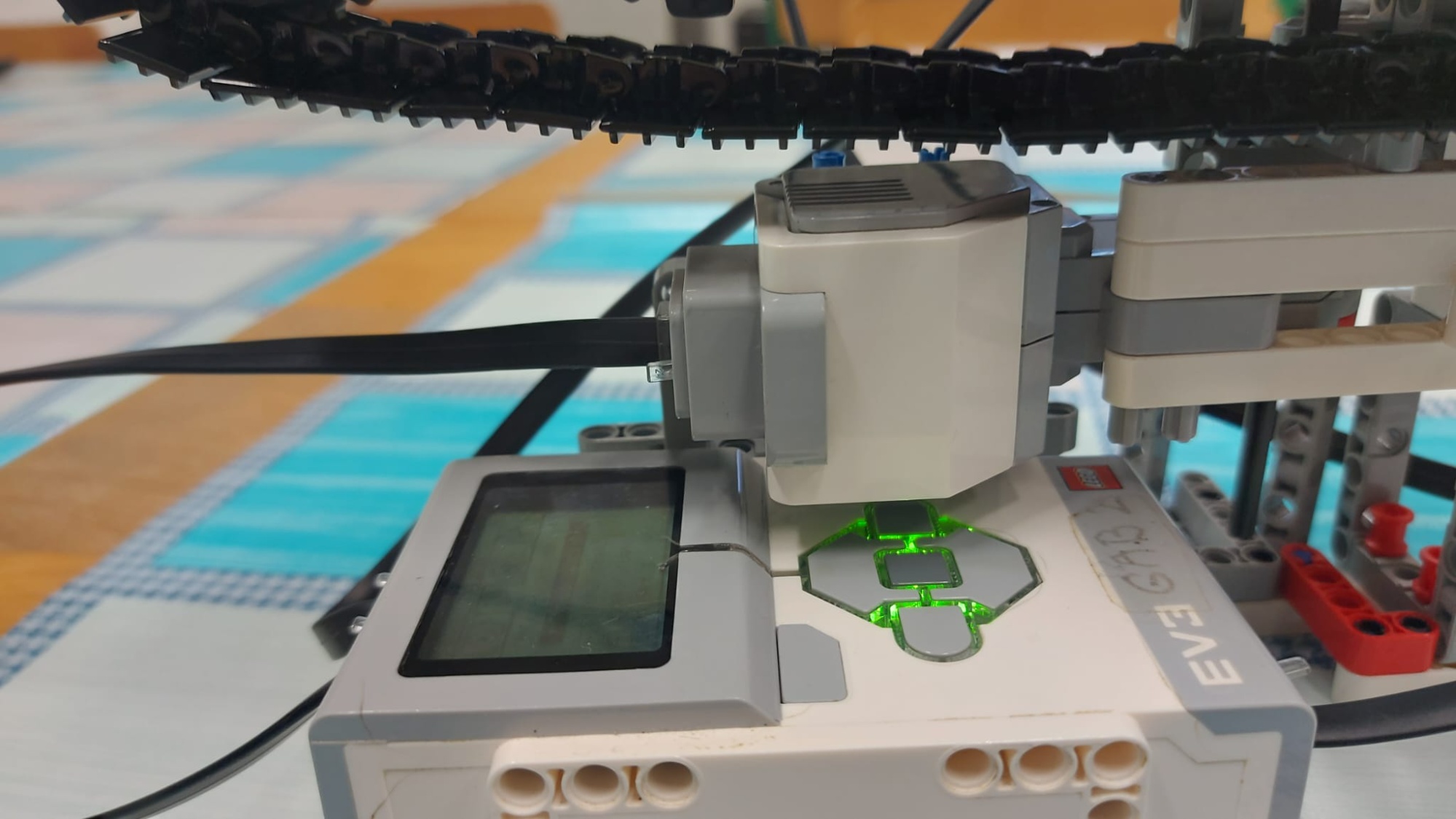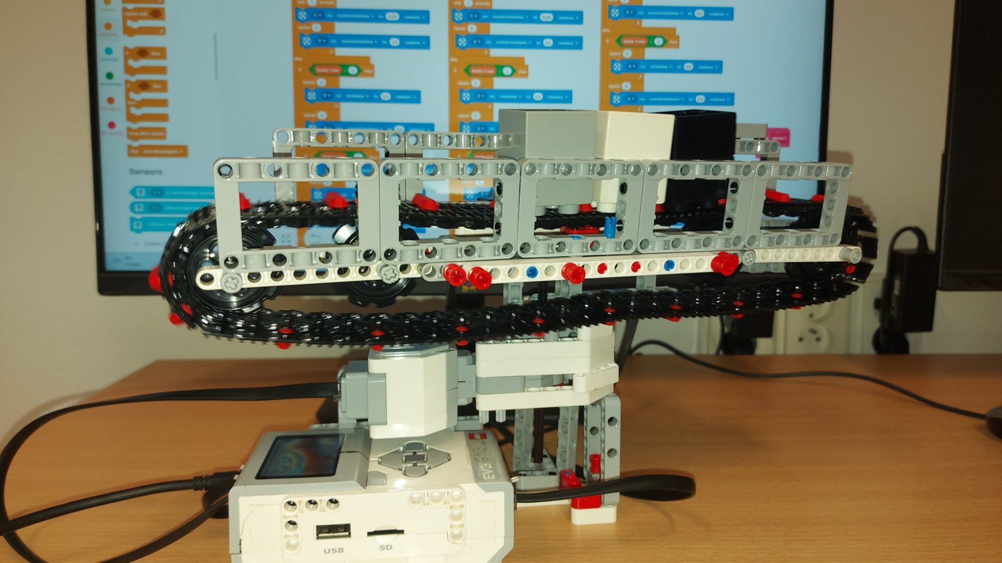 Rozhodli sme sa vypracovať robota s popisom na úlohu číslo 2 zo zadania 1. Náš robot má teda vedieť usporiadať kocky od najsvetlejšej po najtmavšiu. Rozhodli sme sa využiť dva motory, jeden menší a jeden väčší. Okrem toho obsahuje náš robot pohyblivý pás a senzor, ktorý sme v tomto prípade využili na snímanie intenzity odrazeného svetla, pretože čím je materiál tmavší, tým viac svetla pohlcuje, a čím je svetlejší, tým viac svetla odráža.