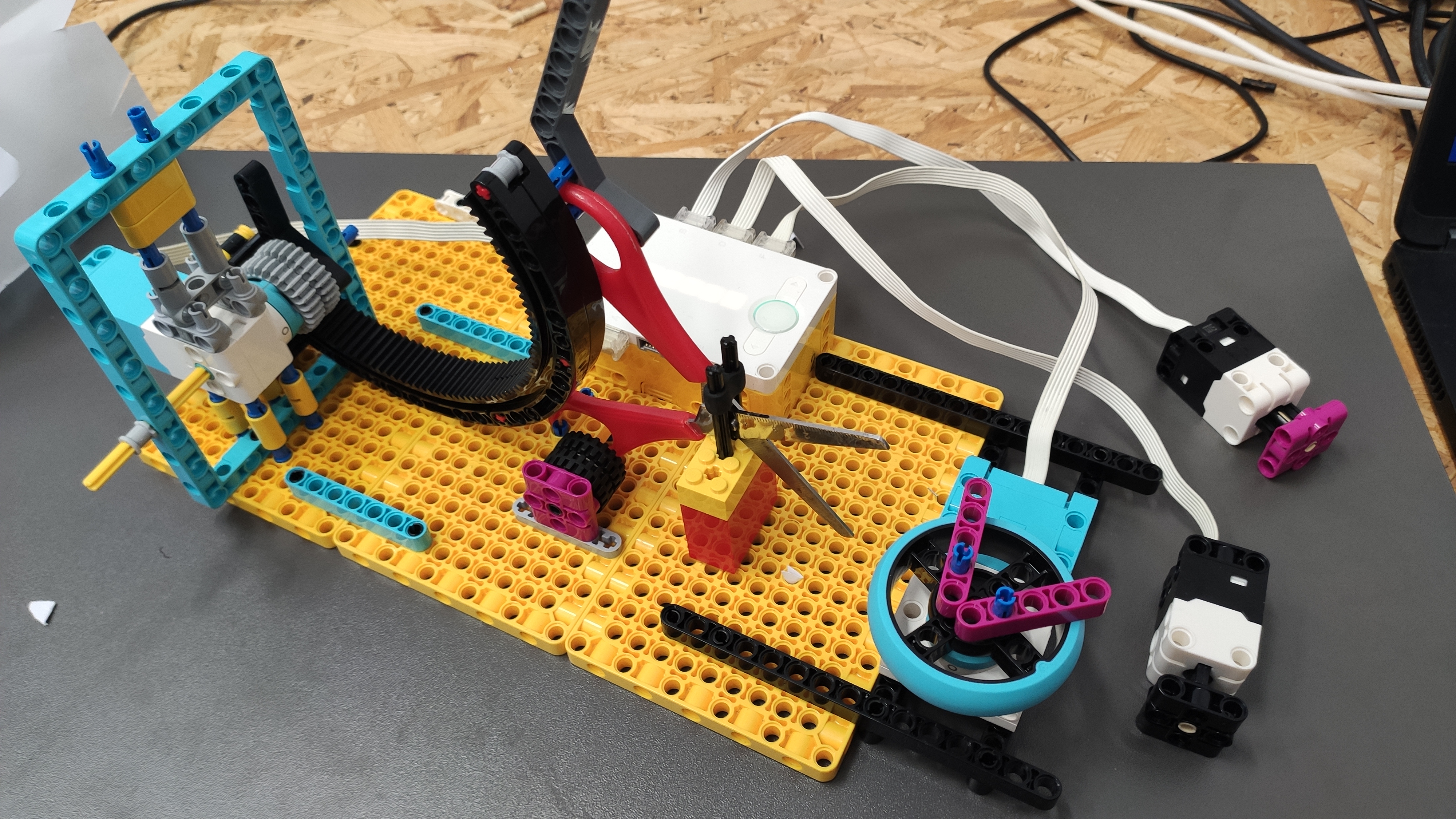 Tlakový senzor vo výstupe D s čiernou hlavicou po stlačení začne točiť väčším motorom a po pustení sa motor zastaví. Nožnice majú pri spojovej časti úchop vyvýšený na lego kockách.
