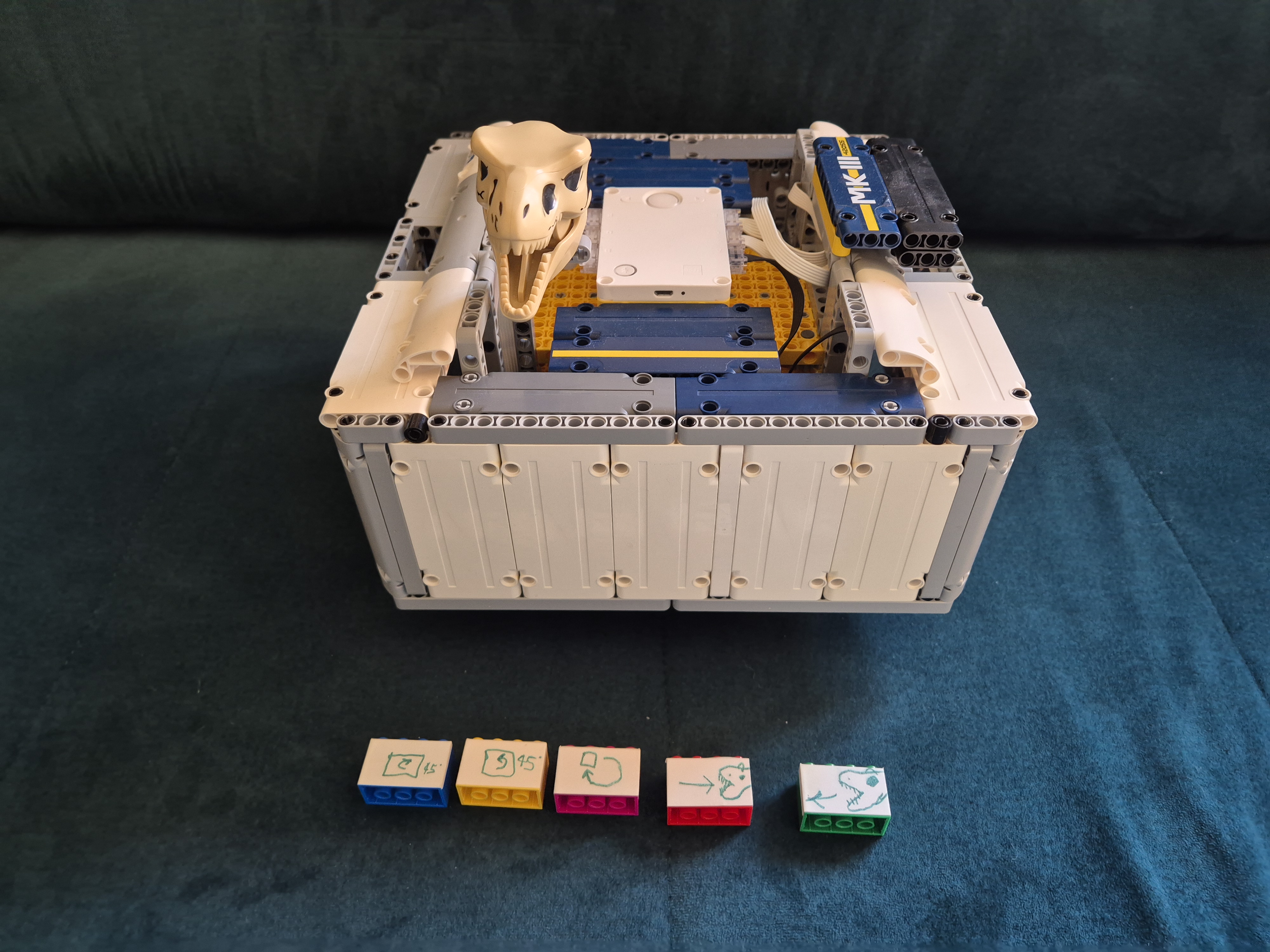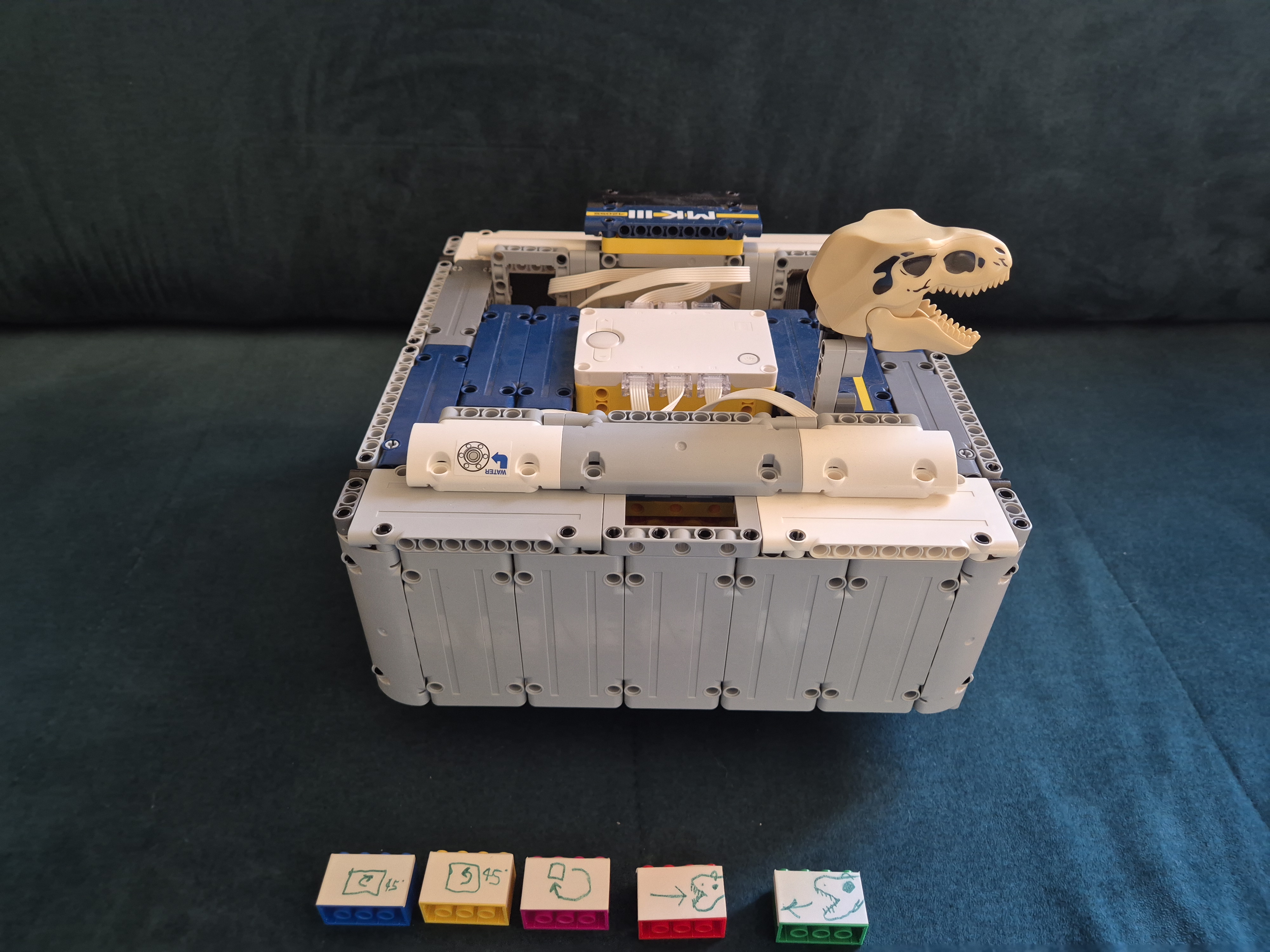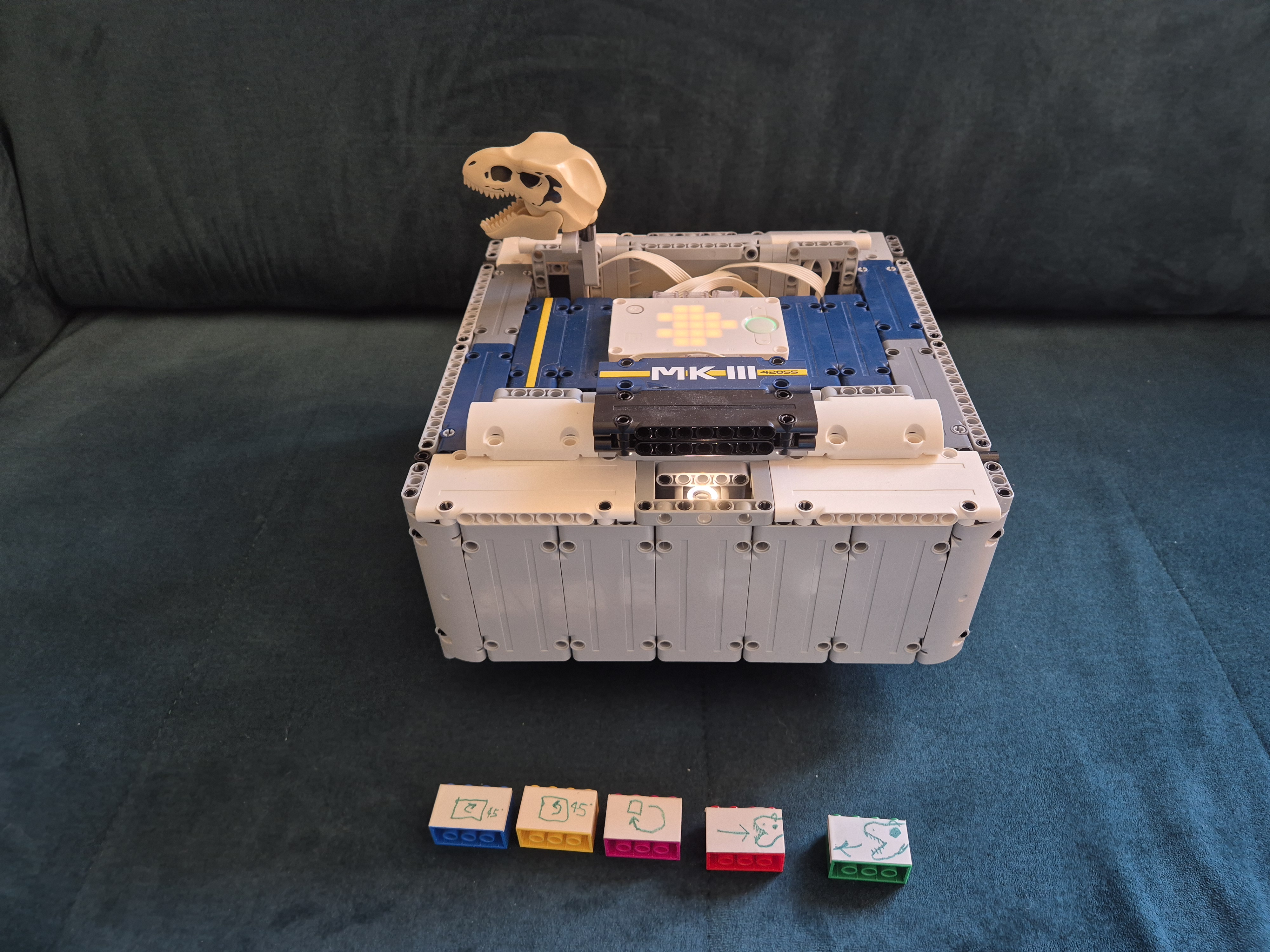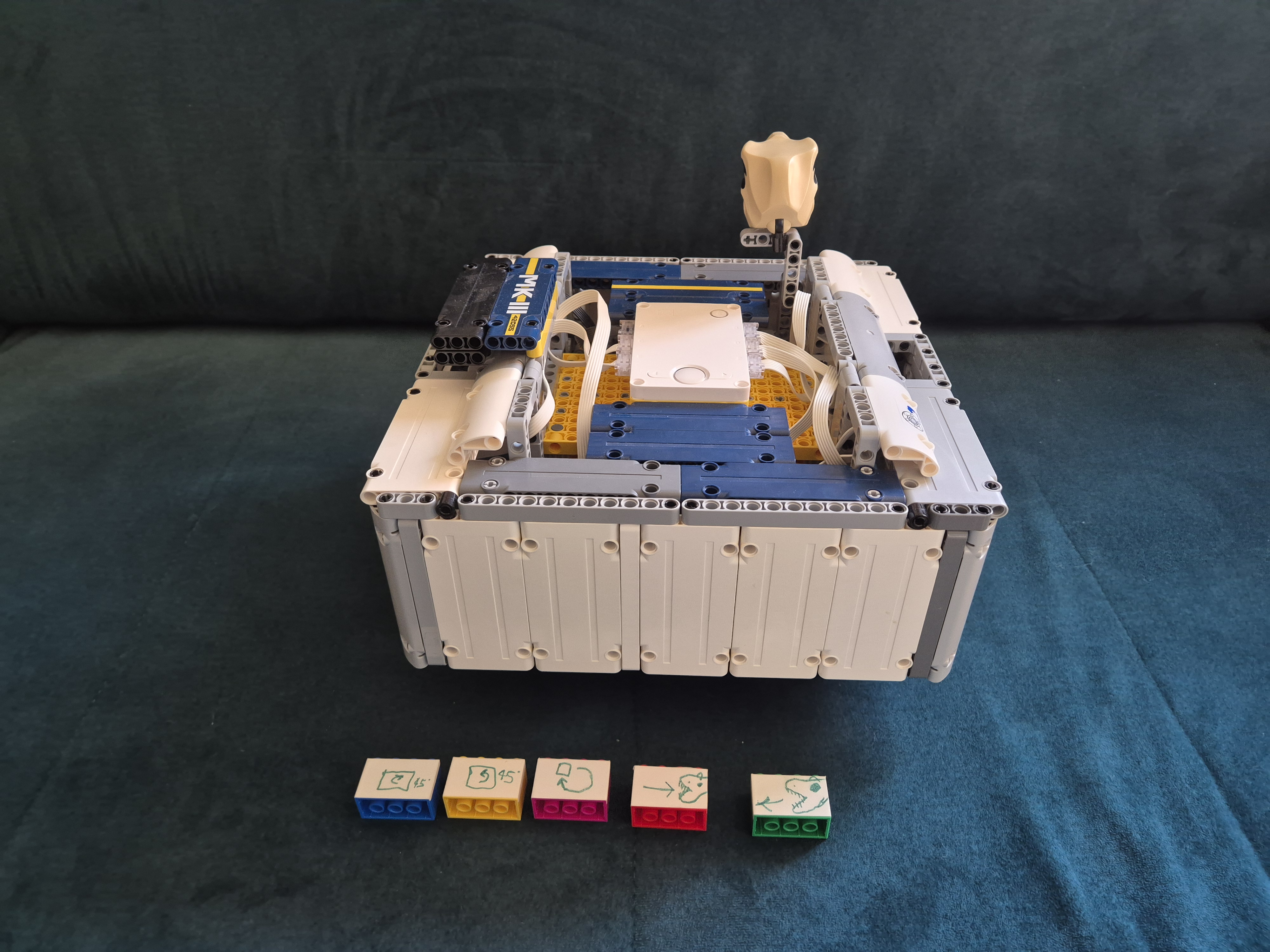 Náš MK3 robot sa skladá z jednej SPIKE PRIME kocky, dvoch veľkých motorov, troch stredných motorov, jedného farebného senzoraa veľa ďaľších kociek. Po spustení programu robot zisťuje, aká farba je na farbovom sezore. Podľa toho spustí jeden z piatich rôznych pohybov: otočenie kolies o 45° do jednej alebo druhej strany, pohyb dopredu alebo dozadu alebo pohyb do 8-uholníka. Po dokončení určeného pohybu robot čaká na ďalší povel. Keďže farbový senzor svietil do očí, čiastočne sme ho zakryli.