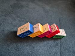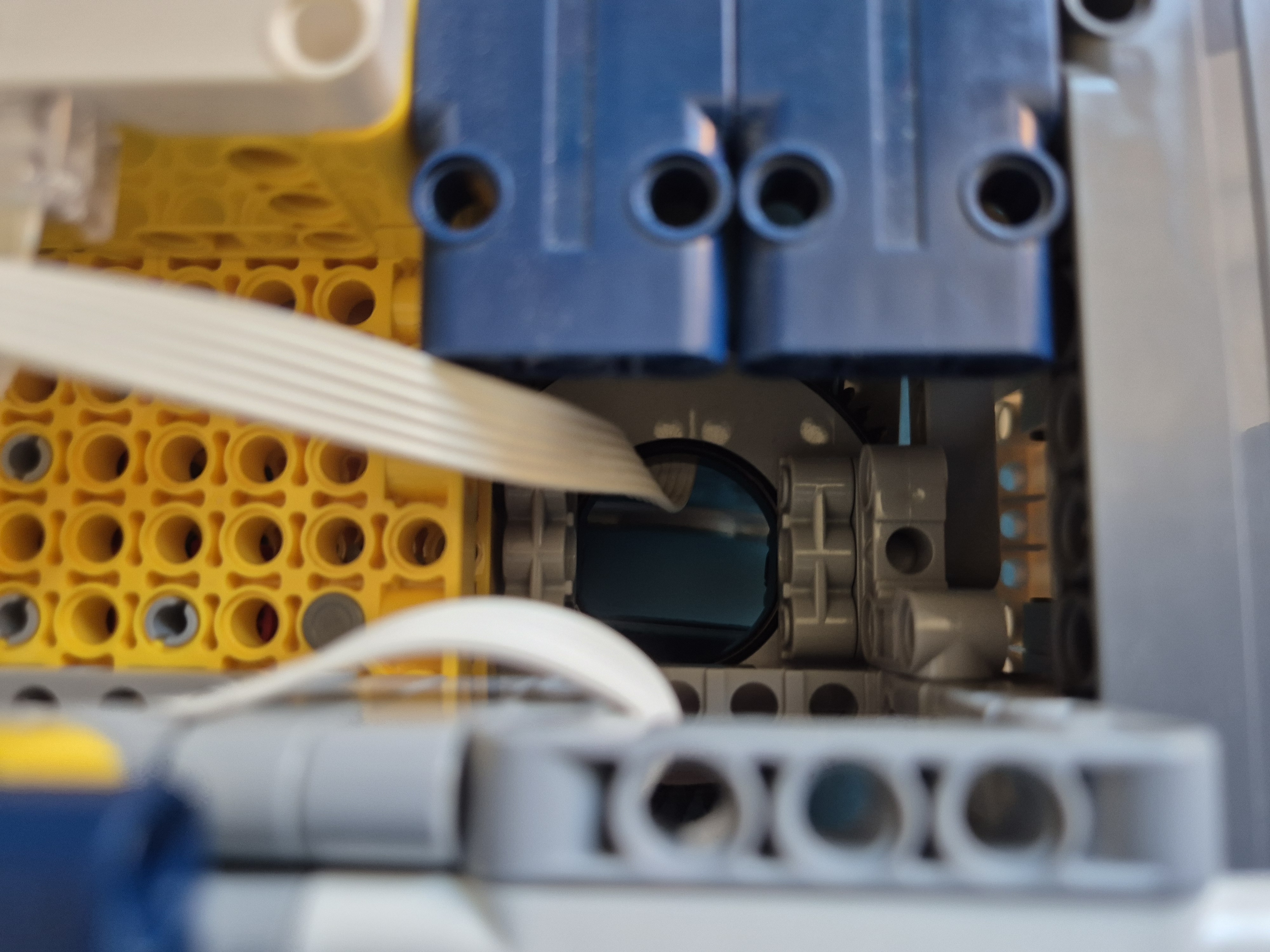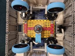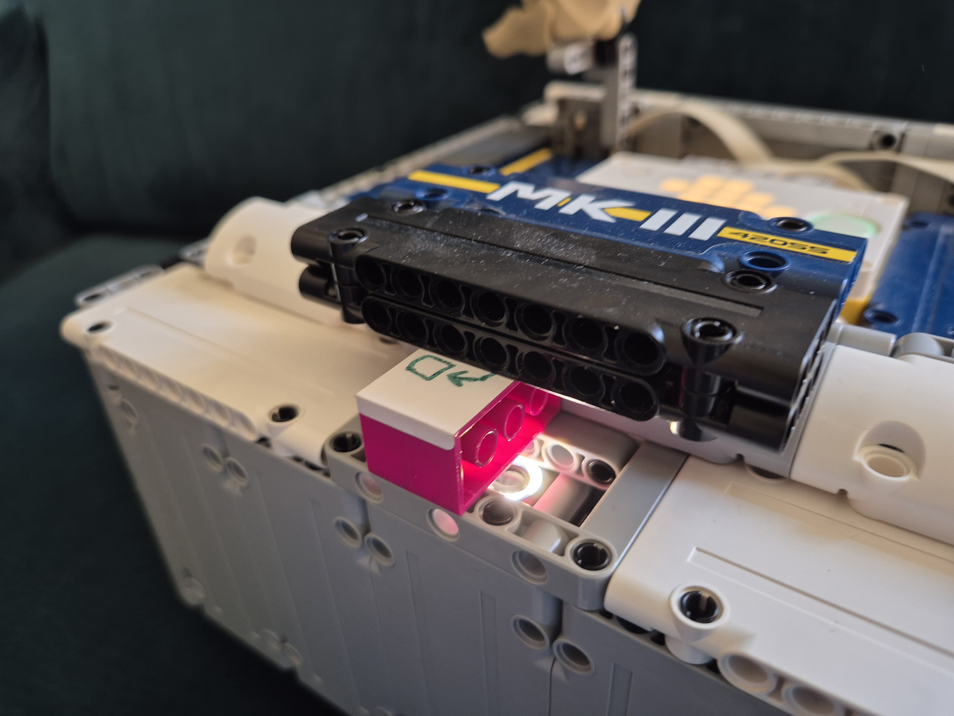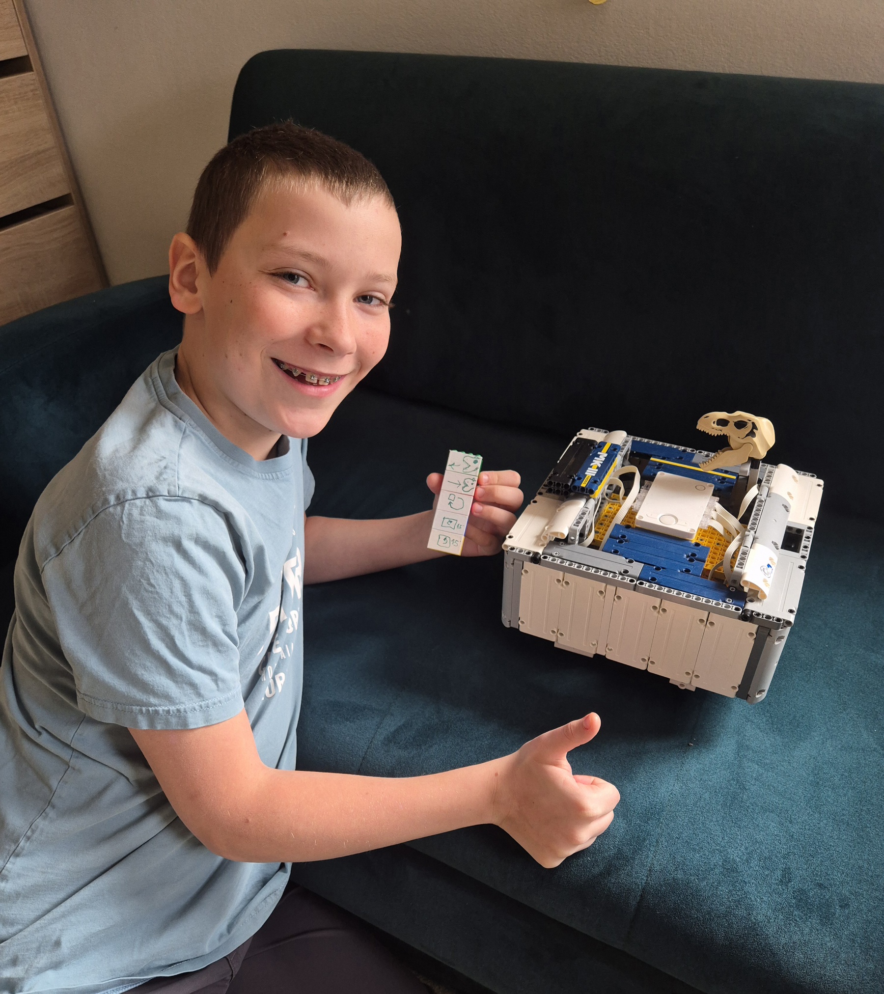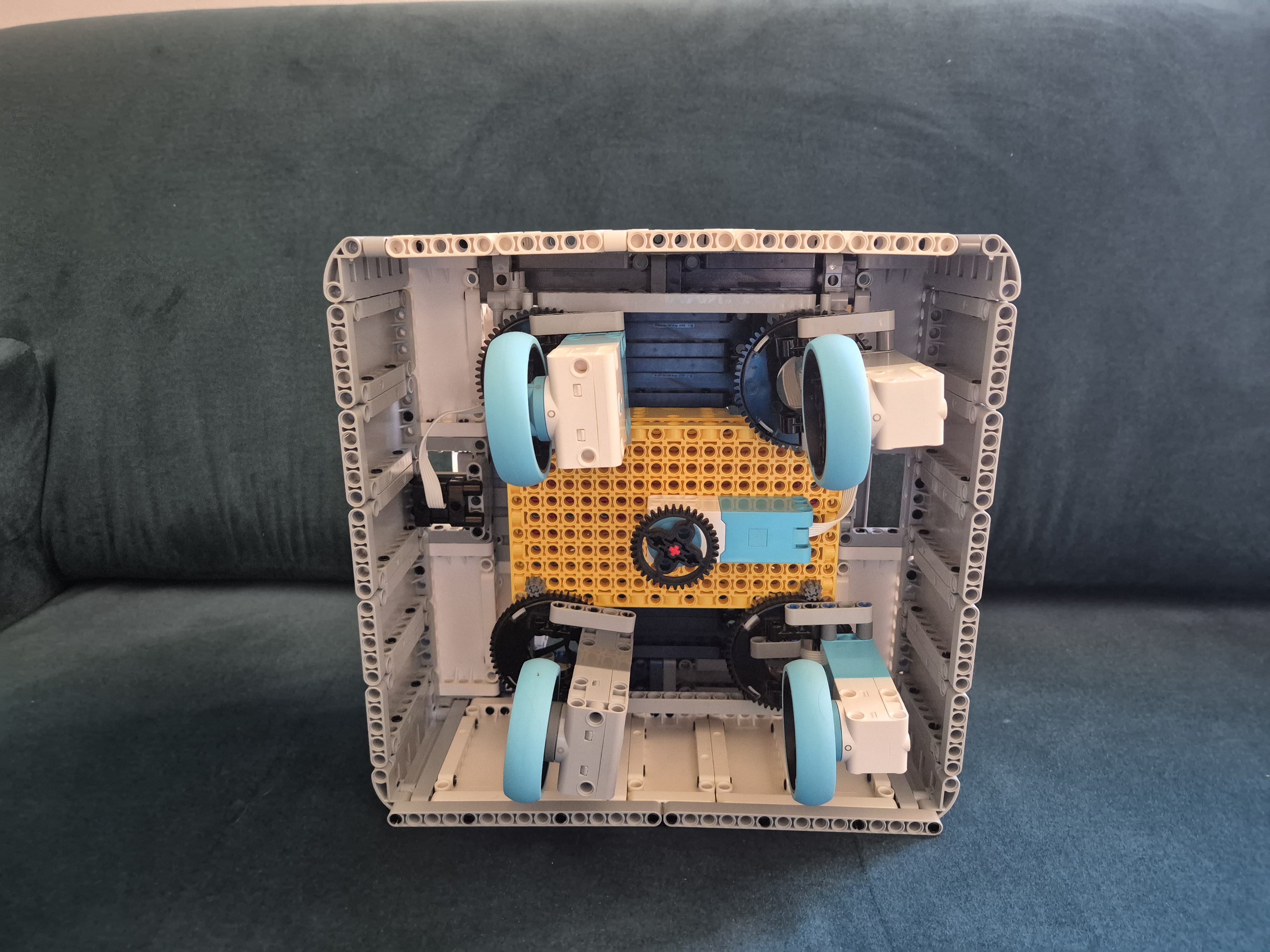 Náš MK3 robot sa skladá z jednej SPIKE PRIME kocky, dvoch veľkých motorov, troch stredných motorov, jedného farebného senzoraa veľa ďaľších kociek. Po spustení programu robot zisťuje, aká farba je na farbovom sezore. Podľa toho spustí jeden z piatich rôznych pohybov: otočenie kolies o 45° do jednej alebo druhej strany, pohyb dopredu alebo dozadu alebo pohyb do 8-uholníka. Po dokončení určeného pohybu robot čaká na ďalší povel. Keďže farbový senzor svietil do očí, čiastočne sme ho zakryli.
