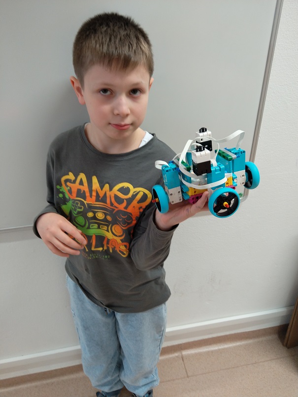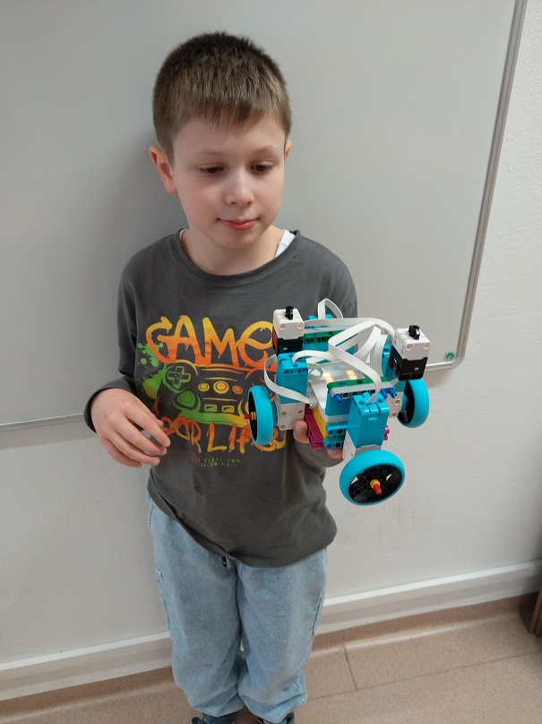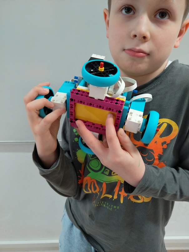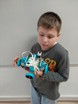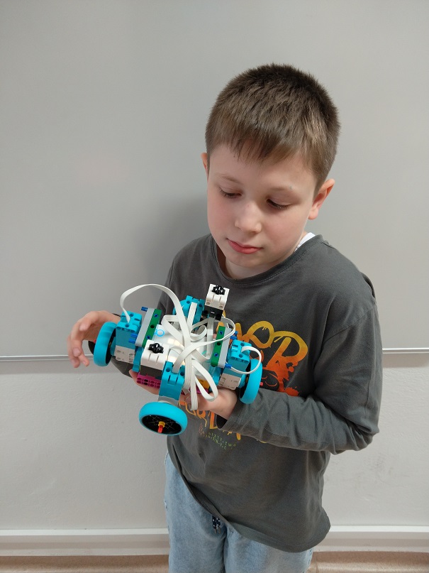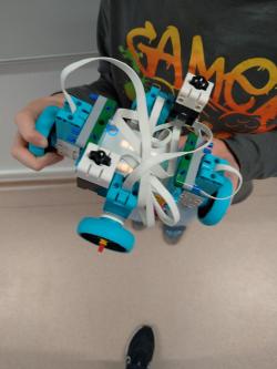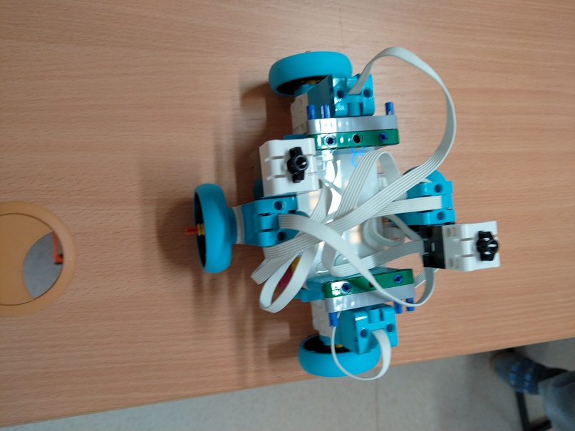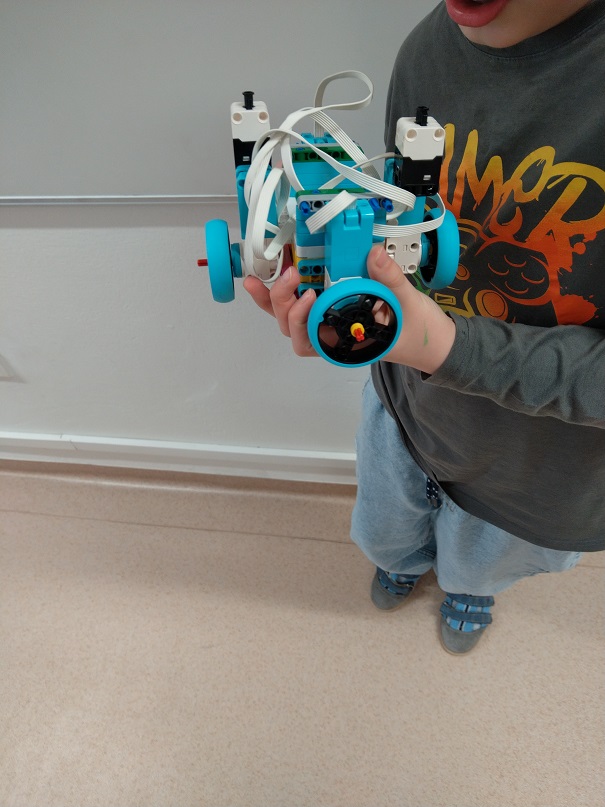 Robot má štyri motory a kolesá. Dva dotykové senzory: jeden na zvýšenie premennej číslo a druhý na zníženie premennej číslo.