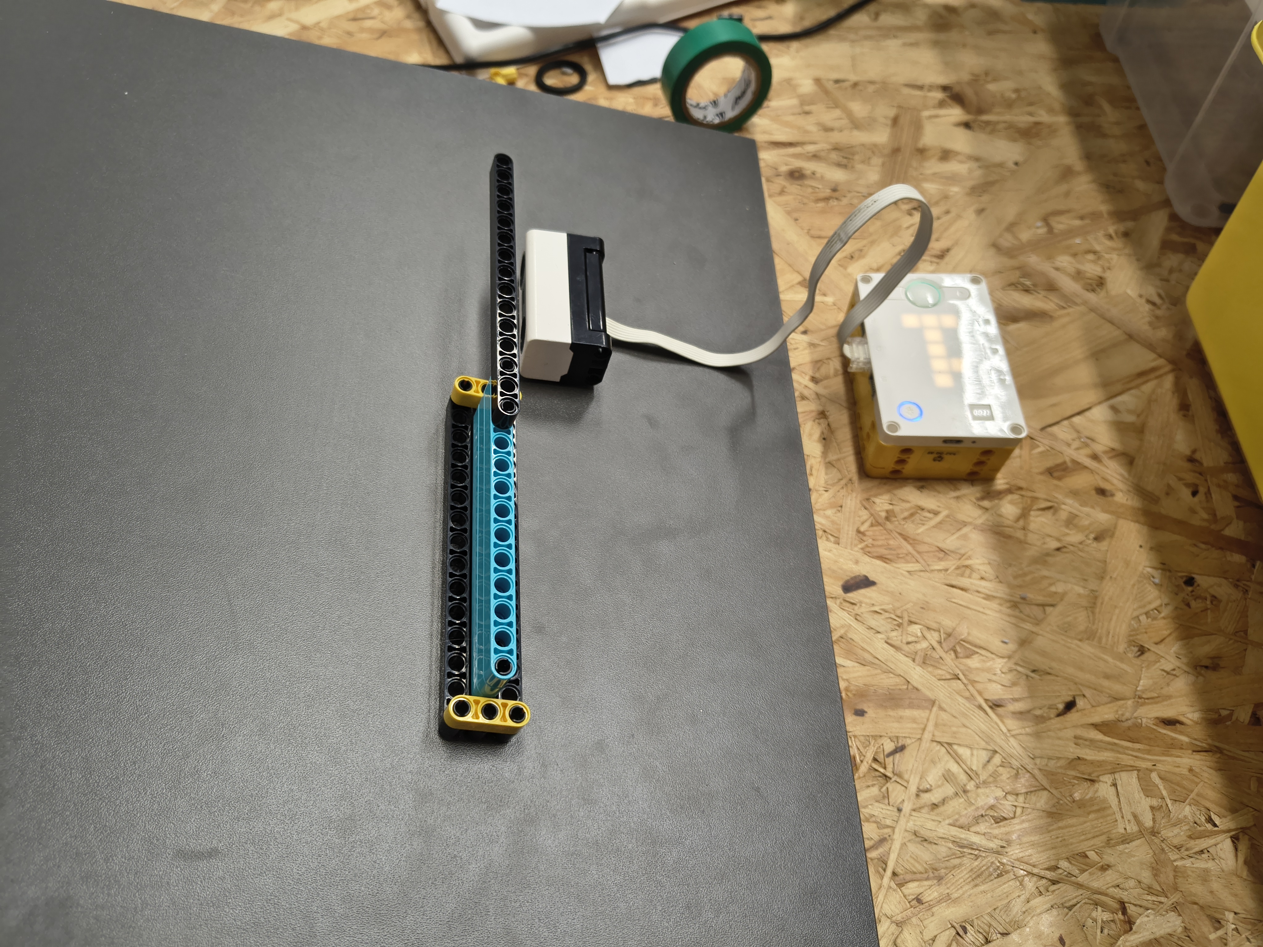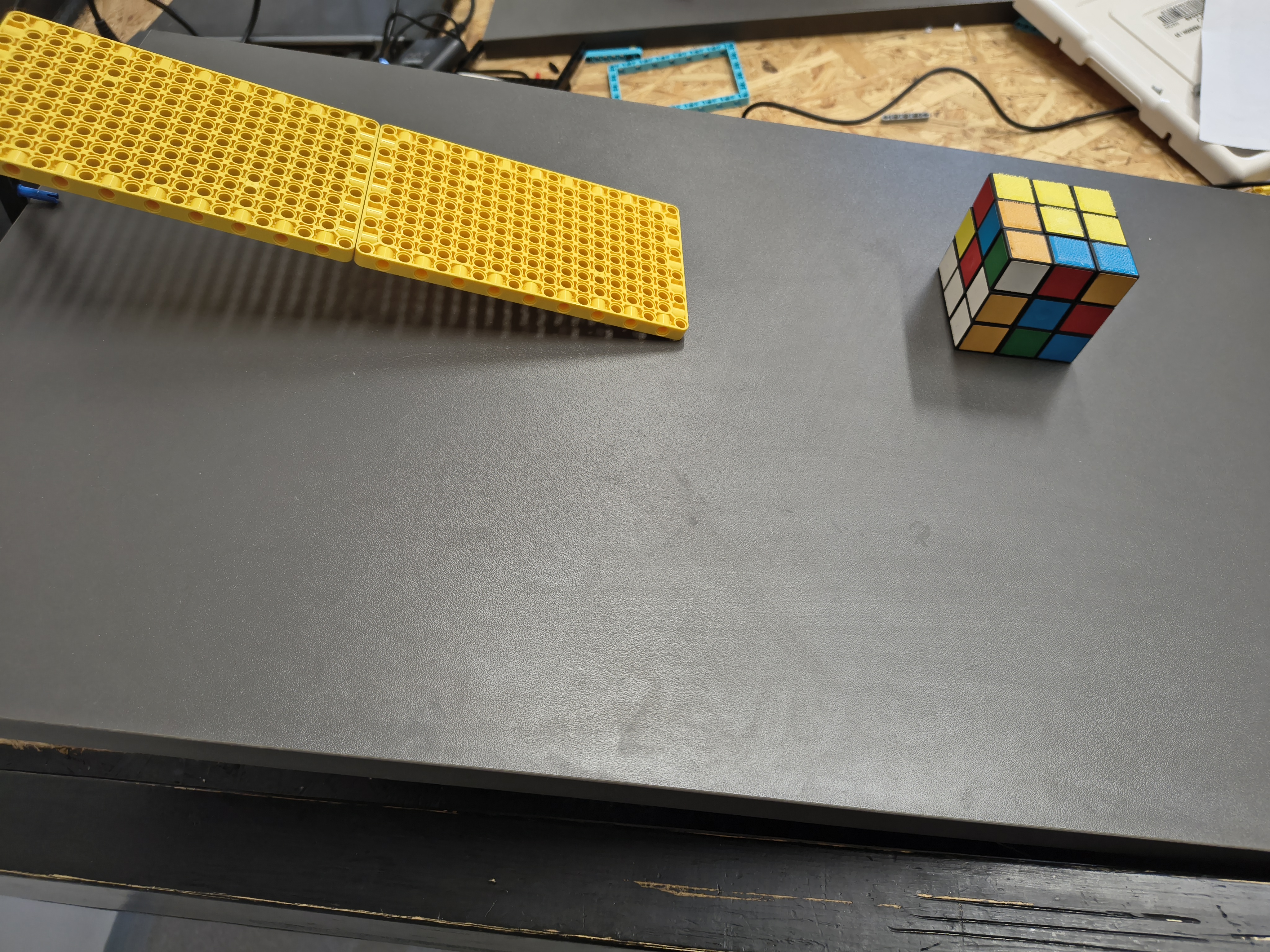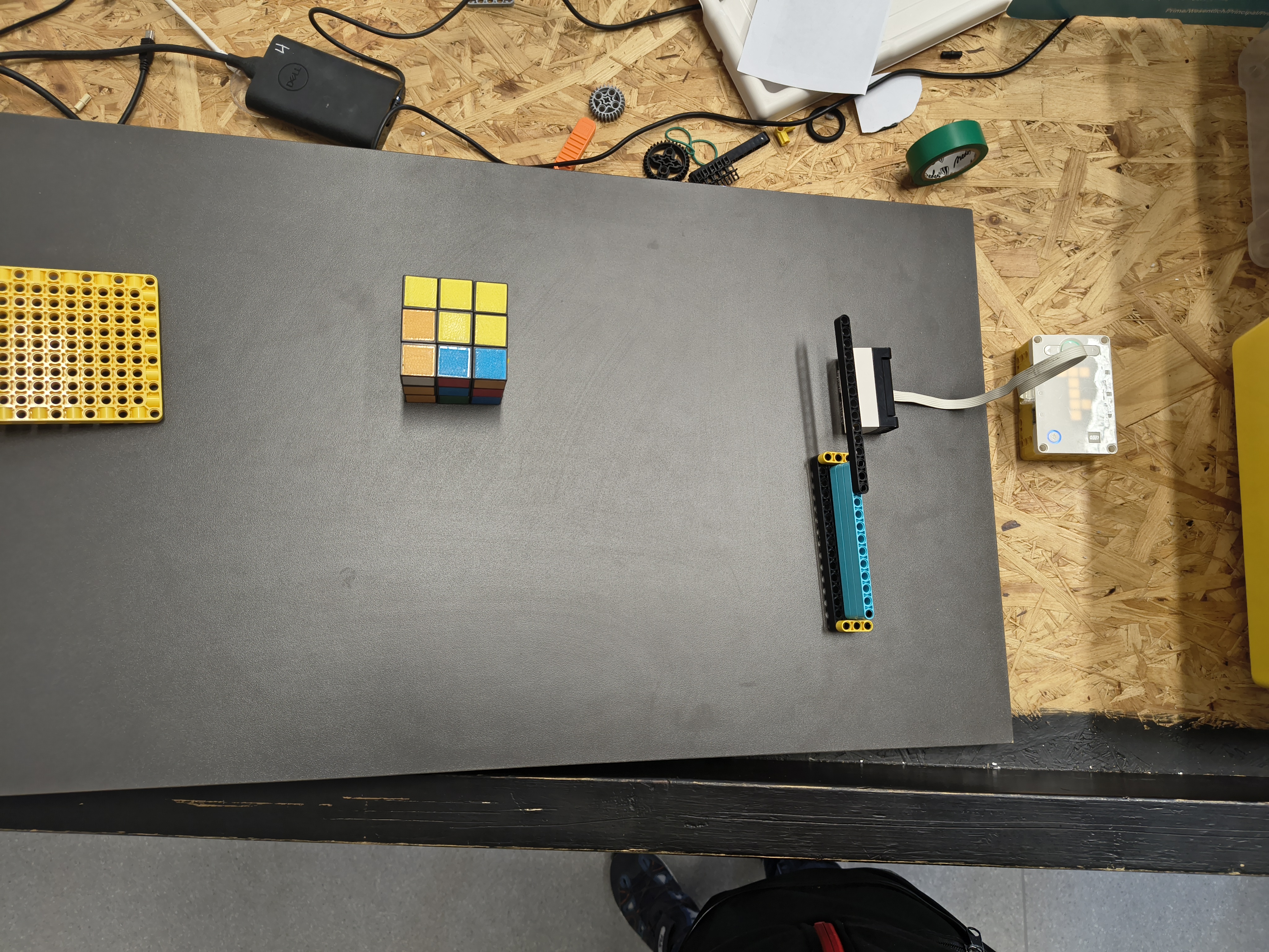 Náš robot sa skladá z viacerých častí. Prvou je ultrazvukový senzor, ktorý meria "koeficient trenia". Druhou časťou je plošina, po ktorej sa šmýka Rubikova kocka. Poslednou časťou je samotná Rubikova kocka, ktorá je oblepená rôznymi materiálmi. Použili sme lepiacu pásku, 3M Dual Lock a časť kocky sme nechali aj s jej pôvodným povrchom.