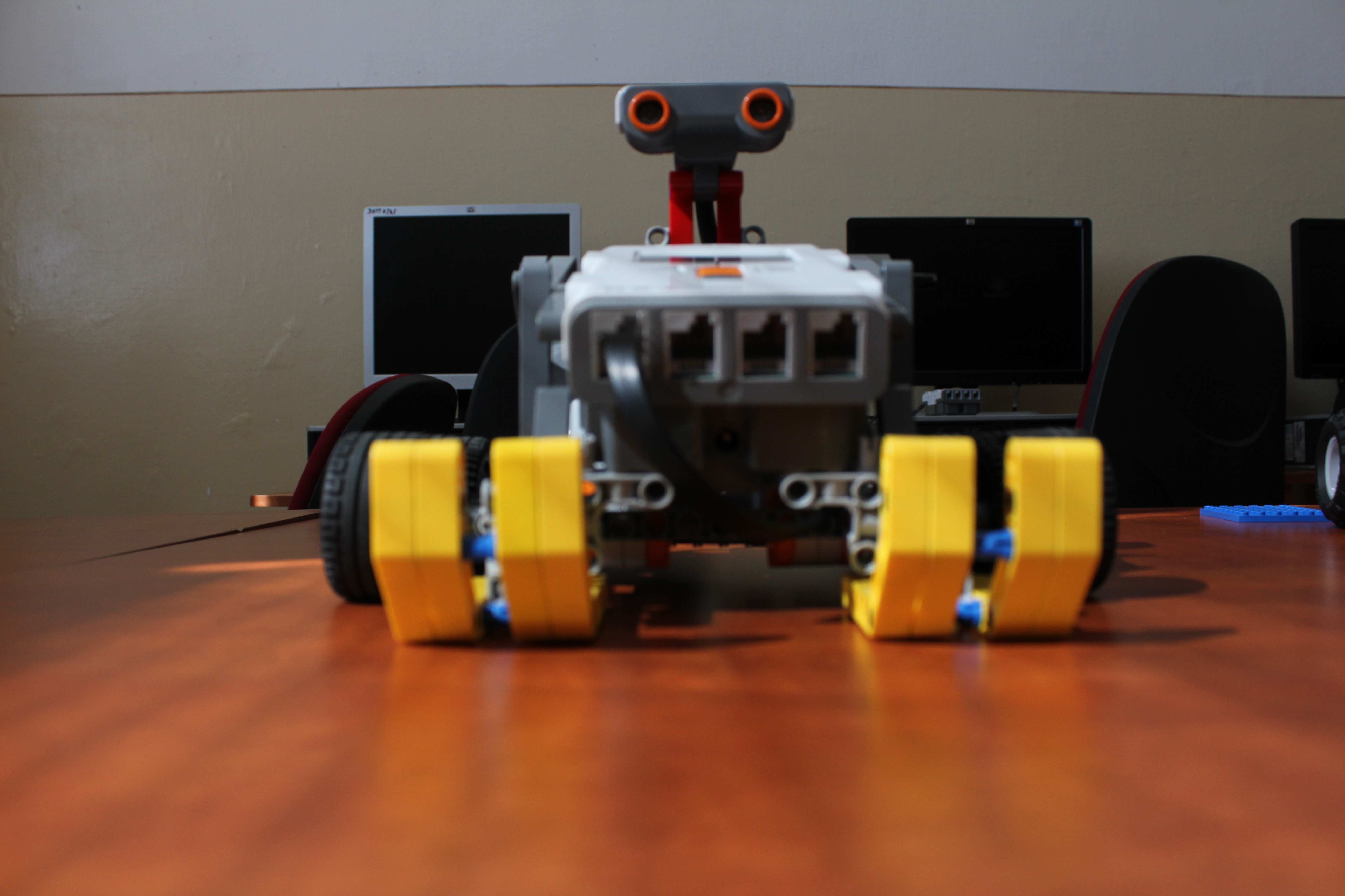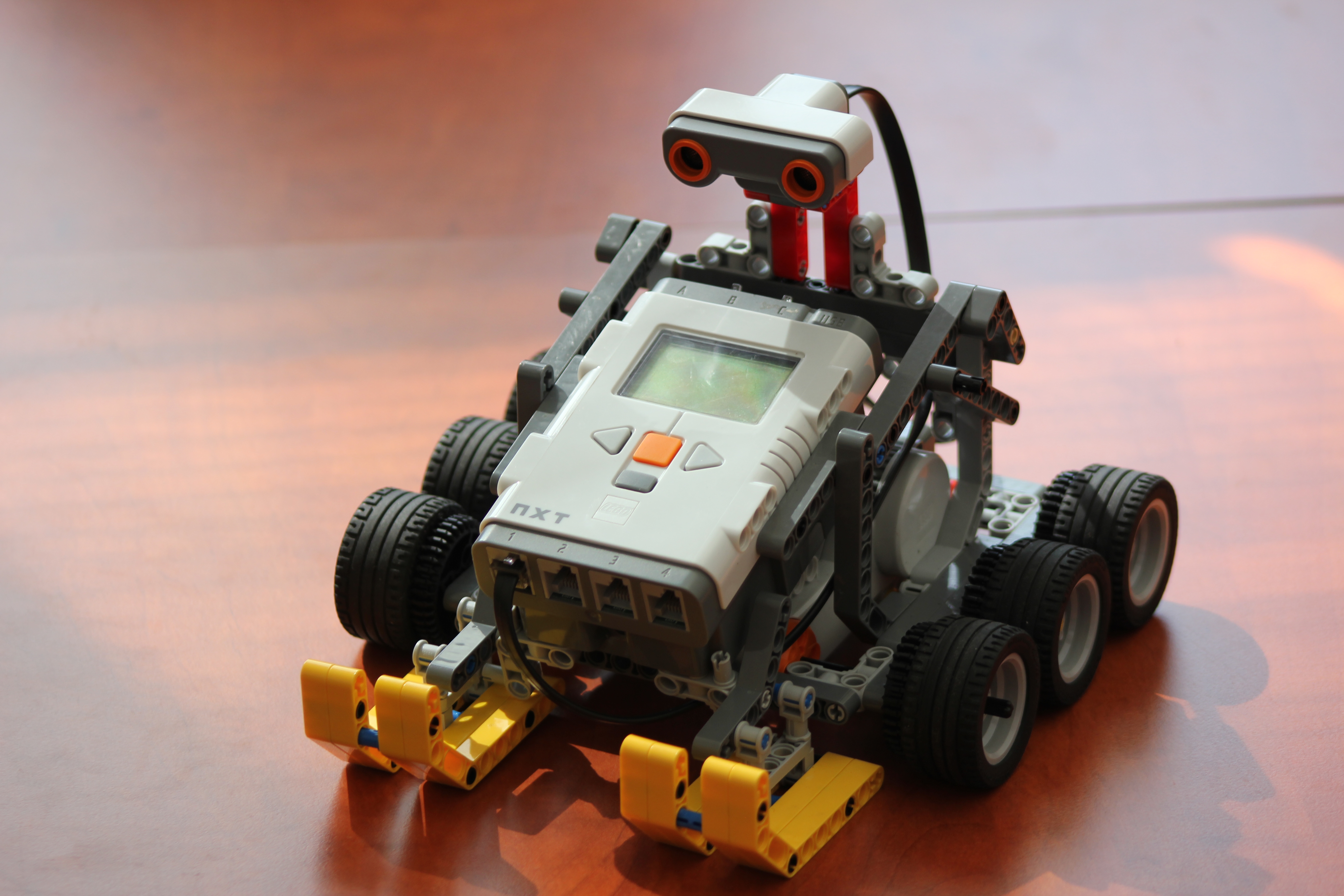 Na robota sme použili NXT kocku, 6 kolies s pohonom, 2 motory, ktoré boli prepojené s kotúčmi aby zaberalo všetkých 6 kolies.