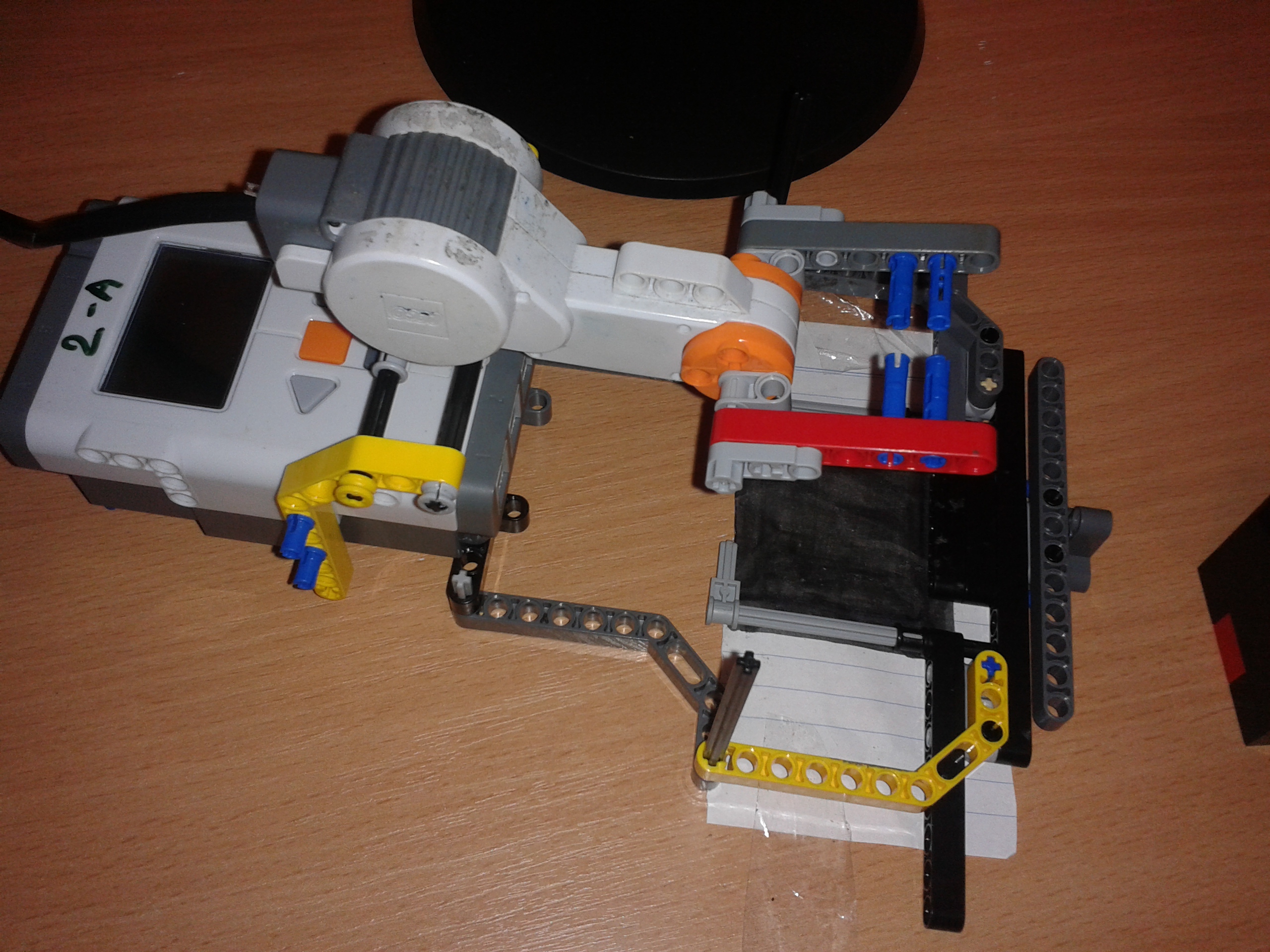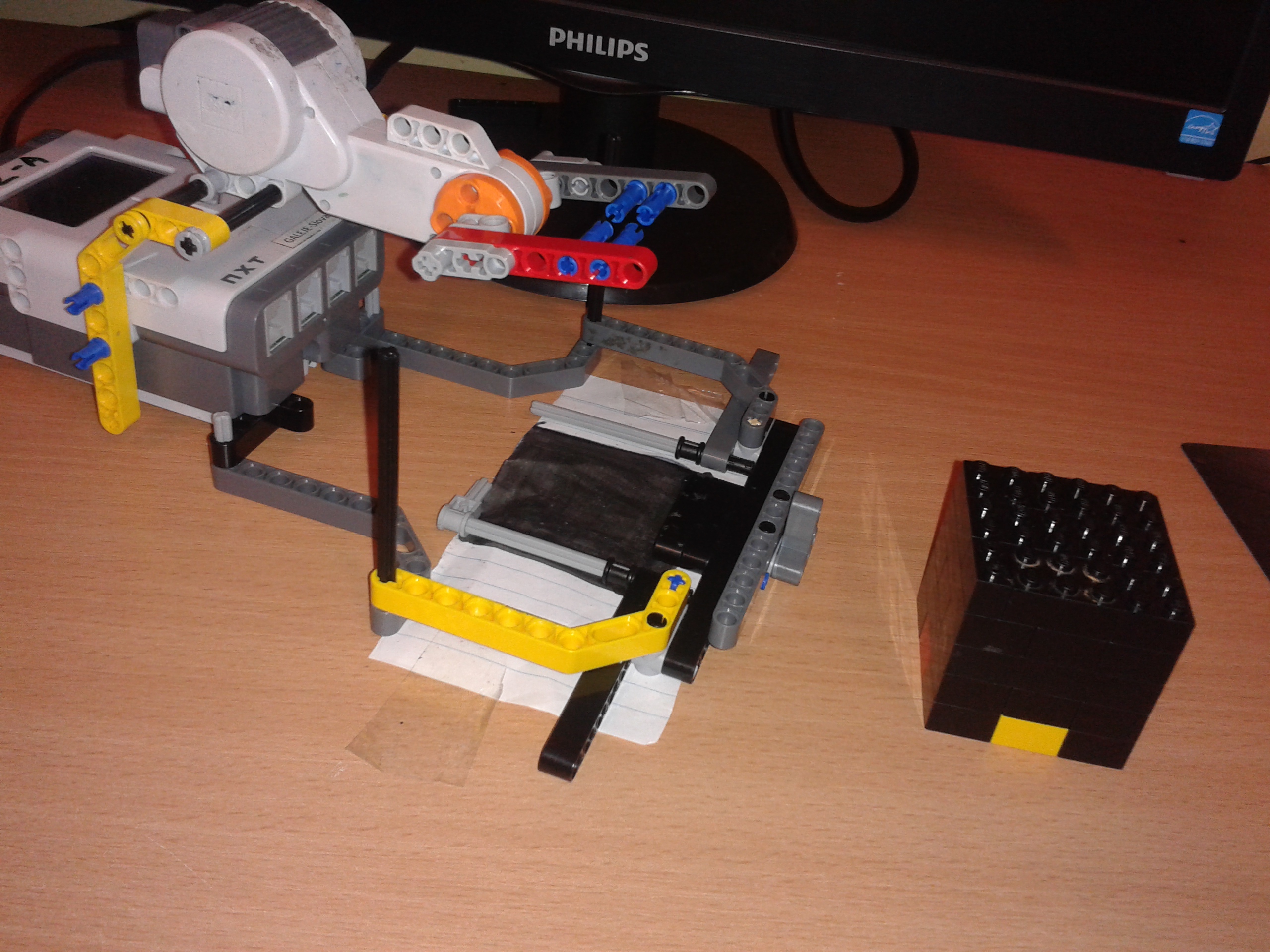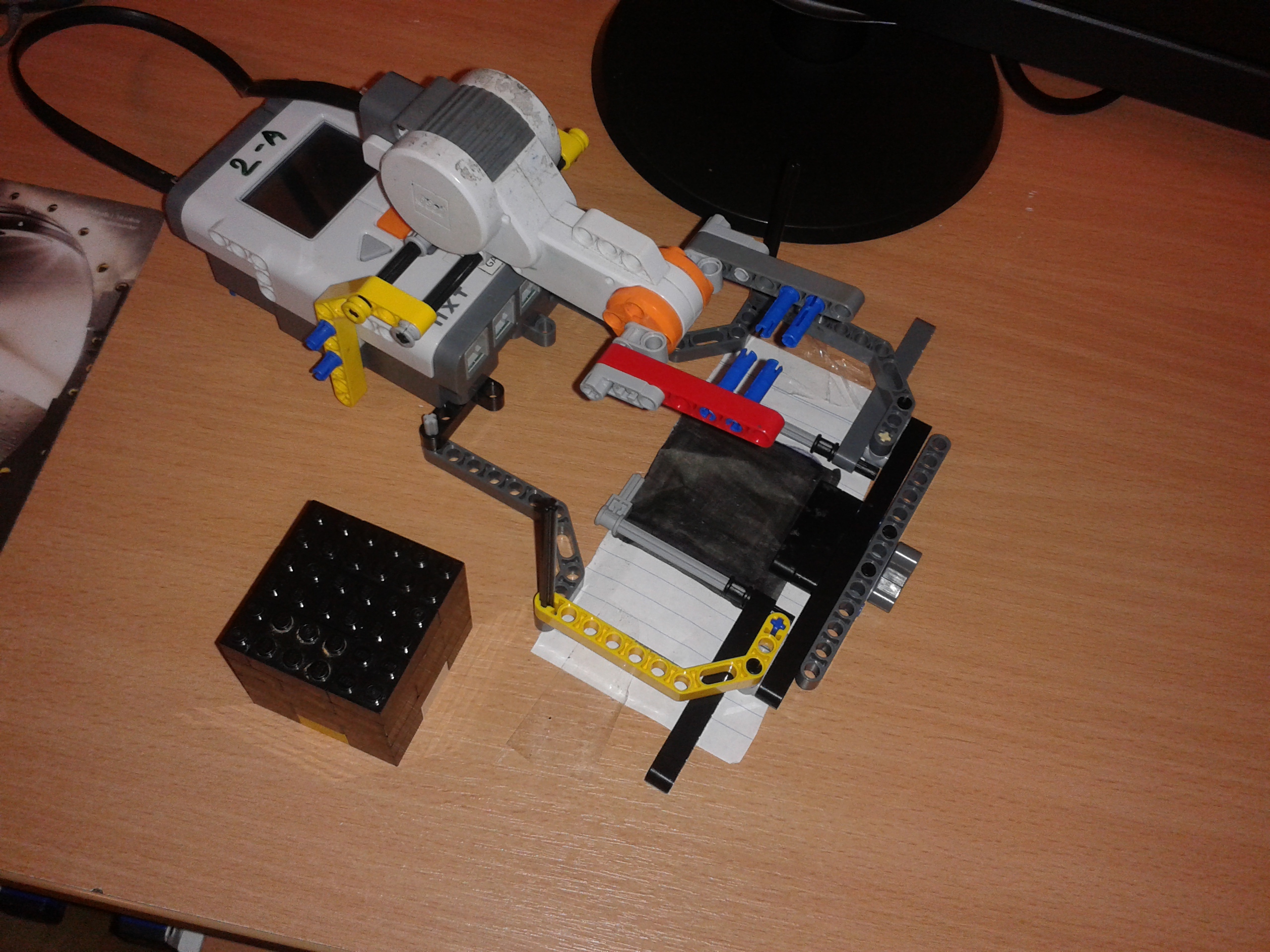 Náš robot pracuje na jednoduchom princípe.Robot má rám, v ktorom je kocka.Robot používa len 1 motor, ktorým výkonáva otáčavé pohyby dobredu a dozadu, tým podvihuje kocku a následne ju otáča