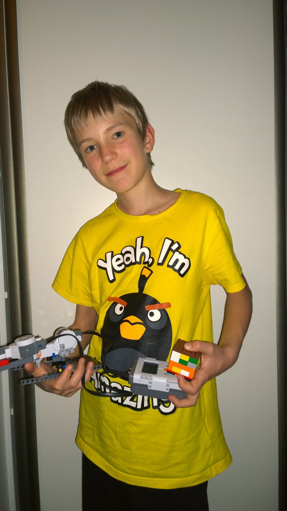 kedze sme stravili o cosi viac casu s prvou ulohou, pre druhu sme mali uz iba 2 stretnutia a cielom bolo skonstruovat jednoduche rameno. pocas stavby verzie s 3 motormi - dva pre otacanie a jeden pre uchopenie sme si vsimli, ze sa kocka pri slabom uchyteni pekne otoci vlastnou vahou. takze sme uz len upravili rameno a odobrali jeden motor. :)