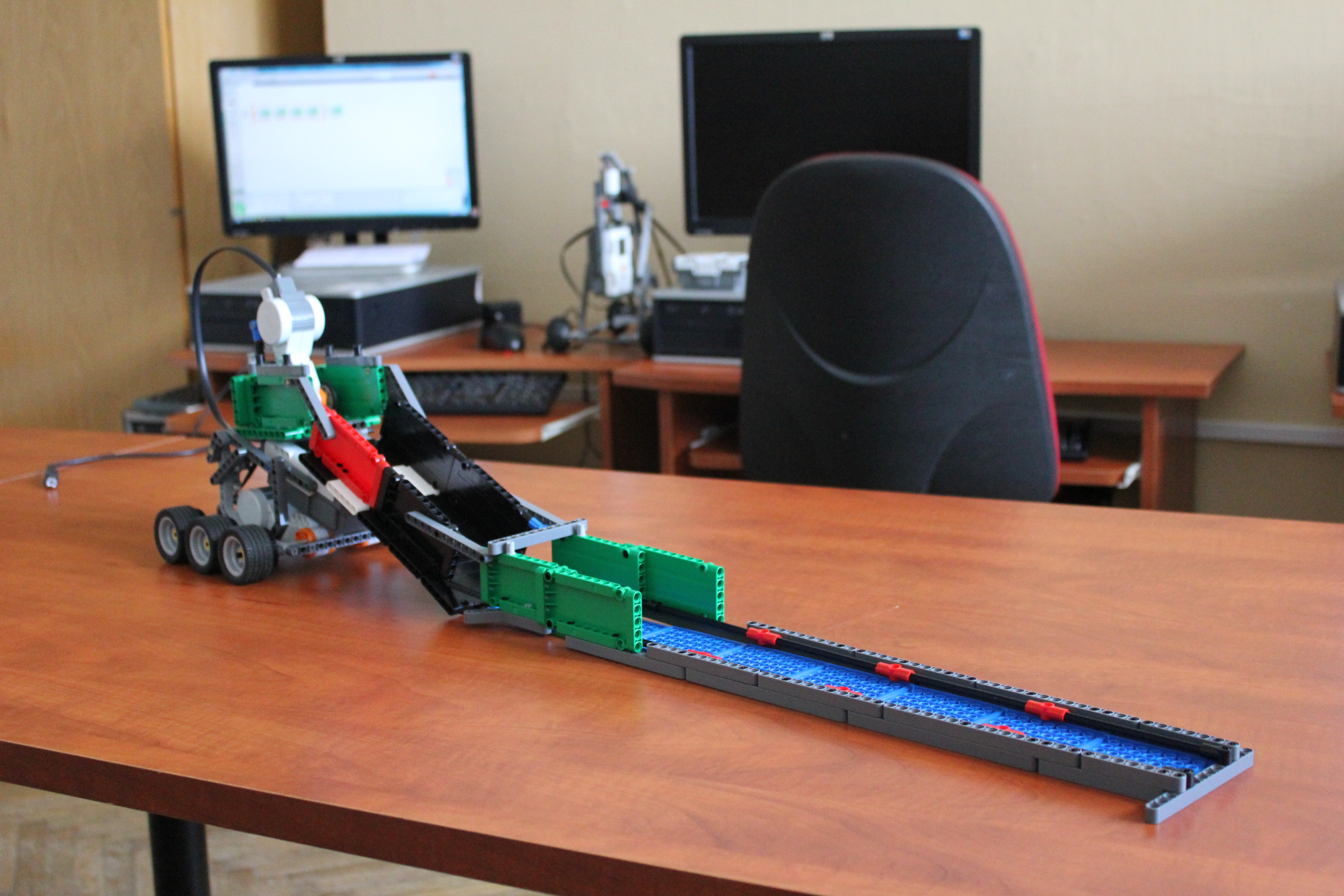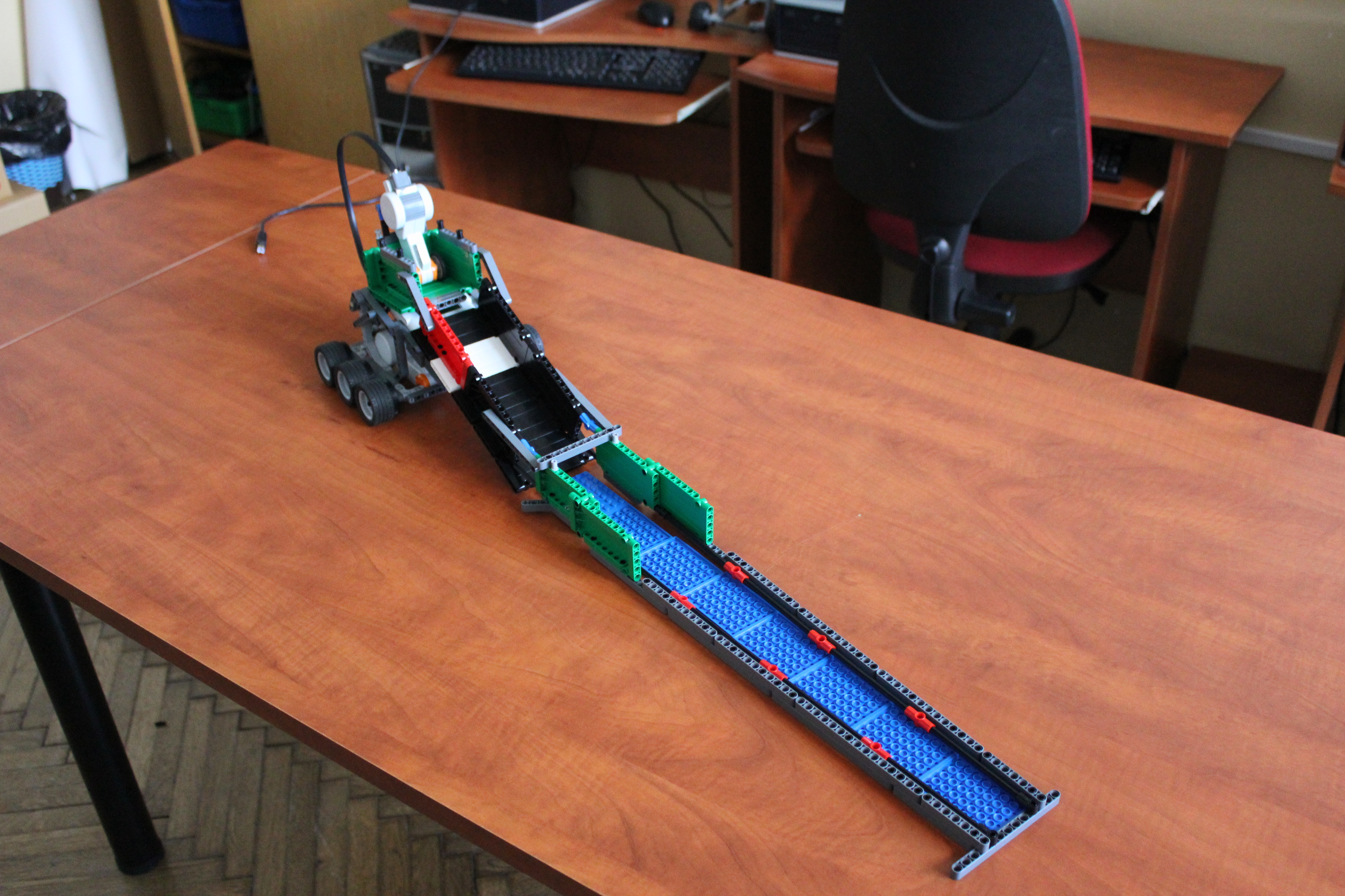 Náš robot sa skladá z 3 motorov, ktoré poháňa NXT kocka. Dva motory robota poháňajú a 3 motor je posúvač dlaždíc, ktoré posúva dlaždice. Spravili sme šmýkačku po ktorej sa dlaždice zosúvajú na zem.