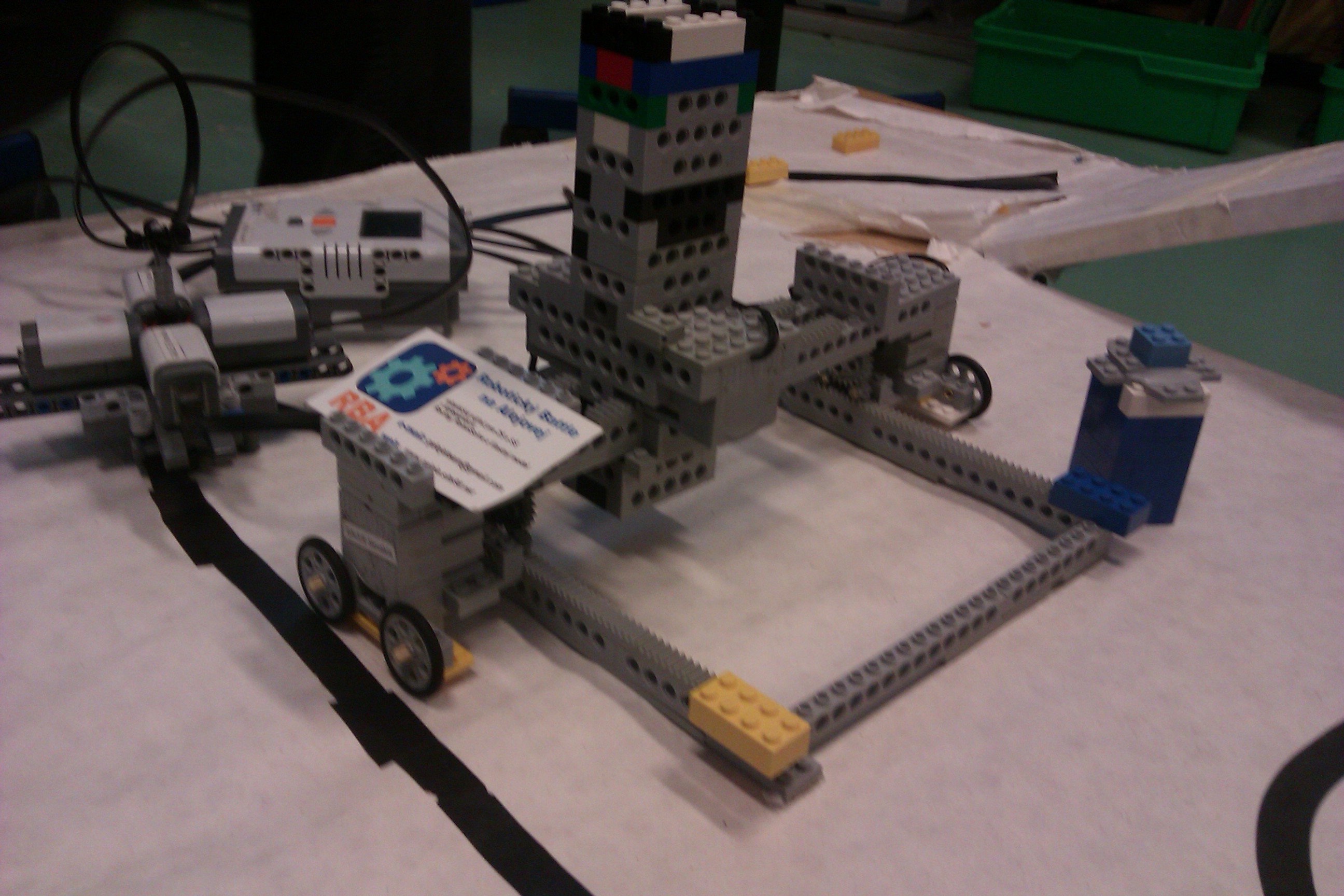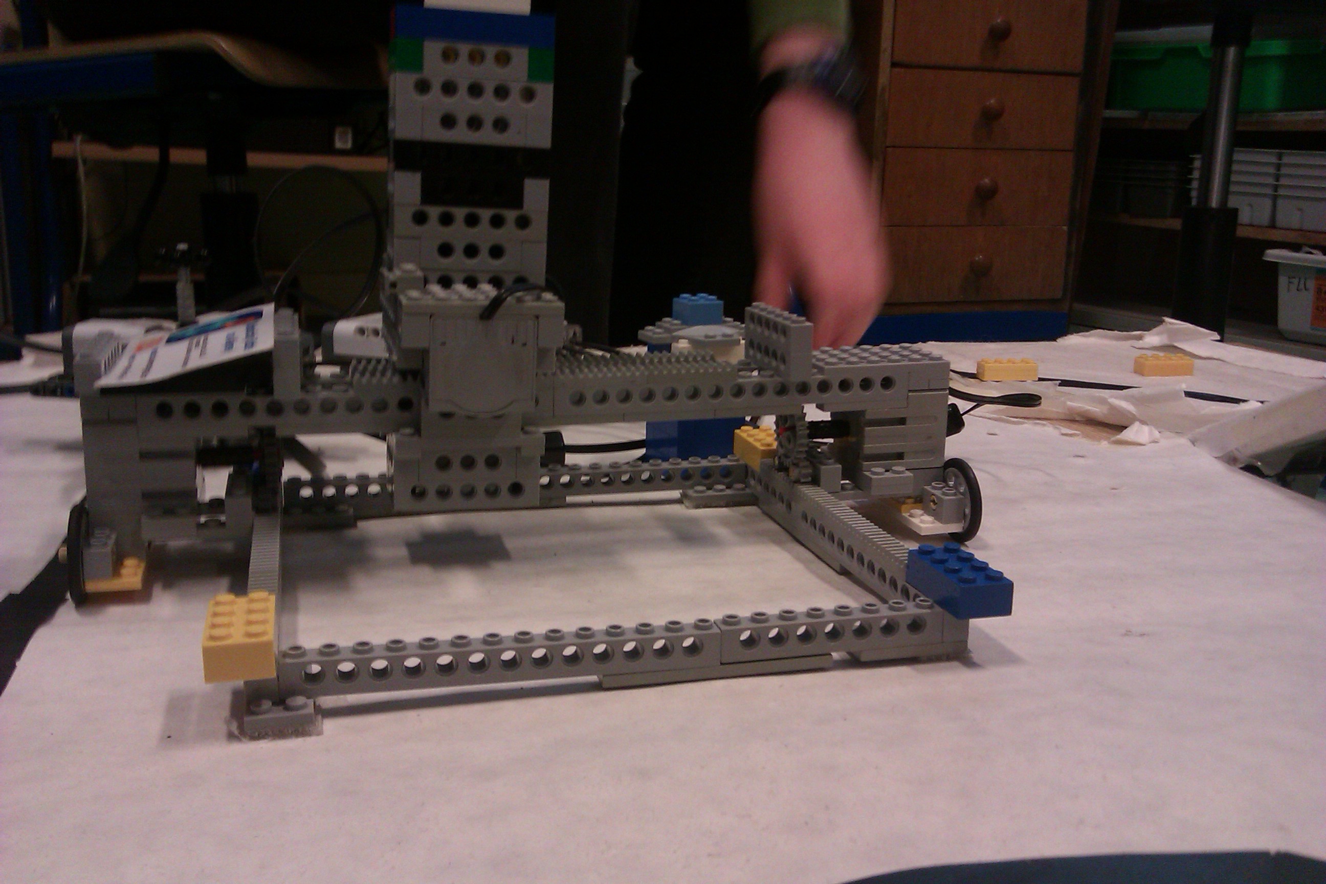 Náš robot jazdí po koľajničkovej konštrukcii a na mieste, kde nie je položená kachlička položí ďalšiu. Takto vydlaždičkuje náš robot plochu a nie iba jeden rad, čo sme mali pôvodne v pláne. A nezarovnáva kachličky, pretože by sa lepidlo predsa mohlo zošúchať :)