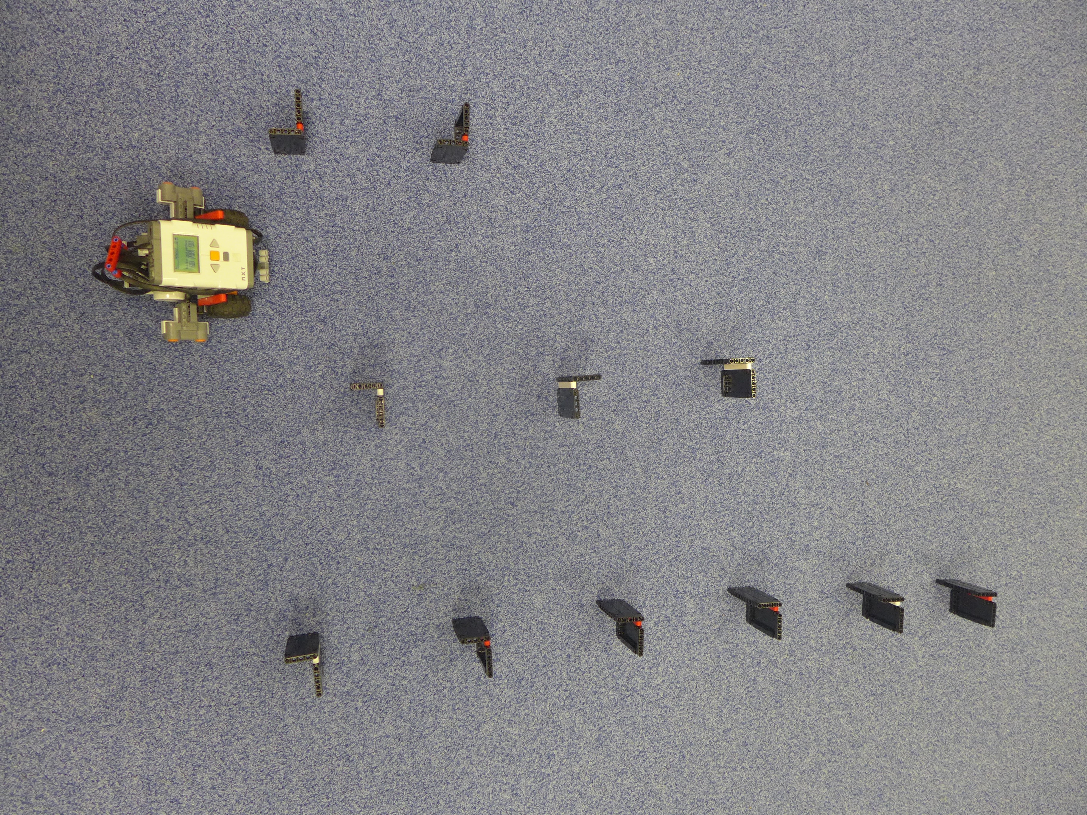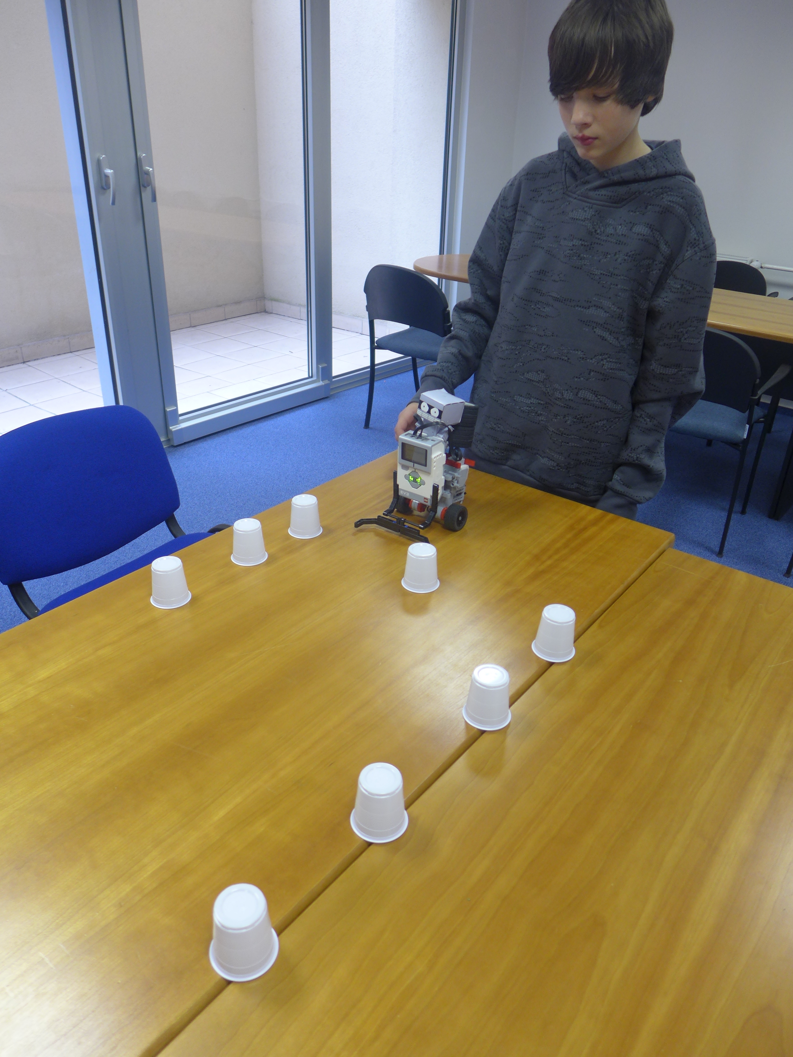 EV3 robot má na jednej strane infračervený senzor, ktorým rozoznáva poháriky. Počet pohárikov v prvej aj v druhej rade si zapamätáva v jednej premennej. Poháriky môžu byť rozložené nepravidelne. Prejde popri jednej rade, otočí sa a cestou späť pripočíta poháriky aj z druhej rady. Potom sa presunie na začiatok tretej rady a po každom poháriku zmenší počet o 1. Ak je počet už nulový, zastaví sa a odhrnie bokom zvyšné poháriky.