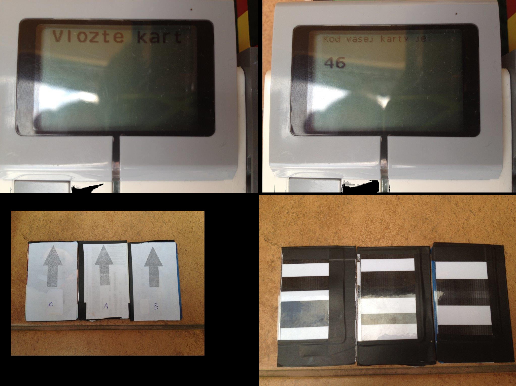 Citlivosť skenera sme nastavili na 8 pozícií, aby bol ešte spoľahlivejší. Mohli by sme tak mať až 256 rôznych kariet s kódmi 0-255. Kódy zo zadania sme nalepili na staré plastové karty tak, aby skener prečítal celý kód. Na druhej strane sme nalepili šípku, ktorým smerom sa karta musí vkladať. Na strane s kódom sme jednu stranu prelepili čiernou páskou - ak by bola karta vložená opačne, skener by prečítal iba čierny pásik a kód by bol 255. Ak by niekto omylom vložil kartu úplne naopak, kód by bol 0, lebo strana so šípkou je celá biela. Kódy 0 a 255 znamenajú zlé vloženie karty.