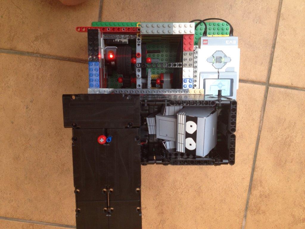 Stredné tlačítko na EV3 kocke môže použiť každý a tiež sa ním aktivuje skener. Po prečítaní kódu karty program zistí, či je kód uložený v zozname. Ak áno, otvorí sa trezor s cennosťami. Po stlačení dolného tlačítka na kocke sa otvorený trezor zavrie.