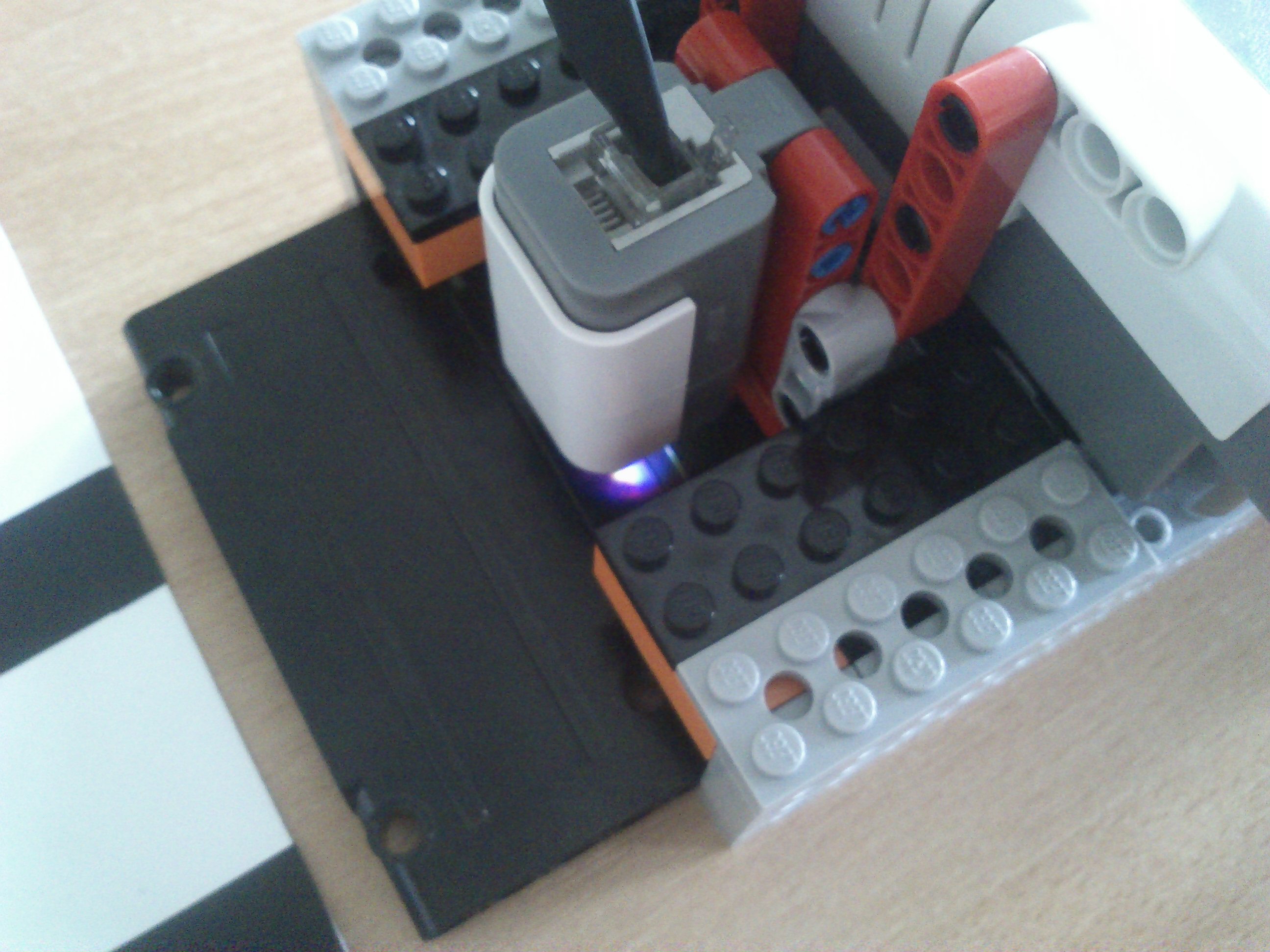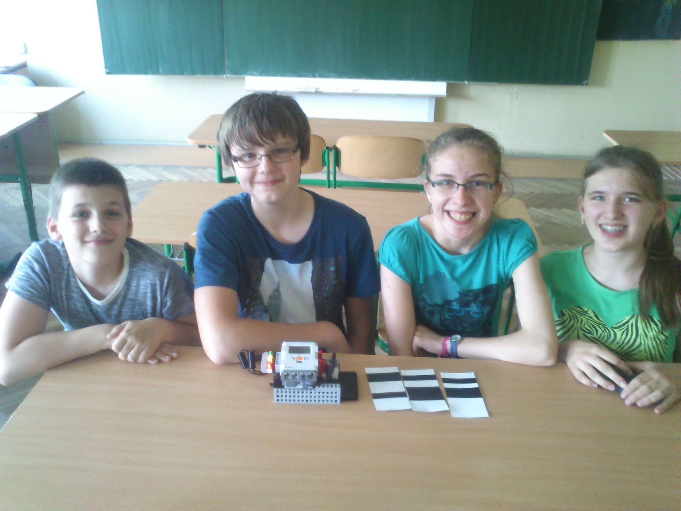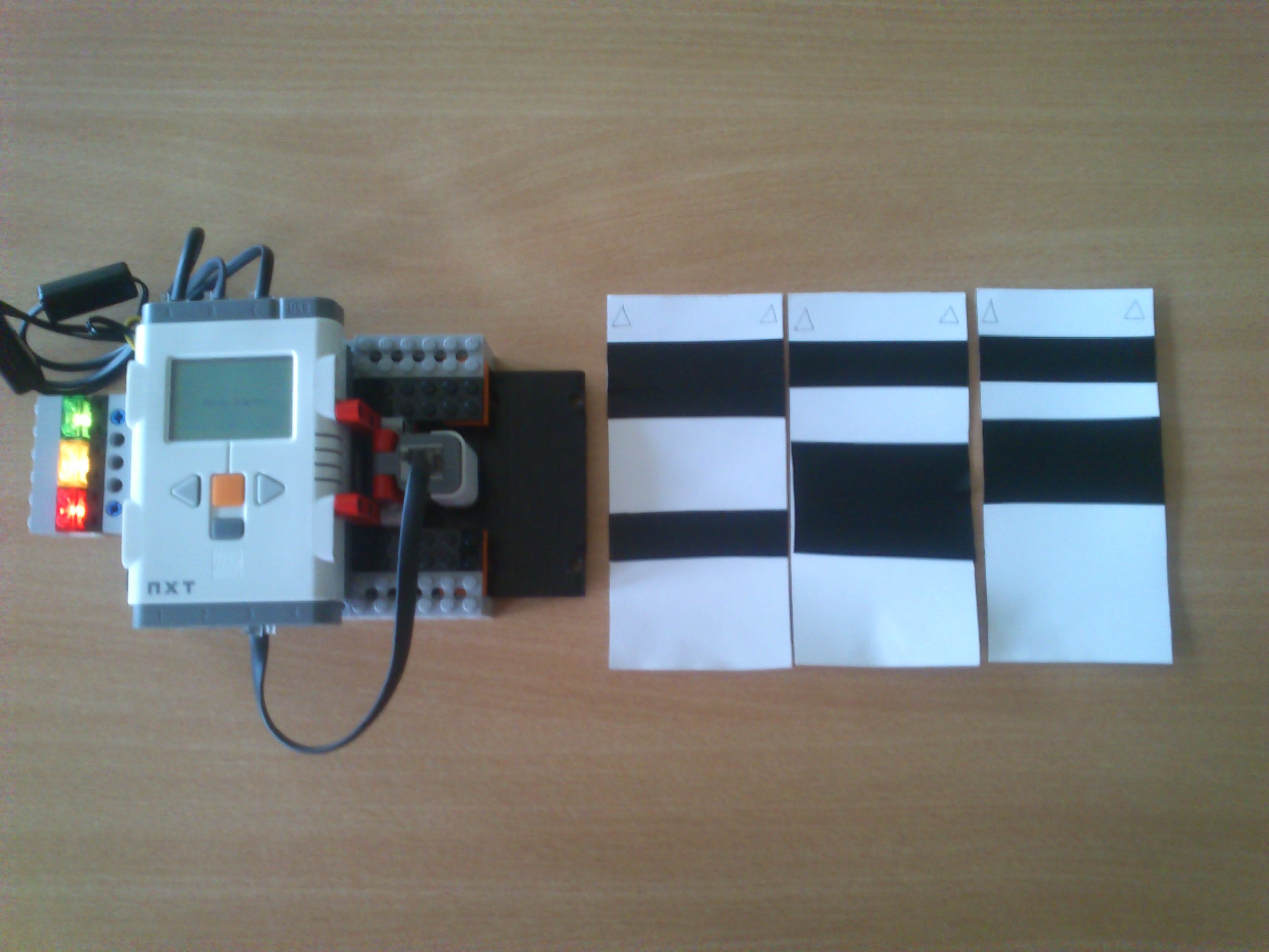 Náš robot používa jeden farebný senzor, tri svetlá (červené, žlté, zelené) a množstvo premenných (prehľad premenných uvedený nižšie). Karty sú vyrobené z papiera, na ktorom je nalepená čierná páska tak, že pásiky sú v poradí: 2cm biely pásik a potom čierny, biely a opäť čierny pásik rôznej šírky. Pri programovaní sme počítali s tým, že človek vsúva kartu do zámku po celý čas približne rovnakou rýchlosťou. Keď náš zámok zistí prítomnosť nejakej karty, najprv zisťuje, ako dlho ,,vidí" 2cm biely pásik a túto hodnotu zapíše do premennej ,,k". Tá je potom použitá pri čítaní každého pásiku, čím robot vypočíta jeho šírku. Premenná k sa zisťuje pri každom čítaní karty, takže pri rovnakej karte dostane robot približne rovnakú šírku (nepresnosti sú tolerované použitím rozsahu).
