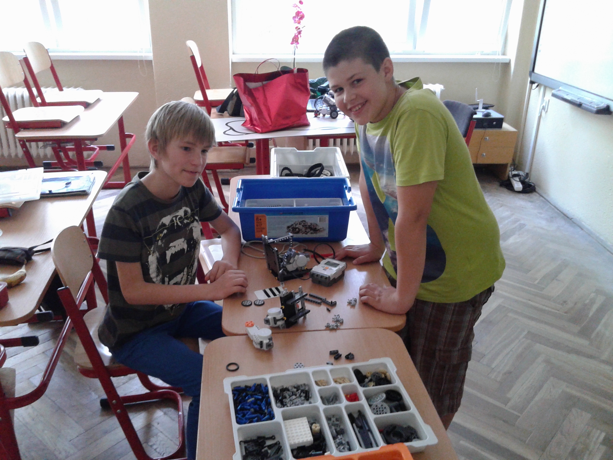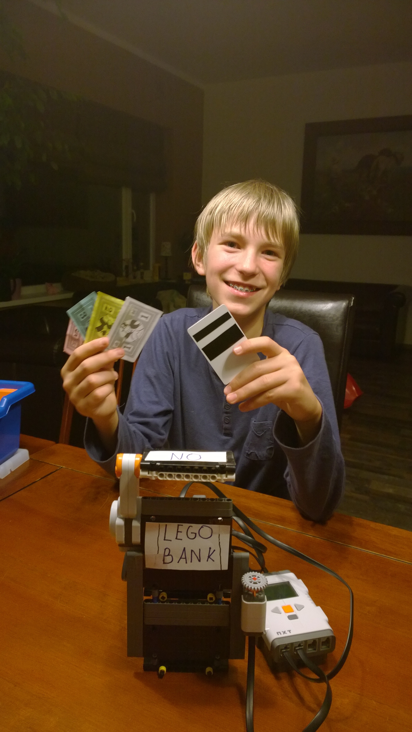 Riešením úlohy č.7 je bankomat LEGO Banky, ktorý vie prečítať vsunutú bankomatovú kartu, na ktorej sa nachádza čiarový kód.