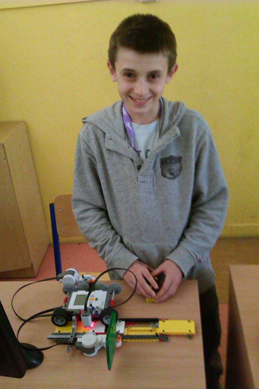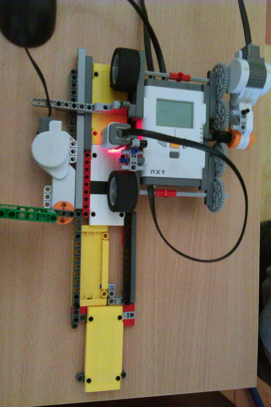 Robot vysunie ruku, do ktorej je možné vložiť identifikačnú kartu,ktorú zosníma a zapamätá si jej vzor. Do súboru ukladá akočísla dĺžky tmavých a svetlých úsekov, ktoré meria otáčkovýmsenzorom.Potom ruku vysunie znova a je možné vložiť novú identifikačnú kartu.Opäť ju prečíta a aj tento vzor ukladá do súboru rovnakým spôsobom.Kartu vysunie a dva súbory porovná: navzájom odpočítava dĺžky jednotlivýchúsekov. Súčet absolútnych hodnôt týchto rozdielov spočíta. Ak mániektorá identifikačná karta menej pásikov ako iná, nevadí, pretože robotvždy doplní súbor nulami ako keby tam bolo 15 pásikov.V prípade, že rozdielnosť dĺžok pásikov je menšia ako prahová hodnota,dvere sa otvoria a majiteľ ID karty môže prejsť. Dvere za sebou zatvorísám (alebo Brano zavíra samo...). Zámok je možné preprogramovaťnovým kódom, ale iba vtedy, ak sa program dostane do začiatočného menua to sa dá iba pomocou správnej ID karty.