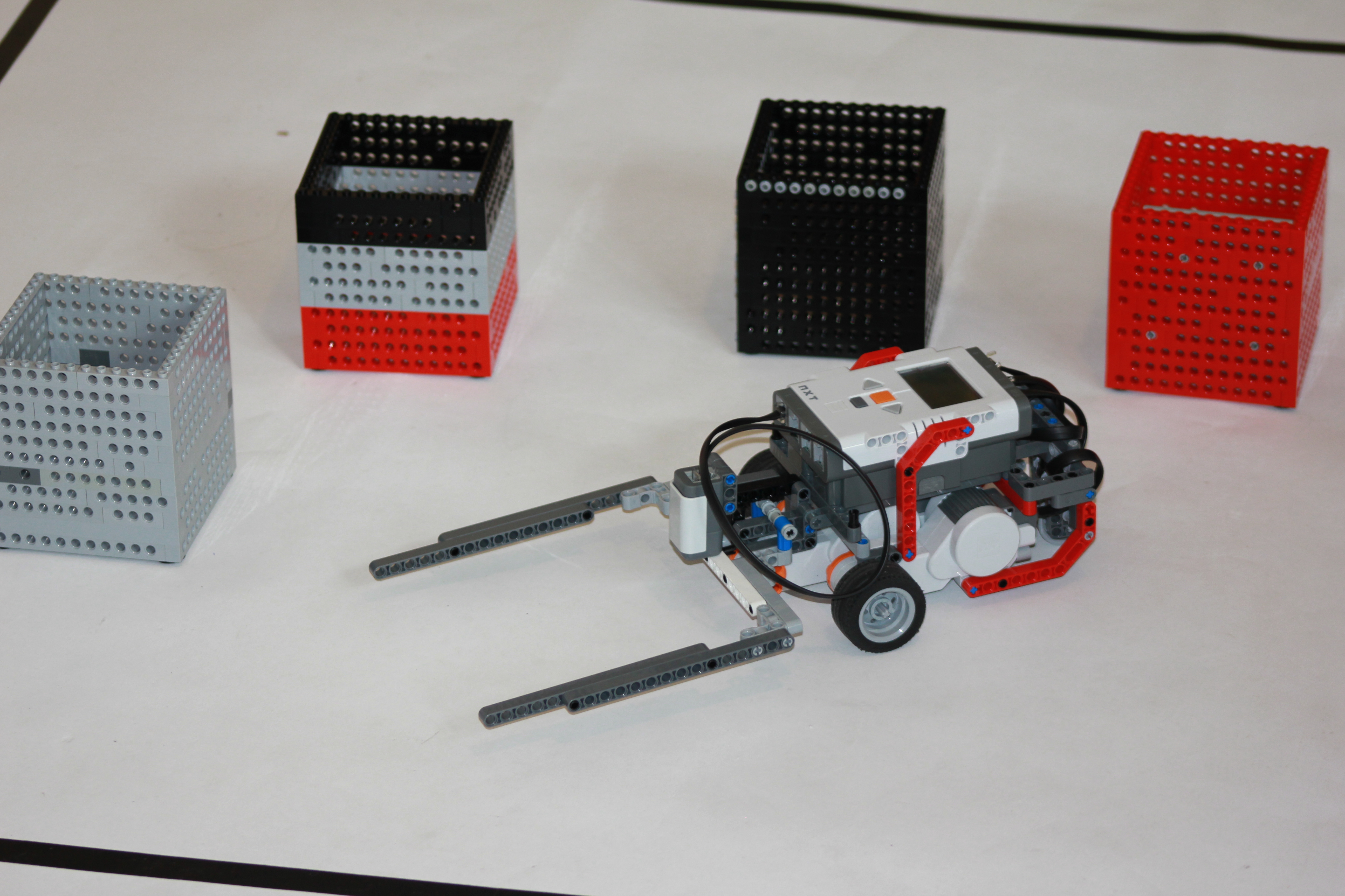 Princíp: Robot presúva kocky pomocou ramena. Keď svetelný senzor uvidí čiernu čiaru, otočí sa po nej smerom k prvej kocke. Potom pomocou rotácii presúva ostatné kocky. Na uľahčenie programu sme dali opakovať to isté ako pri prvých dvoch kockách.