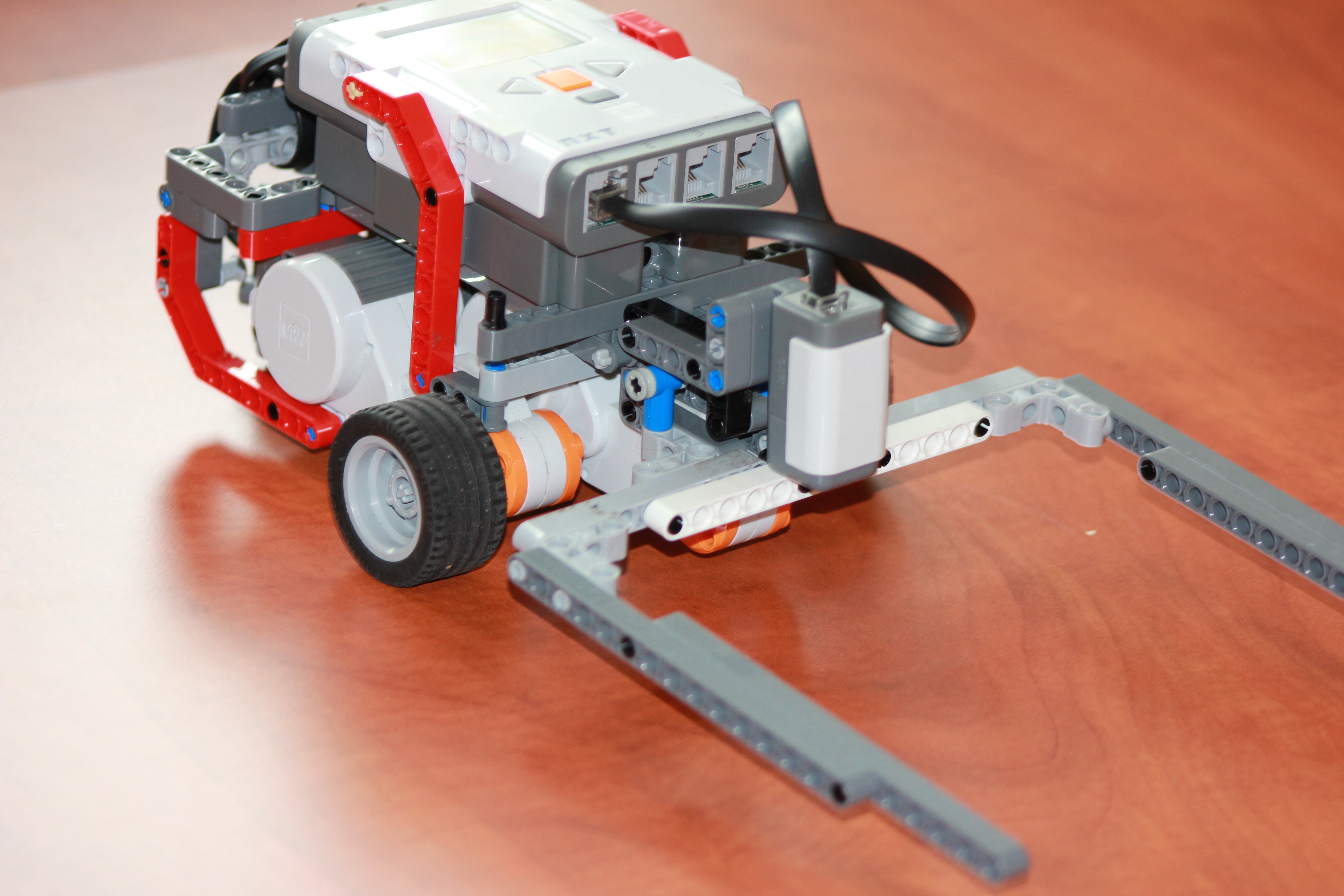 Náš robot sa skladá z 2 motorov, 2 kolies, páru ramena, hlavnej kocky, pevnej konštrukcie a drobných súčiastok. Predné kolesa slúžia na pohon a zadné koleso slúži na vyrovnávanie robota.