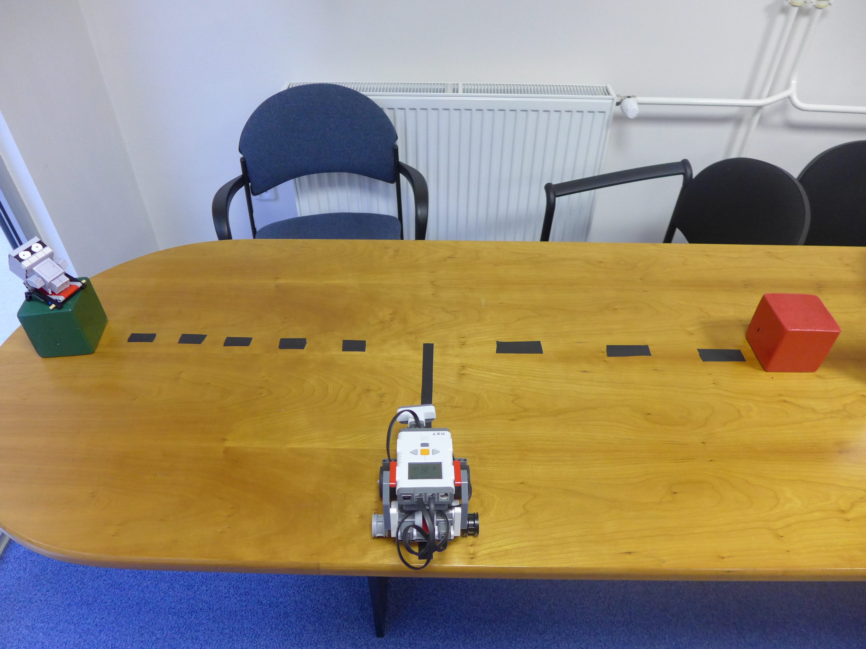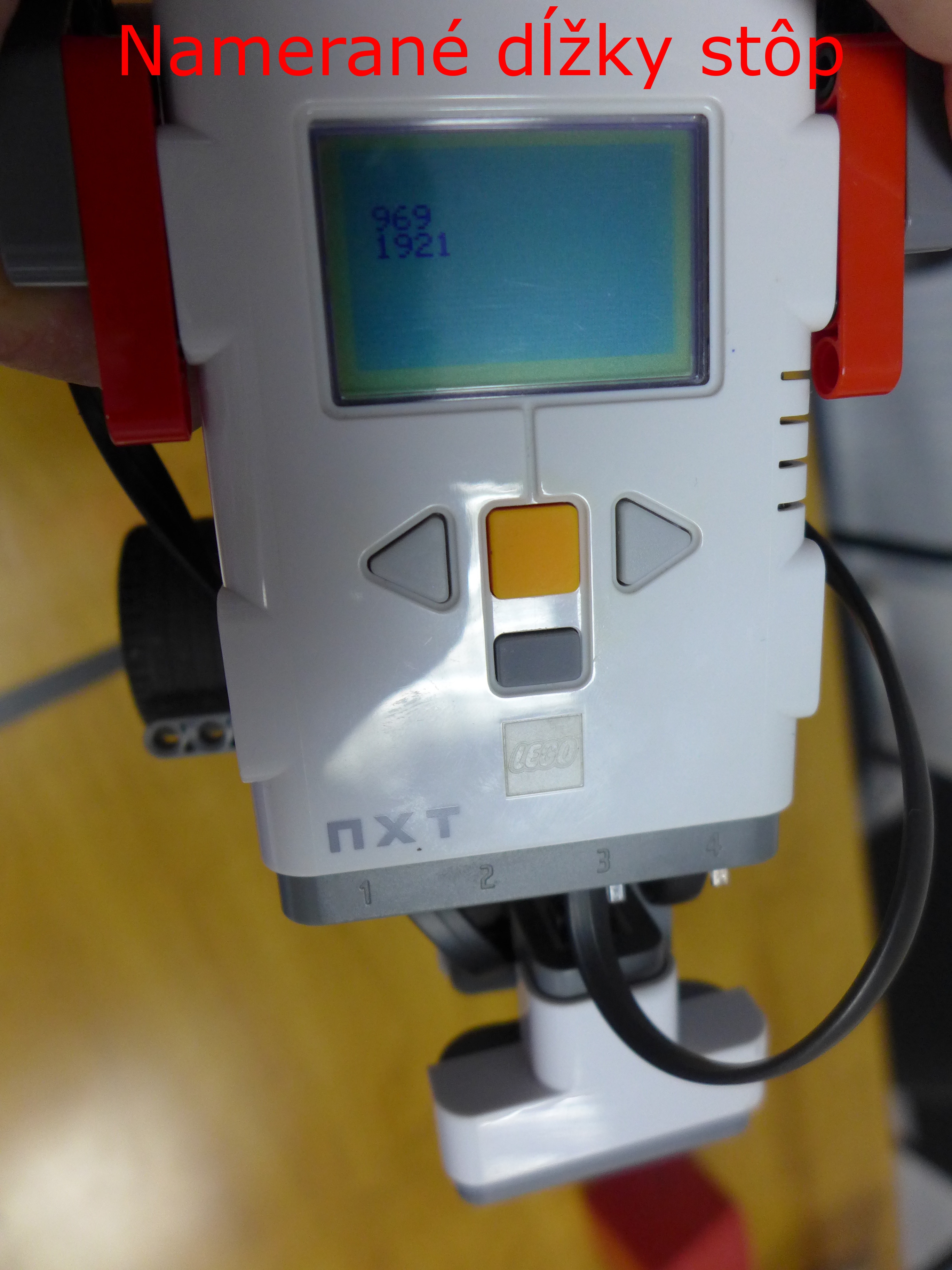 Na konci plnej čiary sa robot otočí najskôr vpravo, nájde prvú stopu a pomocou časovača zmerá čas potrebný na pomalé prejdenie prvého úseku. Hodnotu z časovača uloží do premennej DlzkaVpravo. Potom sa neotáča, ale cúvne na začiatok prvej stopy vľavo od plnej čiary. Meranie dĺžky stopy zopakuje rovnakým spôsobom a hodnotu uloží do premennej DlzkaVlavo.