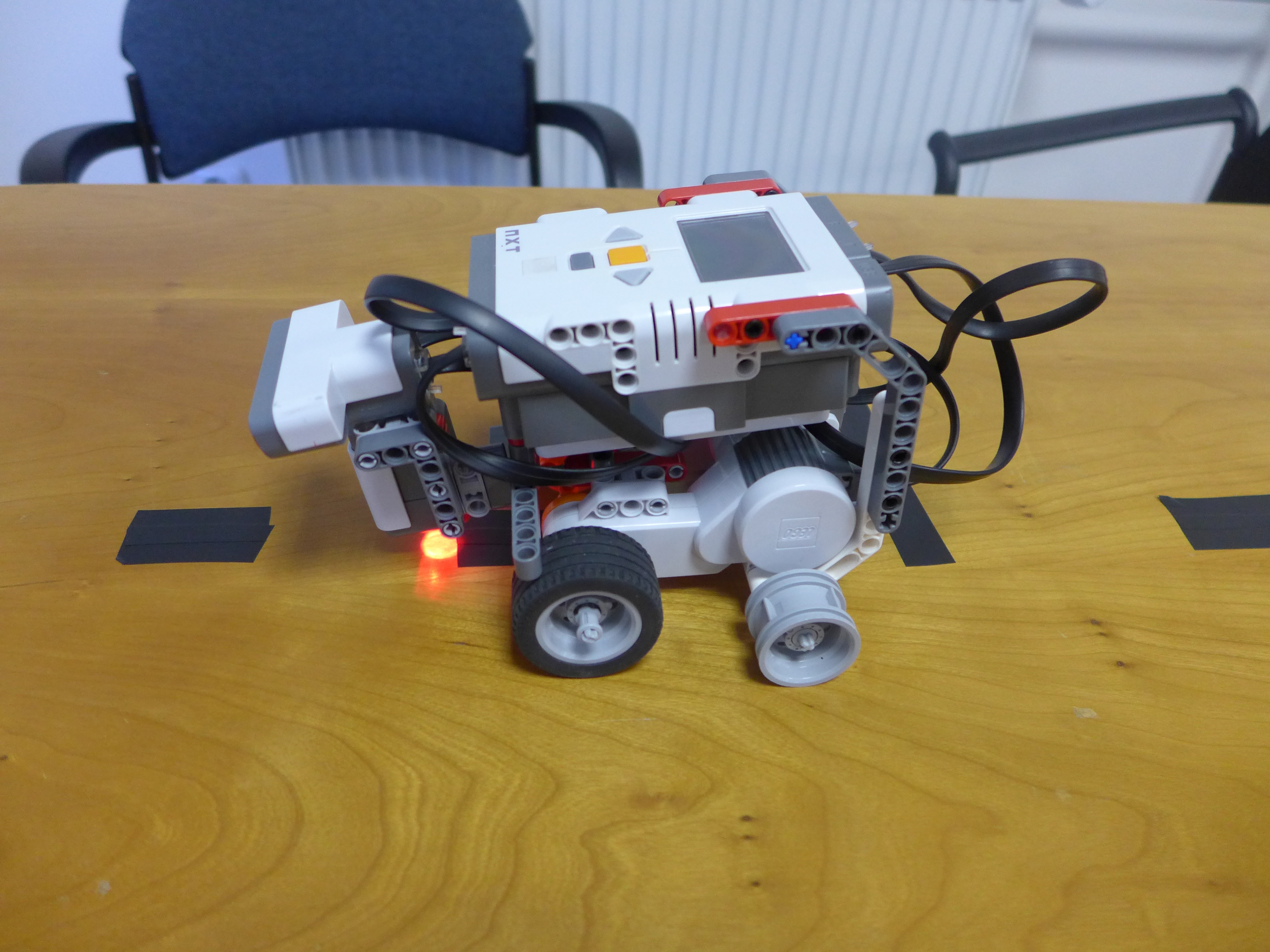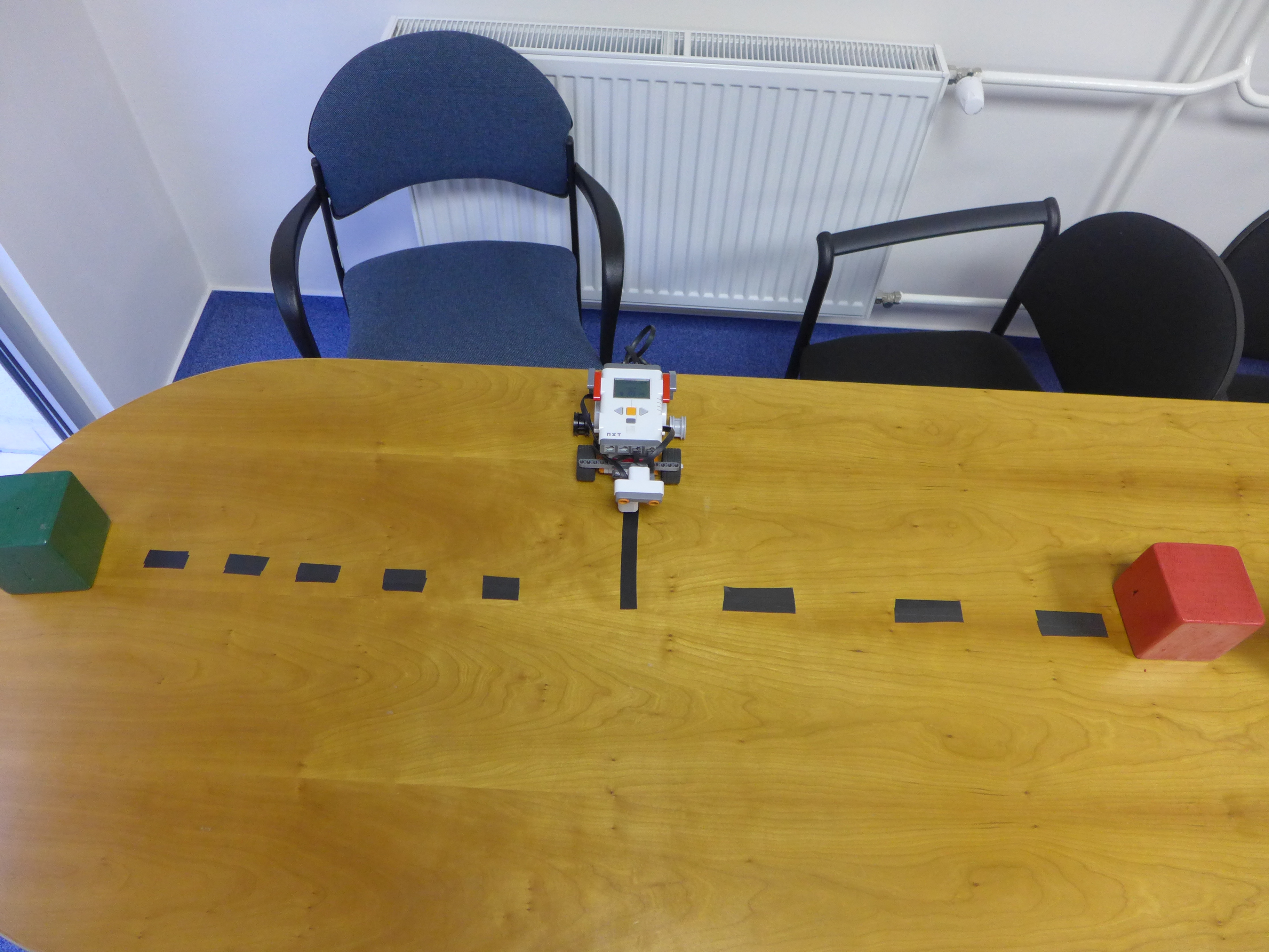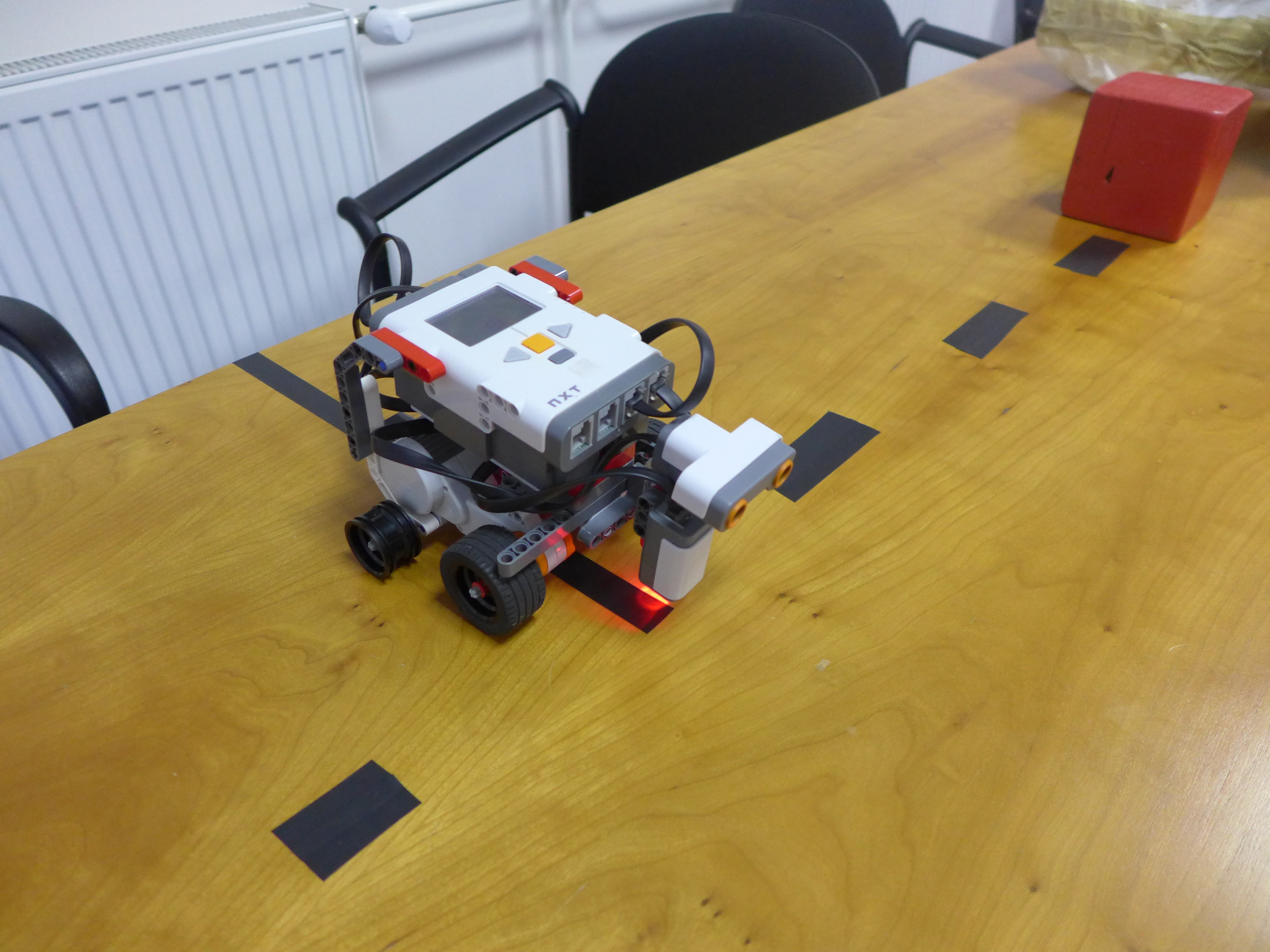 Na začiatku sa stopár pohybuje po plnej čiare najjednoduchším spôsobom. Ak svetelný senzor vidí čiernu čiaru, točí sa jeden motor, inak sa točí druhý motor. Na dĺžke plnej čiary nezáleží, jej koniec robot rozozná vtedy, keď čiaru nevidí dlhšie ako 0,2 sekundy. Vtedy zastaví a znova sa zarovná do línie čiary.