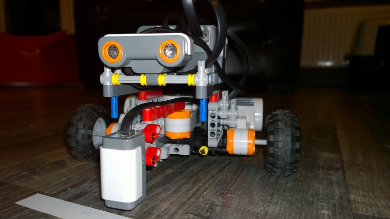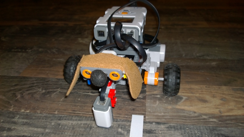 Potom sme však zistili, že s jedným svetelným senzorom (viac sme nemali) sa nedá rozoznať koniec čiary a to, že robot zišiel z čiary. A tak sme vymysleli, že robot bude senzorom hýbať zo strany na stranu (podobne ako pes s nosom pri sledovaní stopy).