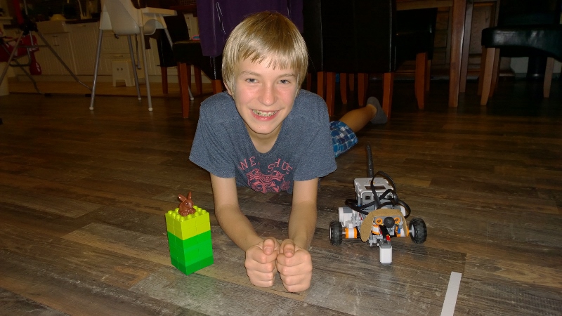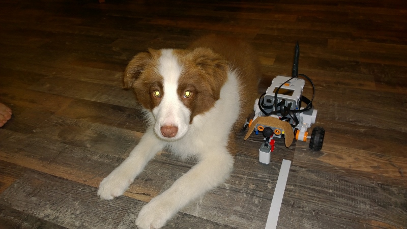Aby sa robotovi lepšie darilo, prirobili sme mu psie uši a nos a ako obeť sme použili zajaca z LEGO DUPLO. Dokonca sme požiadali o odborné rady aj nášho psa Ginu :-)