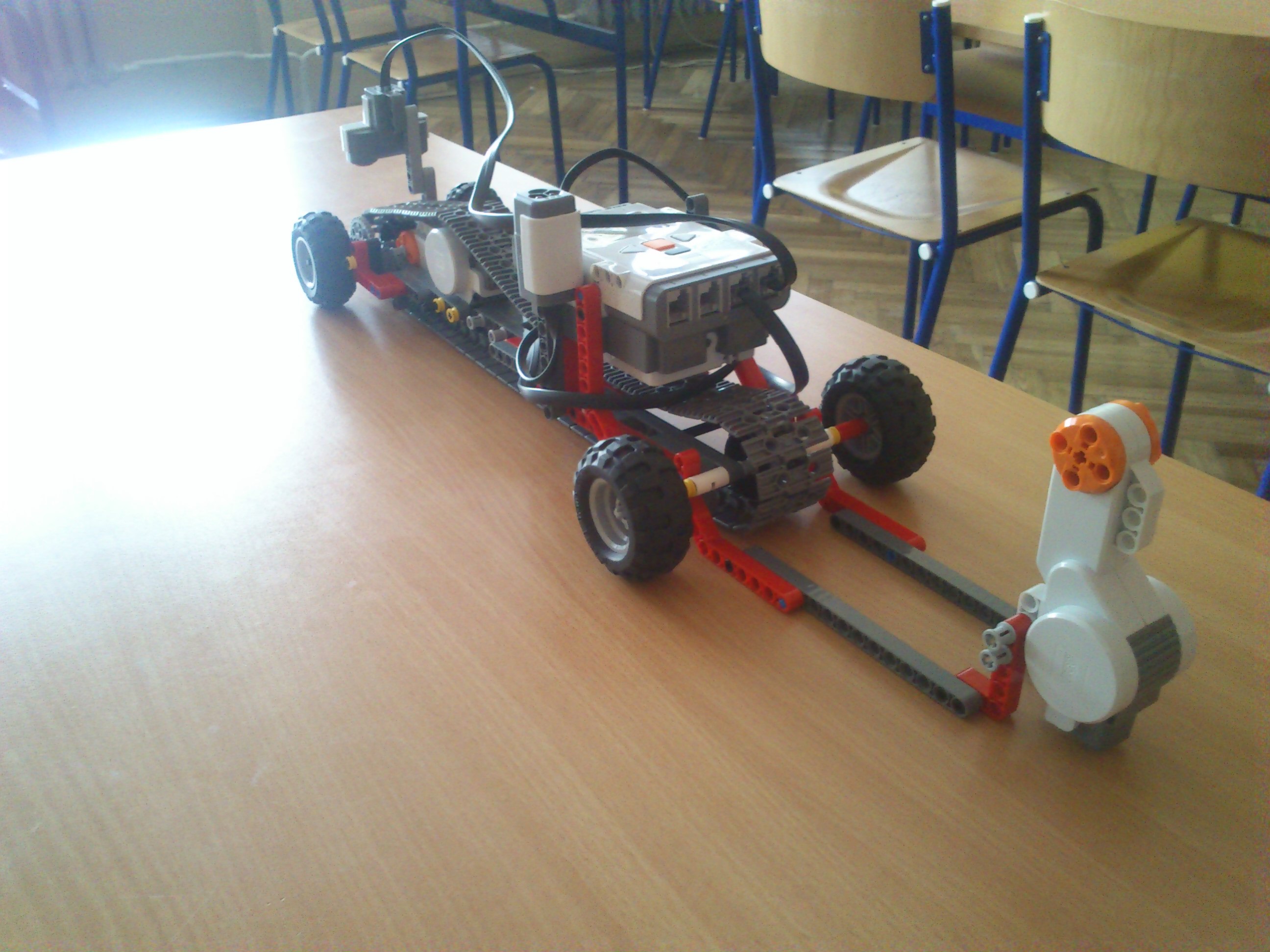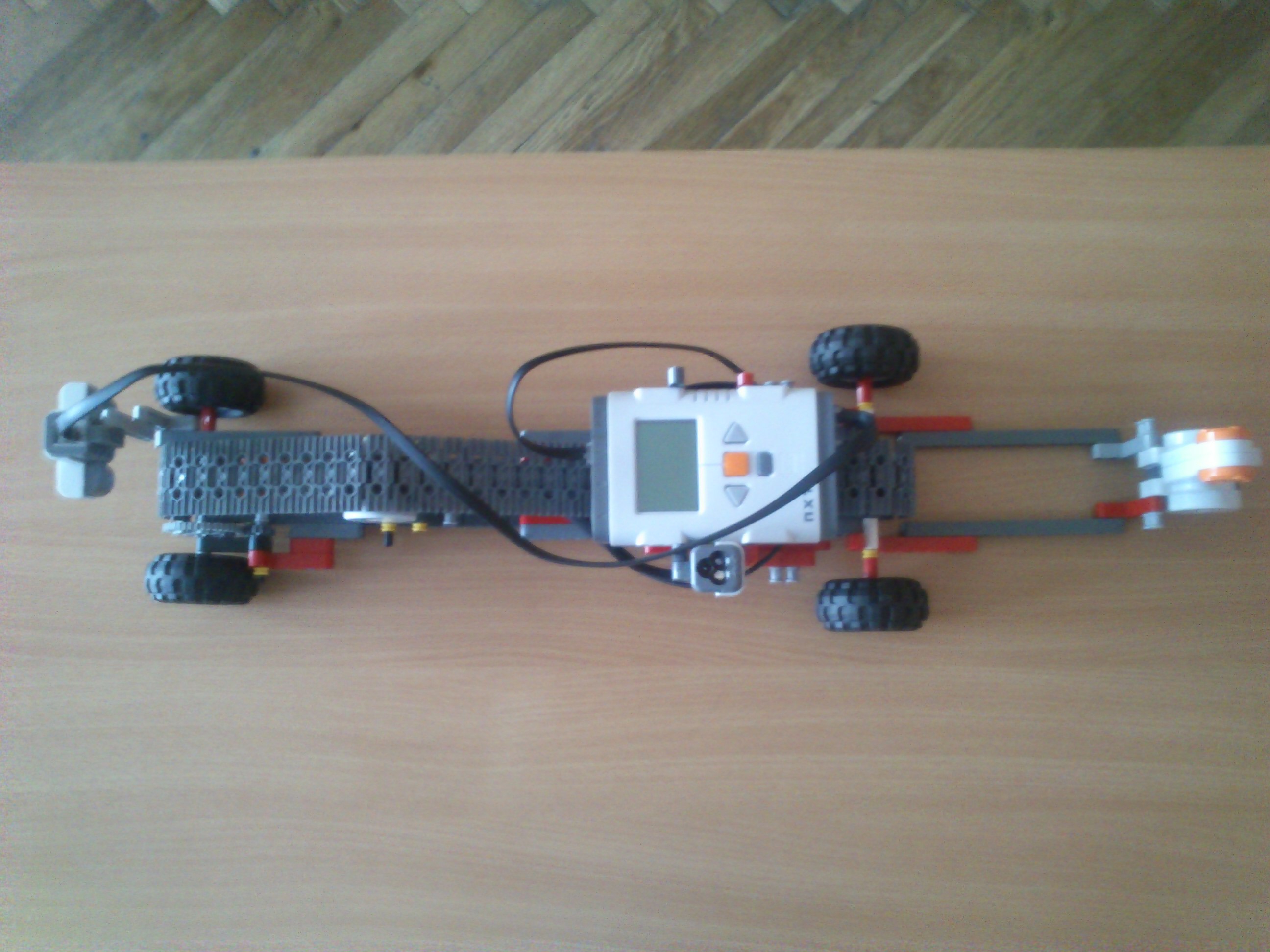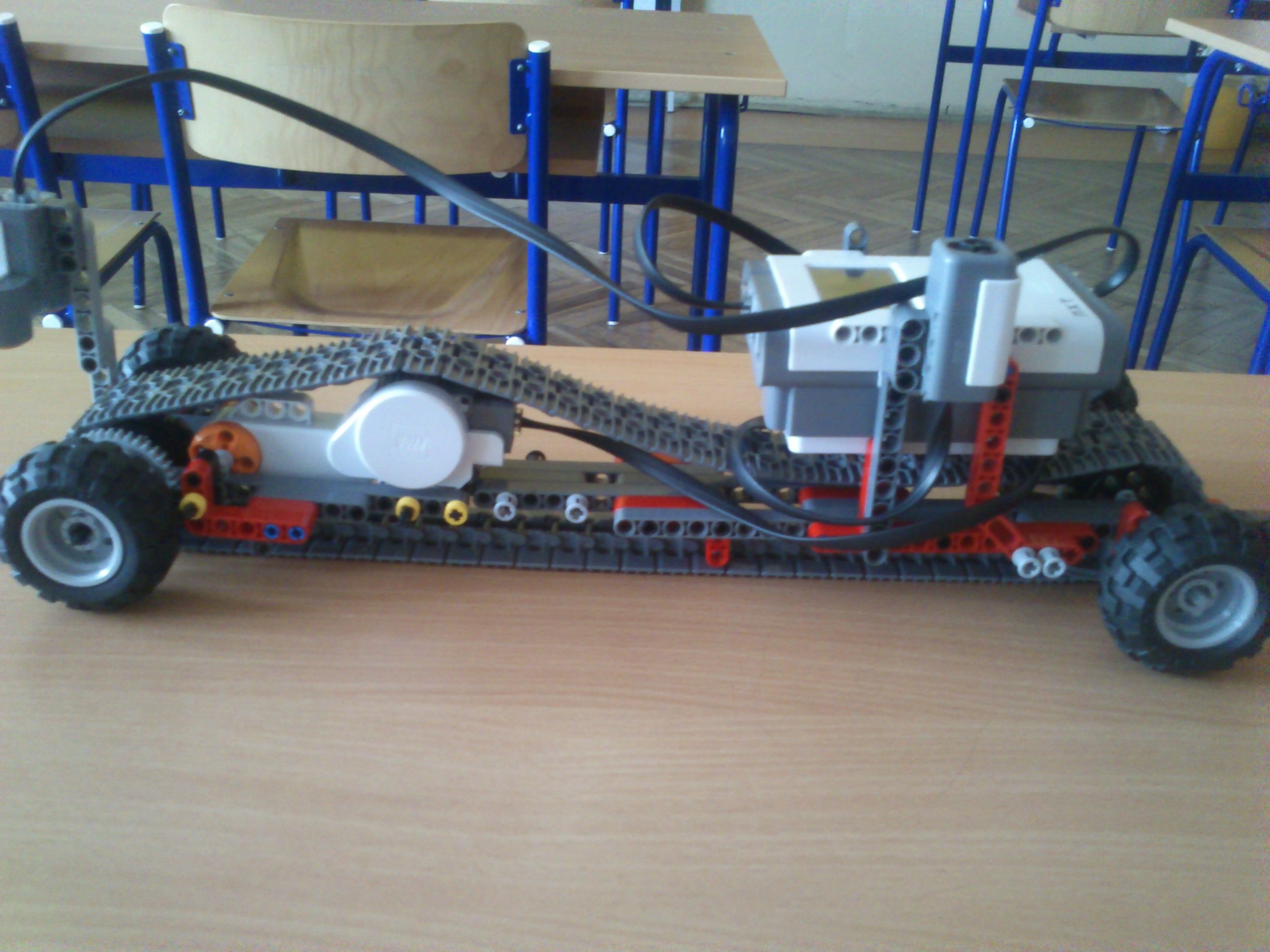 Nášho dlhého robota tvorí jeden motor vpredu, na ktorom sú cez prevod dopomala pripojené kolesá a pás. Nad motorom je upevnený ultrazvukový senzor na zistenie ,,priepasti". Kocka je pre vyváženie umiestnená v zadnej časti robota nad pásom. Na kocke je upevnený farebný senzor, ktorý sme použili ako farebnú lampu. Úplne vzadu je ešte jeden motor (nepripojený), znova pre vyváženie.