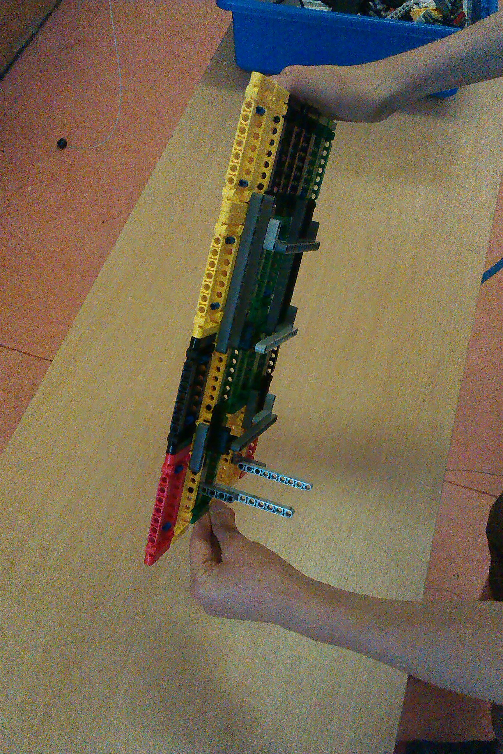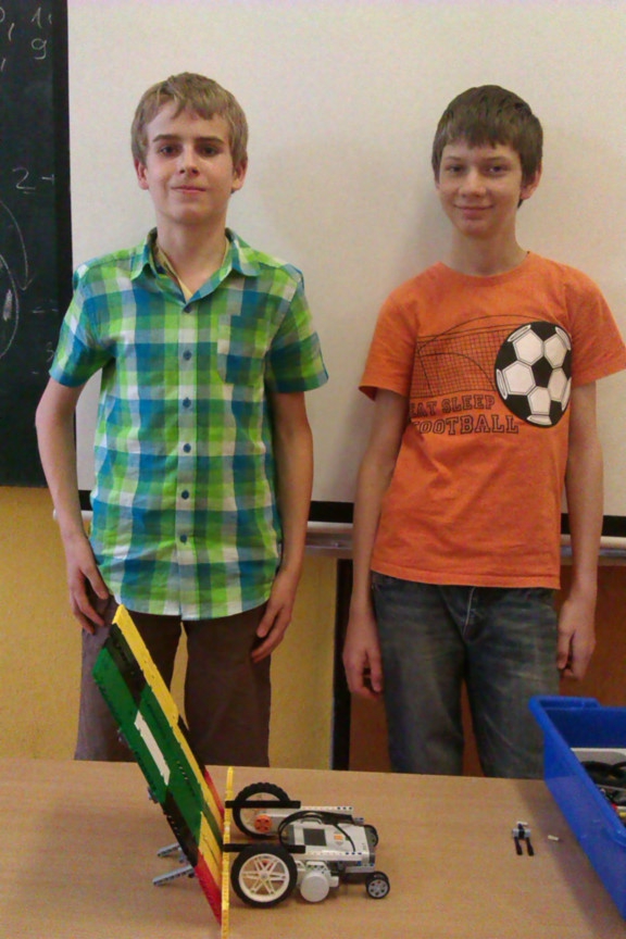 Výborné riešenie založené na mechanickom princípe spustenia mosta ponad priepasť, funguje to a je to pekné a jednoduché, dokonca by tento robot mohol bez problémov jazdiť aj po zákrutách. Ďakujeme!