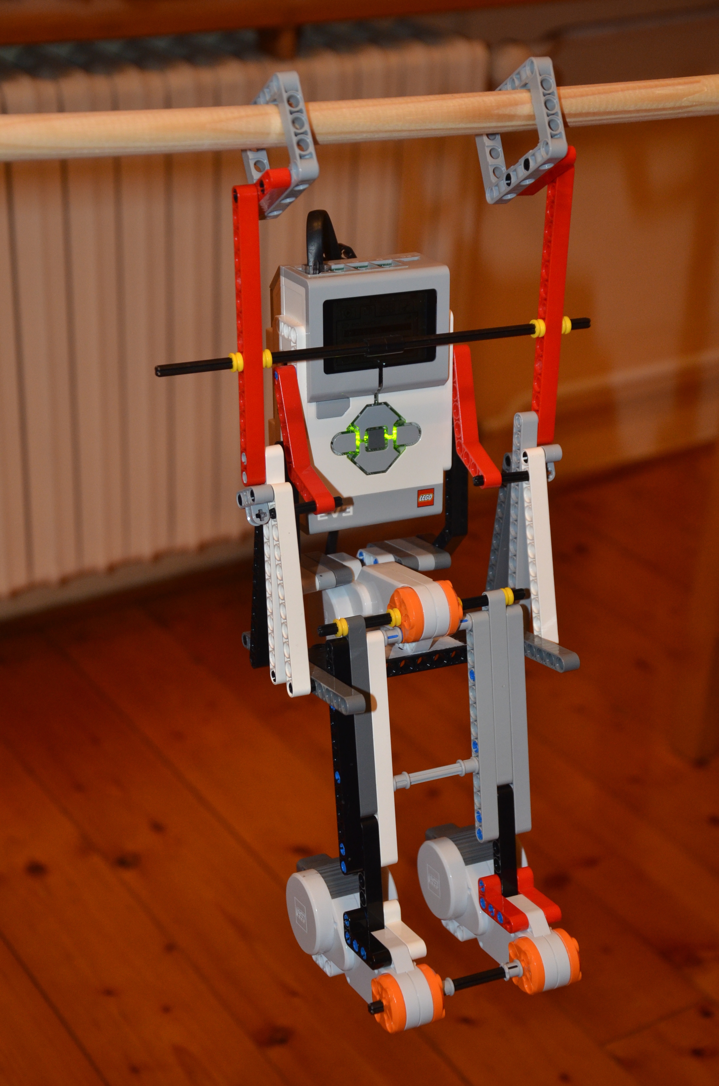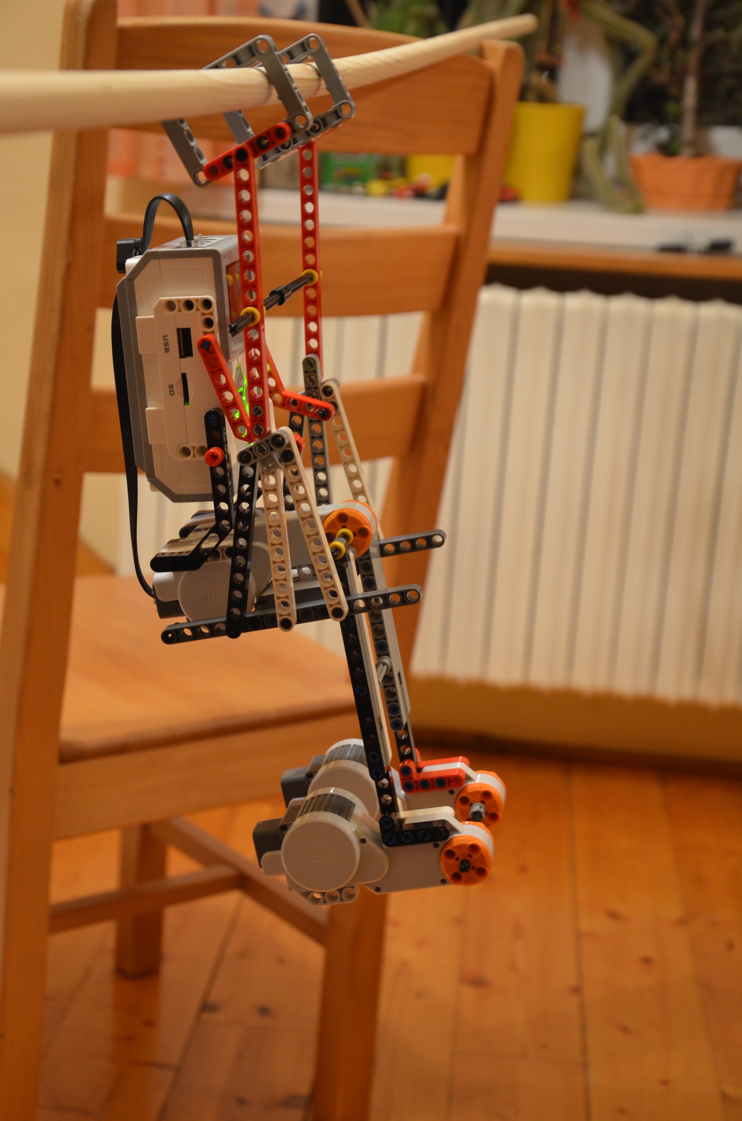 Robot je postavený z EV3, 2 nohy má z motorov, ktoré slúžia len ako závažie, tým zabezpečíme, aby pri zmene ťažiska sa dobre rozhojdal.