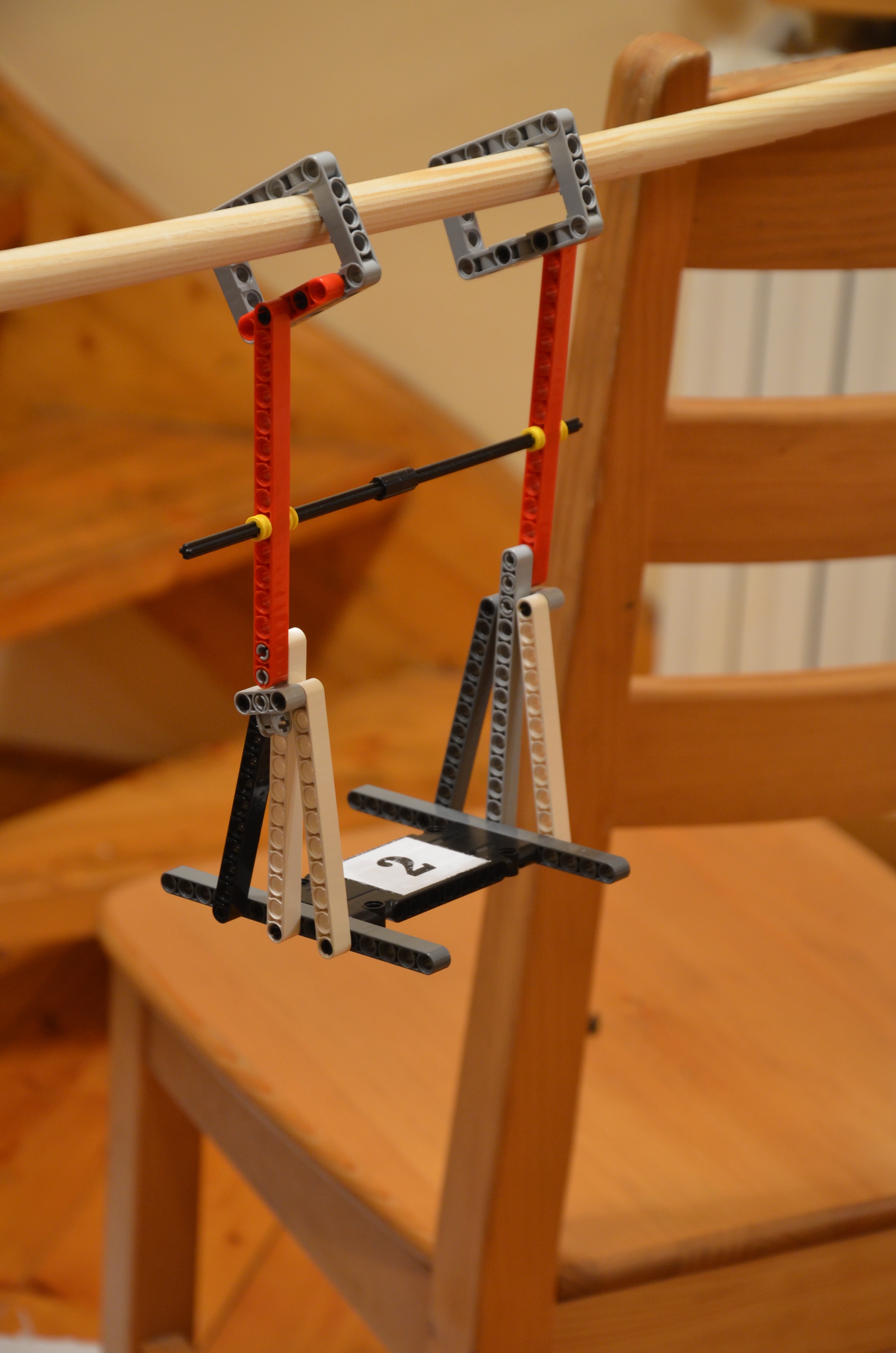 Hojdačka vyrobená z Lega je voľne zavesená na drevenej tyči.