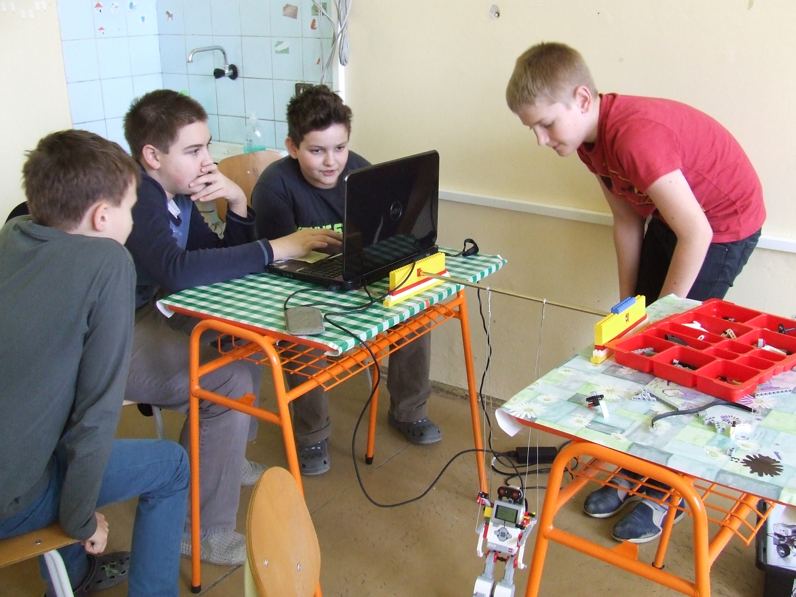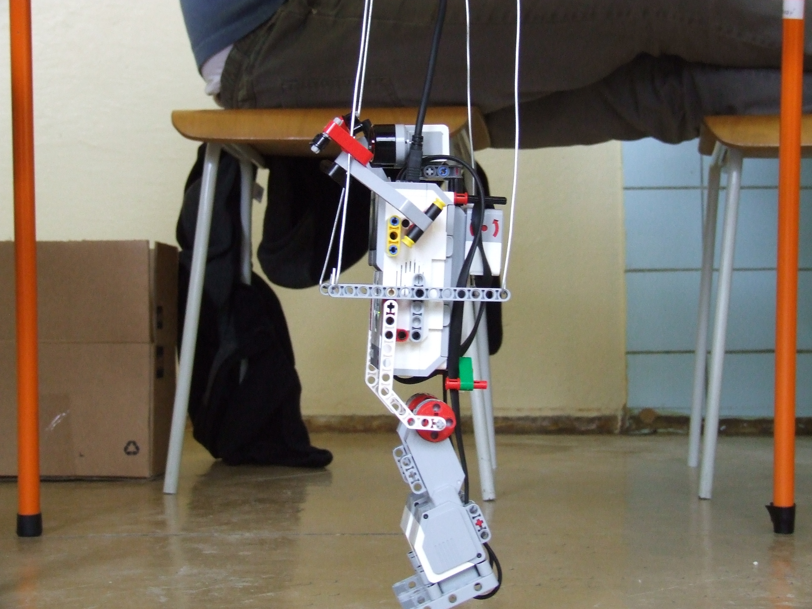 Robota sme zavesili na hojdačku a zmerali dobu kmitu. Motory tvoria nohy robota. Kývaním nôh dopredu a dozadu sa robot rozhojdáva. Rýchlosť kývania nôh bola nastavená na dobu kmitu hojdačky. Gyroskopický senzor meria veľkosť výchylky robota a po dosiahnutí uhla 50° sa motory zastavia, aby sa robot s hojdačkou neodtrhol. Chceli sme ešte naprogramovať robota, aby sa vedel rozhojdať z ľubovoľnej pozície (teraz to vie pekne iba z pokoja), ale pokazil sa nam gyroskop a nepodarilo sa nam to dotiahnut.