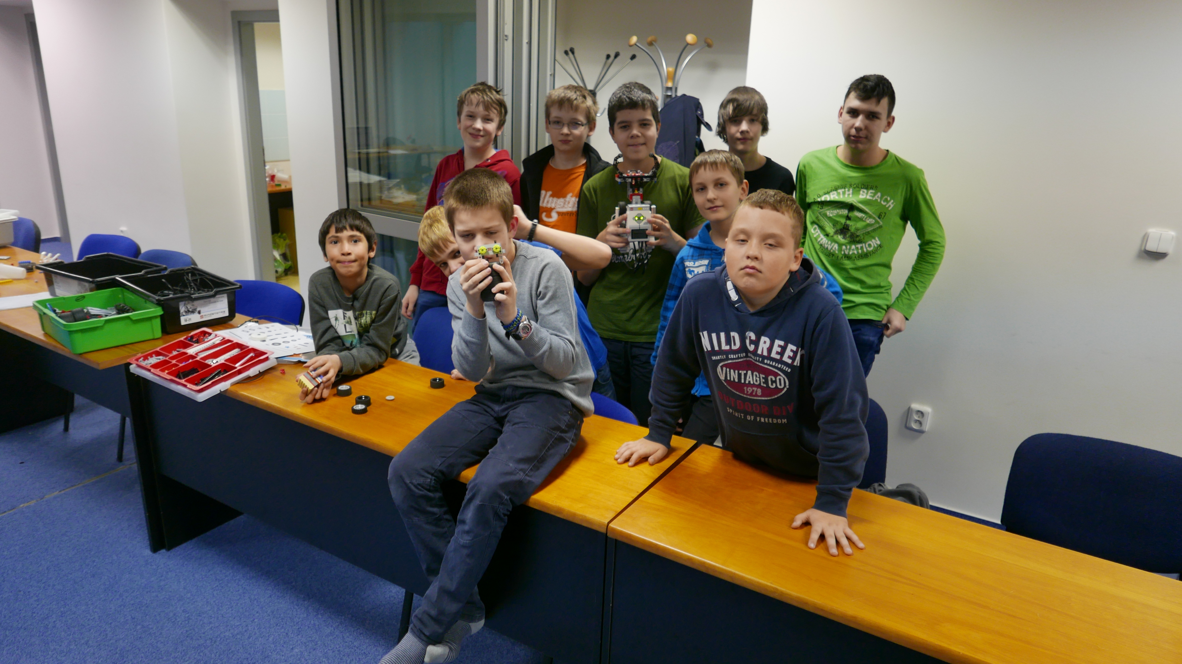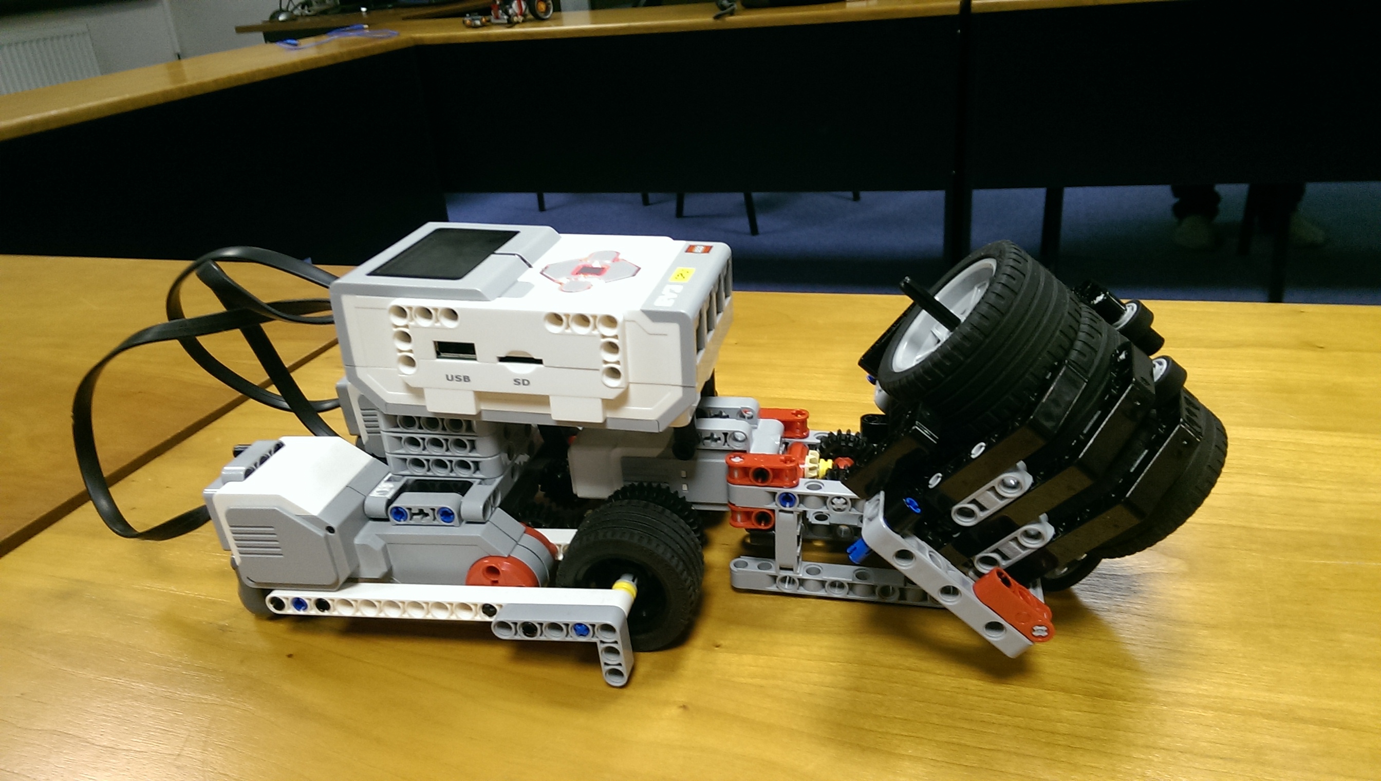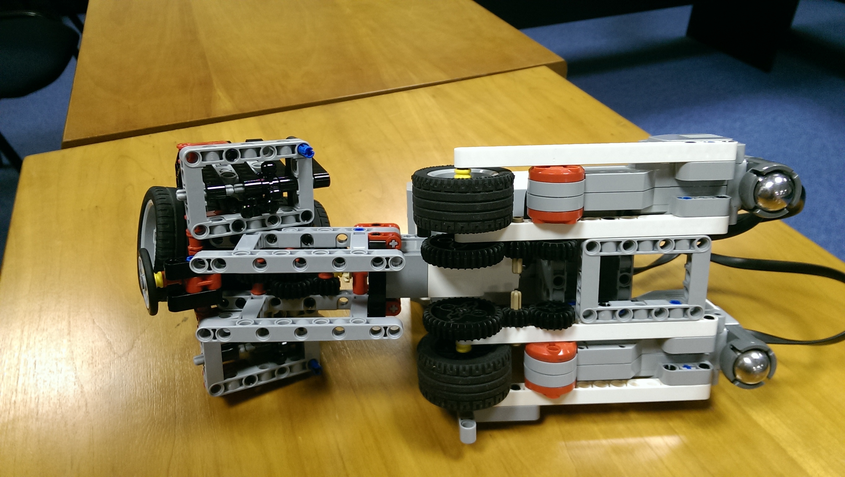 Robota sme skonštruovali s kolesami sprevodovanými tak, aby išli pomalšie a presnejšie, použili sme prevod 5:9. Zhodnotili sme, že by mohol byť ešte aj menej, aby bol ešte presnejší. Mimochodom, podvozok sme vytvorili podľa skvelej knižky od Joshihito Isogawa "The LEGO MINDSTORMS EV3 Idea Book", doporučujeme. :)