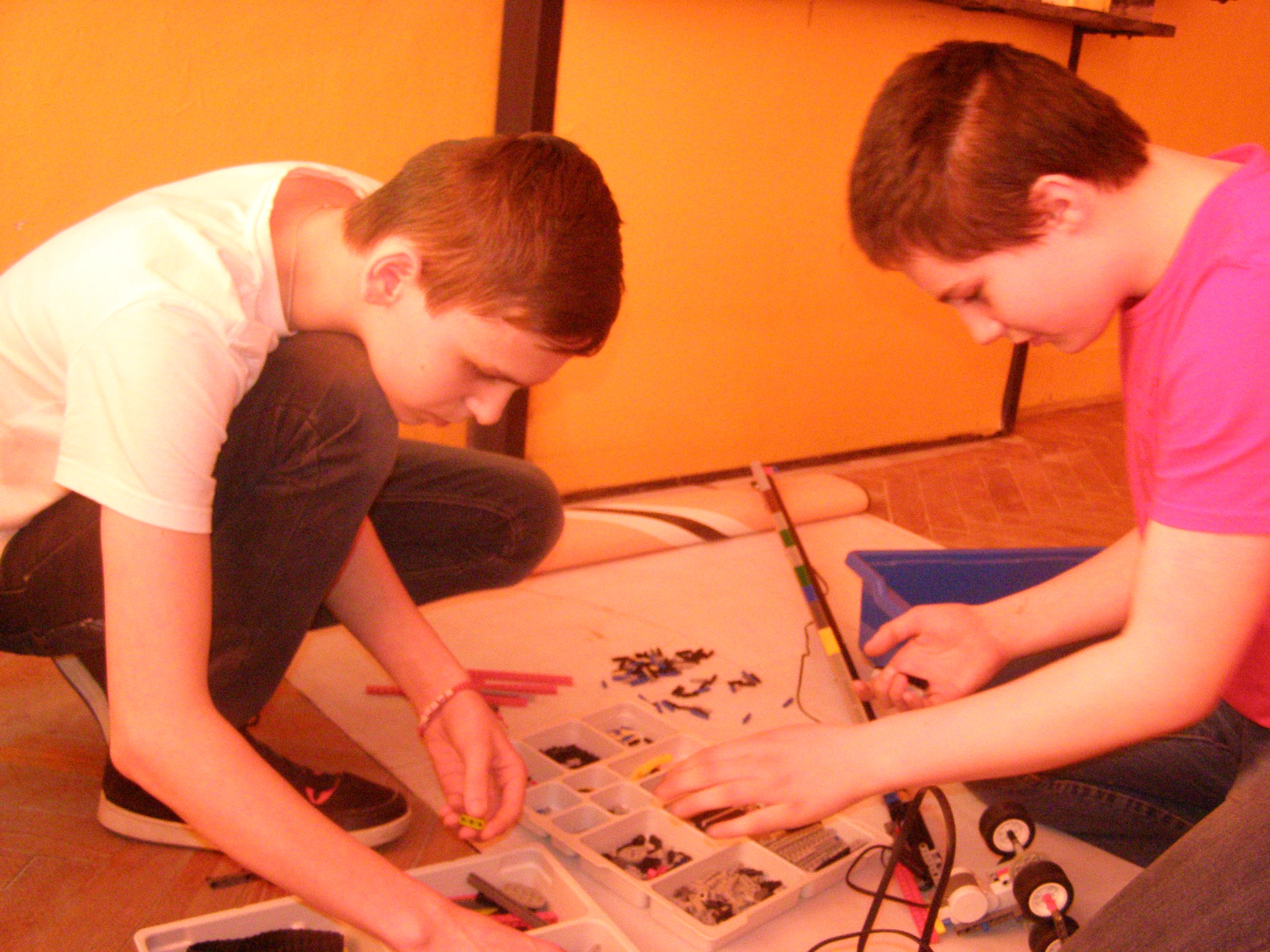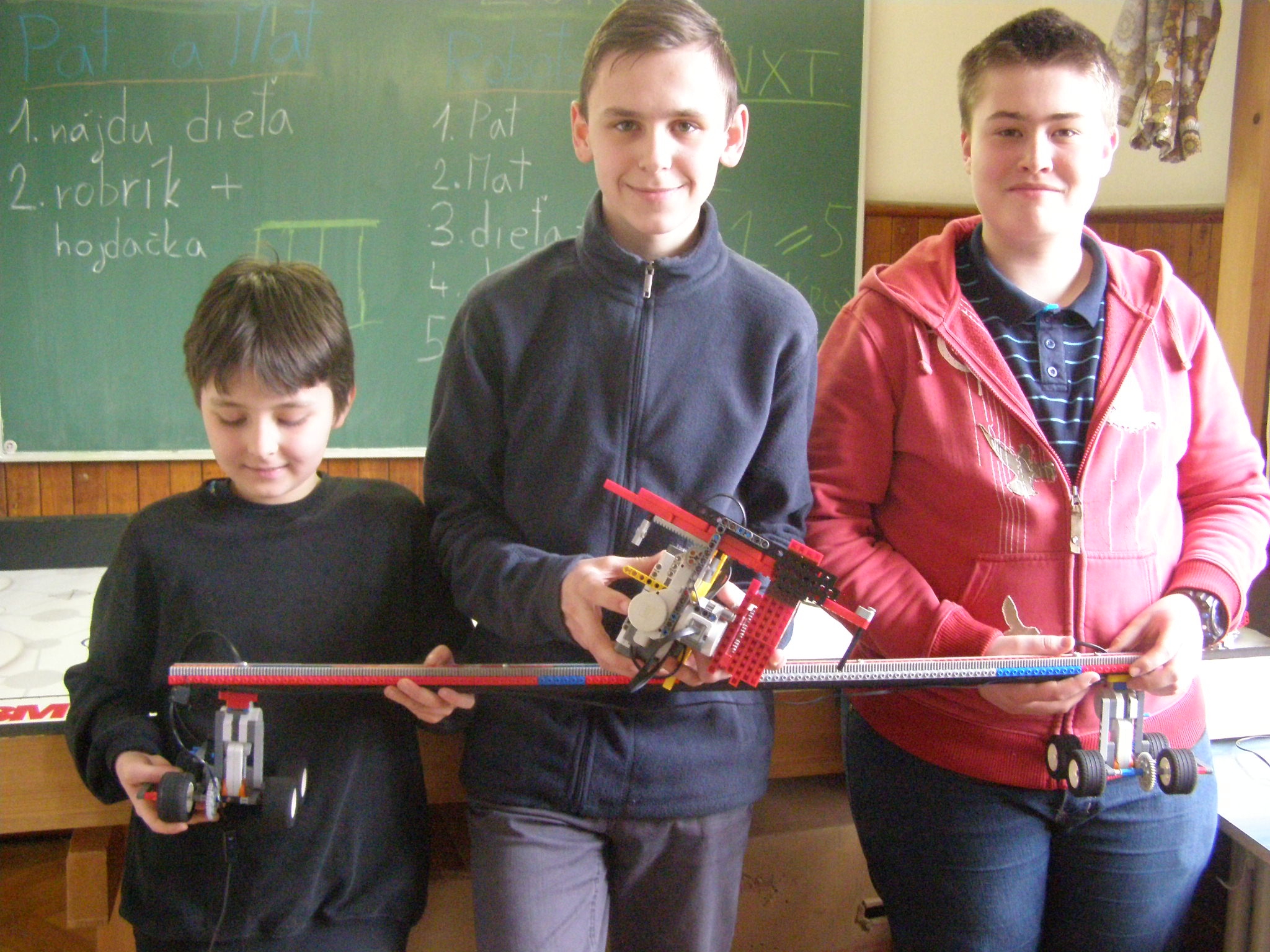 Výnimočný design robota s 2 kockami, pekný plynulý pohyb, ale výsledná pozícia Spocka bola posunutá o viac ako 1cm, v druhom prípade zasa nevidíme, na aké súradnice sa Spock dostal. Ak vidíme dobre, tak sa mostový žeriav v druhej osi nepohybuje? Skúšali ste prepojiť NXT-éčka cez BT? Aj tak pri konverzných káblikoch bude problém naladiť čas, lebo vzdialenosť sa bude výrazne meniť podľa toho ako je nabitá baterka. Panáčik trochu padá a niekedy sa ho nepodarí spoľahlivo vyložiť. Vaše riešenie je ale veľmi prínosné, lebo je iné ako ostatné, ďakujeme!