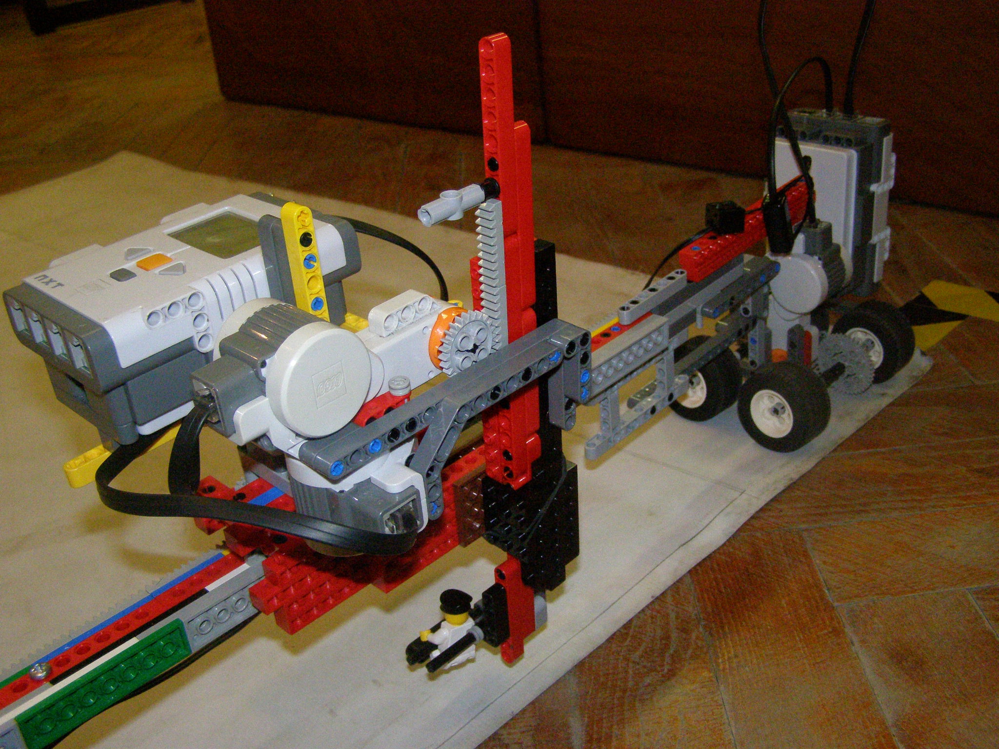 Presun panáčika riešime pomocou systému zloženého z dvoch NXT kociek komunikujúcich pomocou bluetooth a zo 4 motorov. Prvá NXT kocka je na kolesách a je spojená dlhou rampou s ďalším motorom na kolesách. Zabezpečuje presun panáčika v smere y. NXT kocka presúvajúca sa po rampe zabezpečuje presun panáčika v smere x a jeho zdvihnutie a položenie. Na tejto kocke sa na začiatku nastavuje tlačidlami Left button (desiatky) a Right button (jednotky) posun X a potom aj posun Y. Premenná Y sa odošle do druhej NXT kocky. Obe kocky potom zabezpečia potrebný presun vo svojom smere a druhá kocka opatrne položí panáčika.